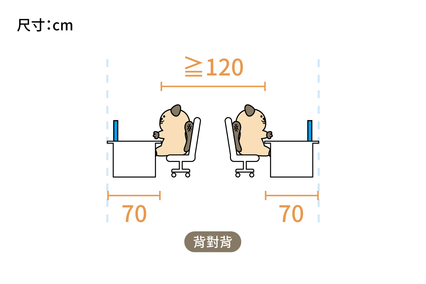背對背則是面朝牆,中間共用走道保留大於120公分,轉過頭就可跟背後的同事講話,但背後有人來往會稍微受到干擾。