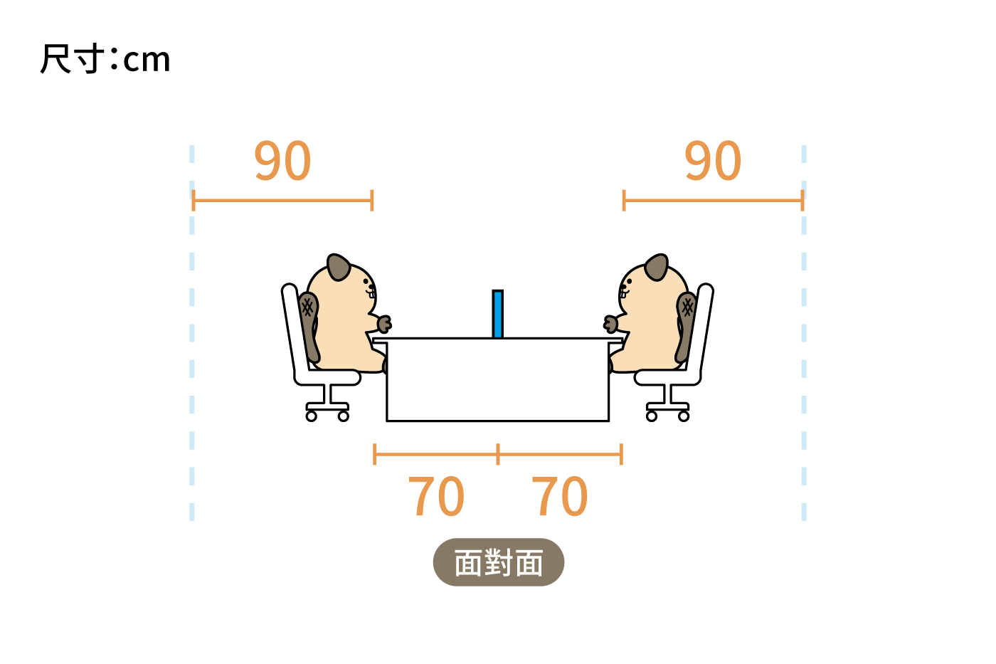 面對面的座位中間可共用隔屏,座位背後保留90公分的走道,但可能因為動作較大碰撞桌面干擾彼此。