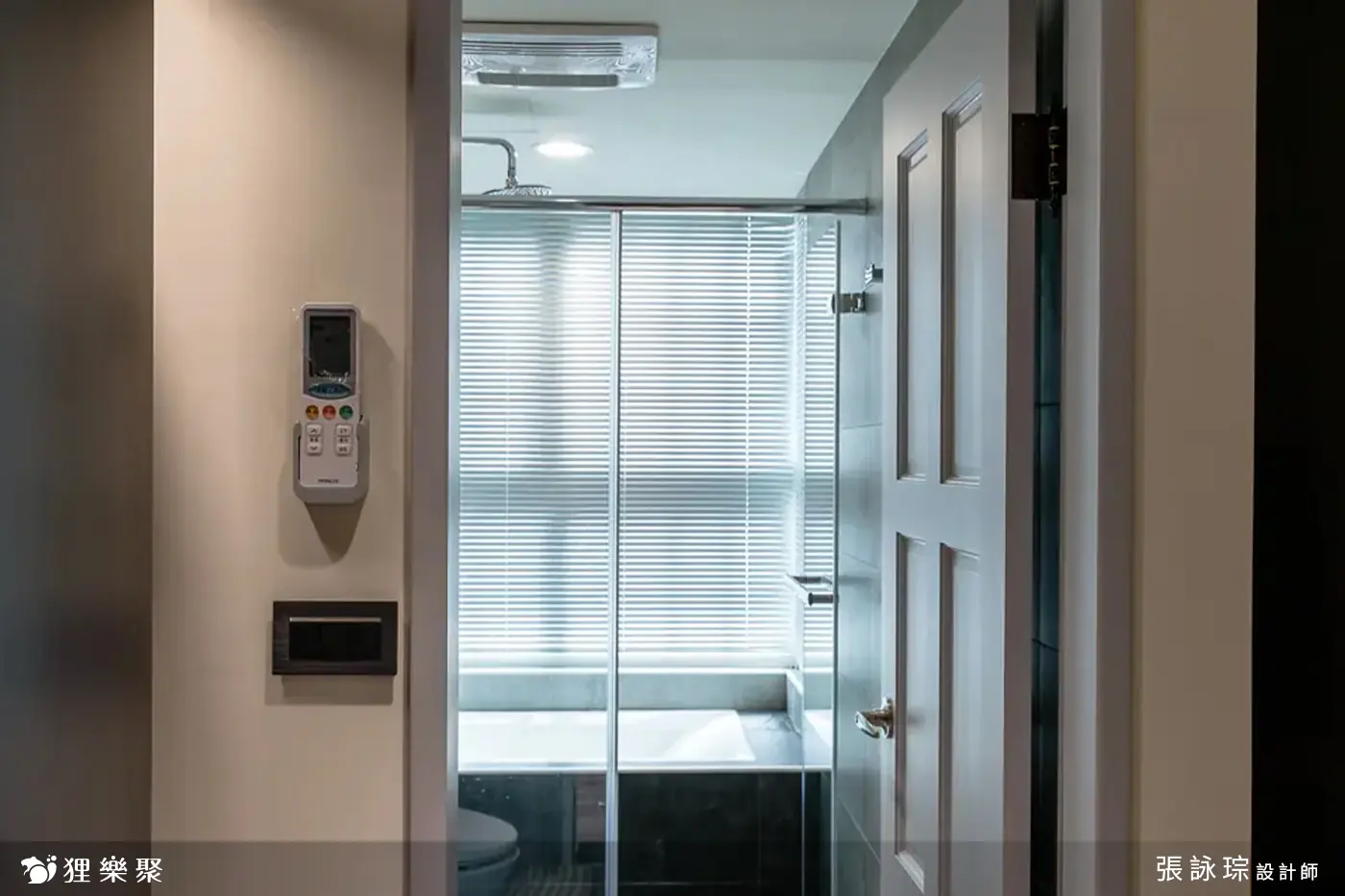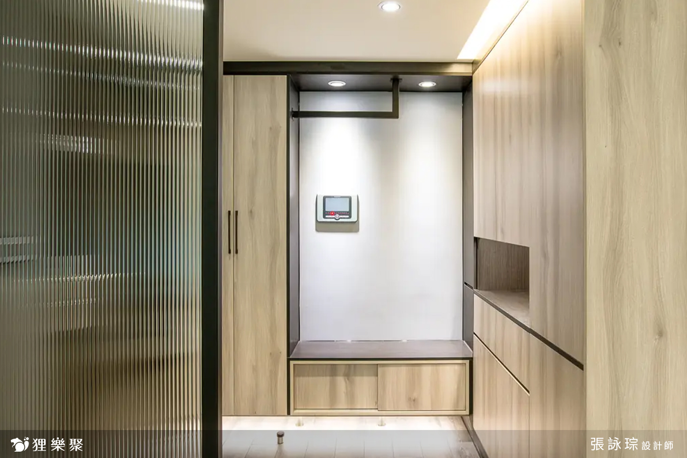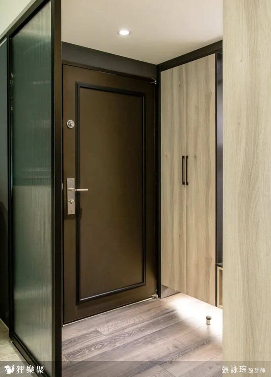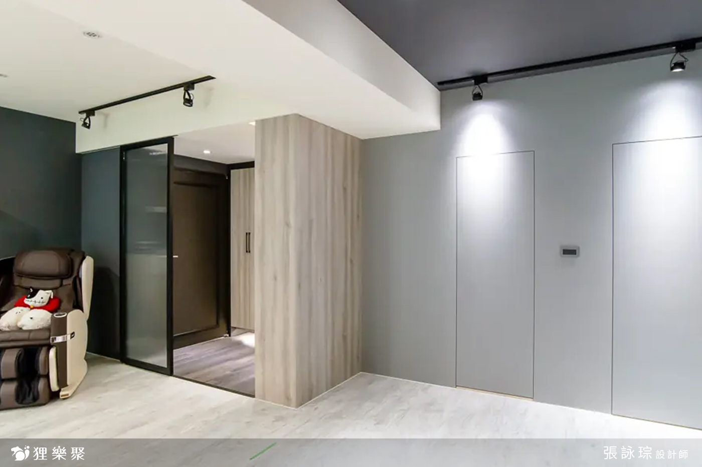 進門玄關處設置系統櫃,將長虹玻璃屏風、鞋櫃及雜物收納整合,讓屋主進出動線更加順暢。鋁框拉門採用長虹玻璃,兼具通透視覺與私密感。踏入玄關,即可感受到現代風與工業風交織的層次感,提供居家生活更多彈性。原有的小房間釋出空間給開放式客餐廳,寬敞的方正空間,搭配上具有俐落感的黑色軌道燈,以及QS白灰色系工業風格超耐磨地板,以深淺層疊增添空間層次。隱藏門結合壓克力烤漆,大大減少視覺上零碎的擁擠感,同時化解浴室正對著公領域中心的風水疑慮,襯上電視牆的視聽室設計,塑造出流暢的線條,打造一個適合休閒娛樂與家庭聚會的高機能理想視聽宅。