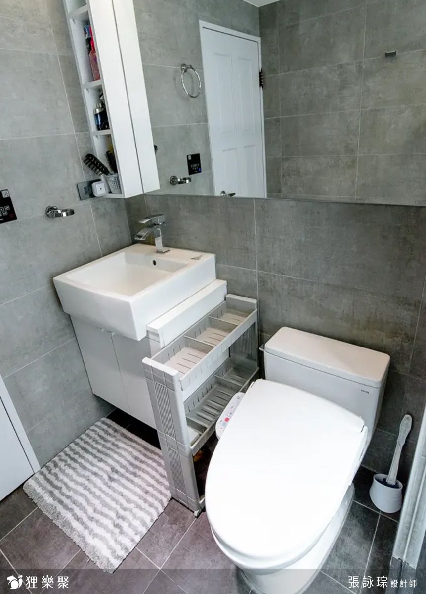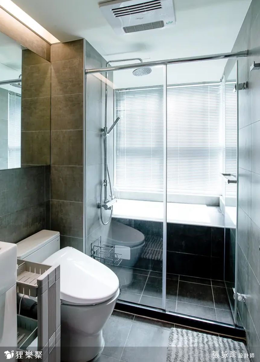 主臥延續整體風格,以暖木紋灰調系統櫃搭配鋁框門收納,讓衣物好拿好找,既是機能宅及視聽宅的延伸,也展現出現代工業的時尚感,收納與美感兼具,營造寧靜安穩的休憩氛圍。衛浴空間選用清水模磚鋪設,化繁為簡,呼應全室工業風主題。簡約線條打造實用收納設計,讓衛浴空間既精緻又充滿機能,是實用視聽宅不可或缺的一環。