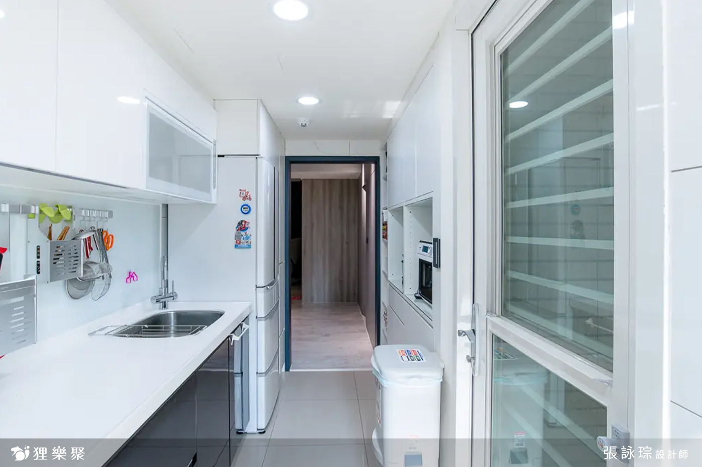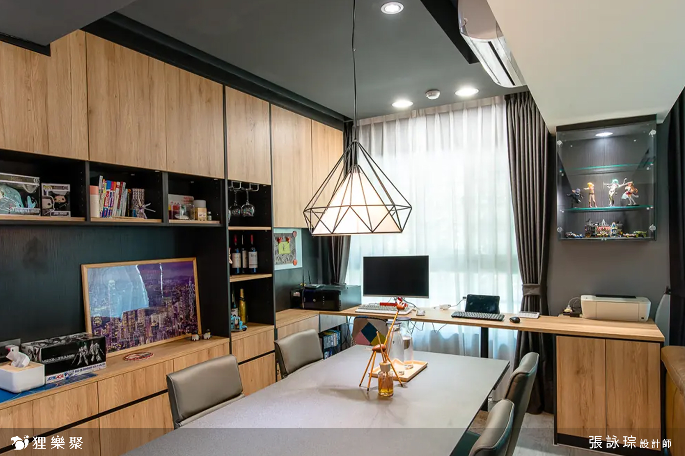 餐廳與客廳、工作區、遊戲區相鄰,整體以黑灰與木紋交錯呈現,並設有工業風格木紋備餐系統櫃,可靈活收納日常小物與餐具,也可依照心情調整陳列收藏,搭配餐桌的造型吊燈,為餐廳增添趣味性。窗邊規劃了工作區,讓屋主在工作之餘,也能與家人舒適談天,營造出溫馨且實用的工業風機能宅。廚房採白色系為主,搭配雙面系統櫃,大幅提升收納機能與便利實用性,明亮清爽的調性使料理動線更為順暢,不但美觀實用也易於清潔,貫徹機能宅美感與機能並重的設計精神。