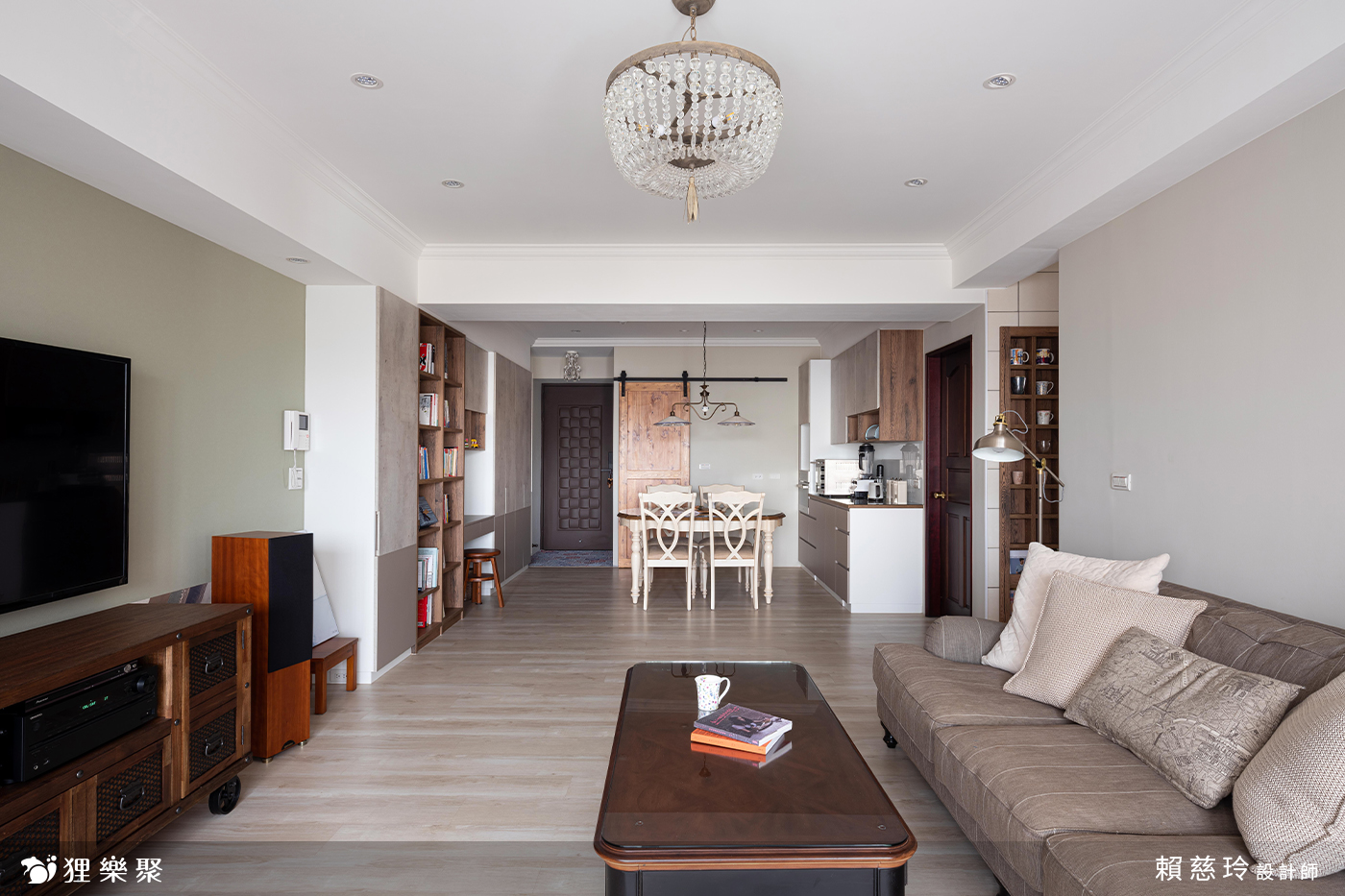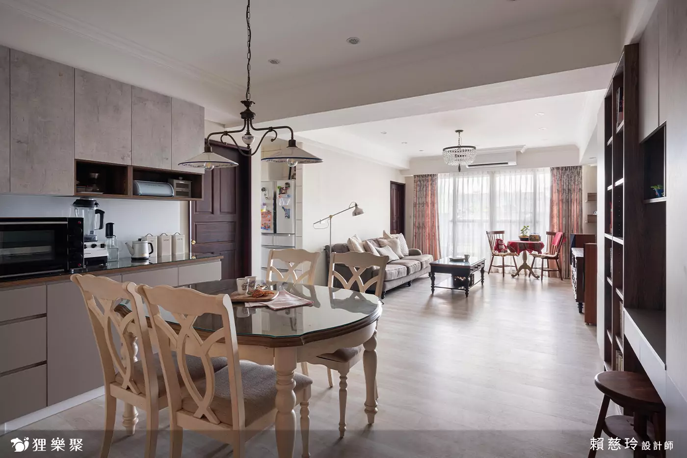 業主是一對重視生活感的夫妻,在家裡大多數的時間都一起待在公共區域,所以這次的設計重點在客餐廳的部分。他們嚮往美劇中家人朋友待在沙發上一起聊天、看電視、嗑洋芋片的溫馨畫面,人與人的互動交流是他們所重視的,討論之後決定主要裝潢選用美式風格,其中再加入一些業主喜歡的工業風元素,打造出溫馨中帶有一點個性的家。