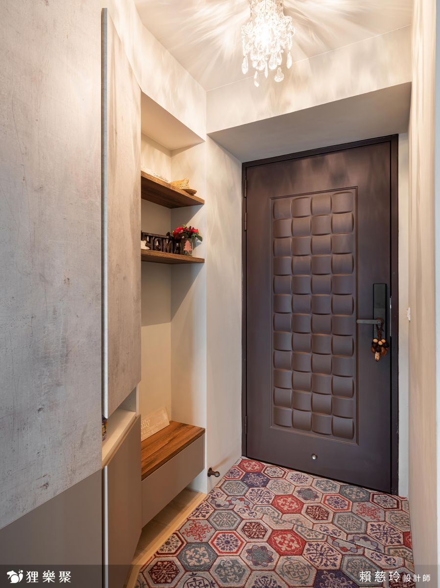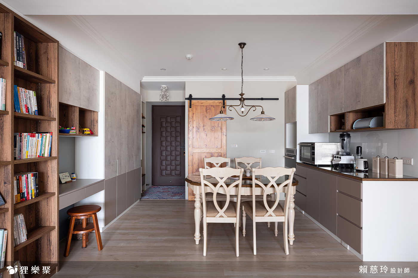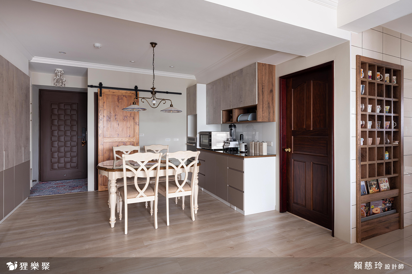在餐廳旁的系統櫃深度做成與樑齊平來修飾空間,讓人感覺不出樑的存在,櫃門使用帶有斑駁感的灰色板材,雖然同樣展現出復古的味道,卻是屬於工業風的氛圍,交織出混搭的新風味。另外,具有工業風的穀倉門既作為廚房的拉門、更融入了餐廳背景牆作為搶眼的重點裝飾,一門二用。