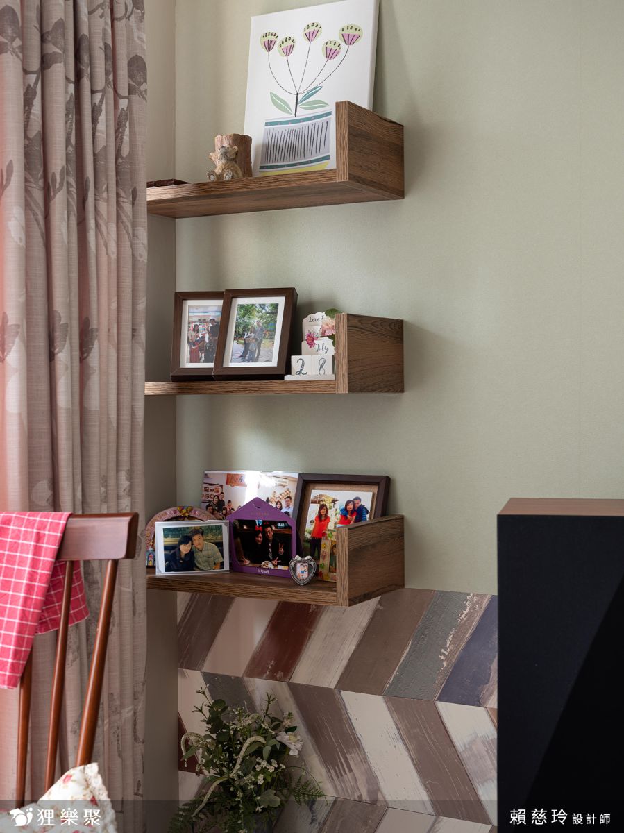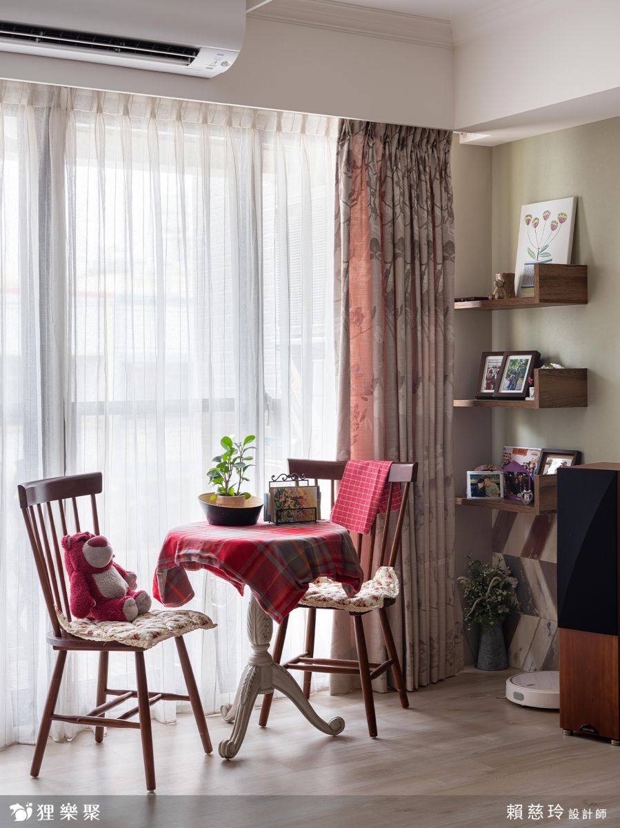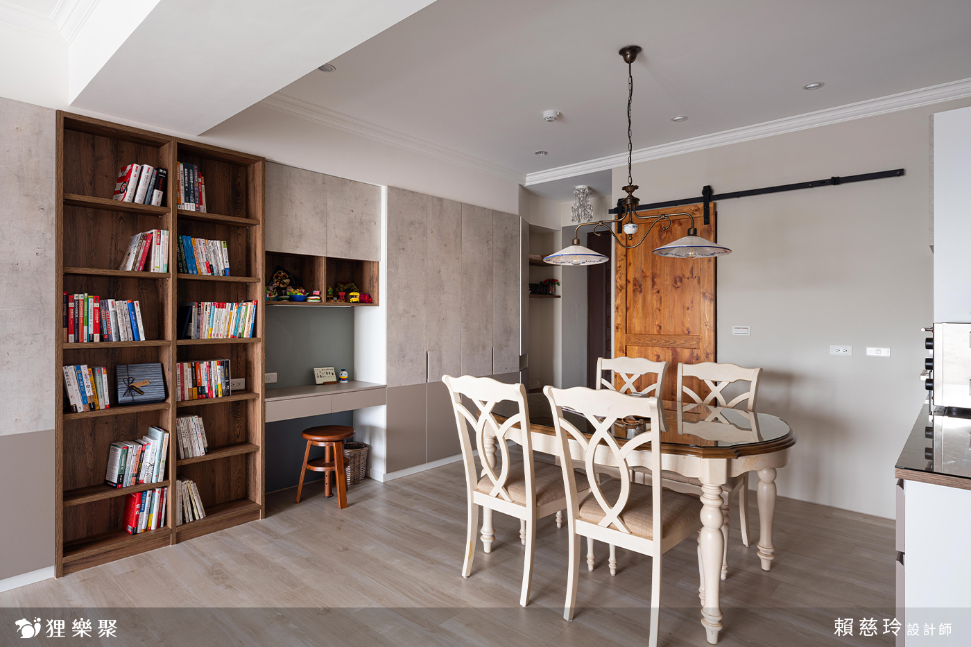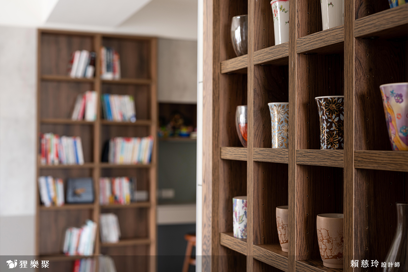 在客餐廳的部分使用了木質地板來營造溫馨的感受,相較地坪的淺色系,另外選擇深色木頭的書櫃及展示架,增添了沉穩的感覺。