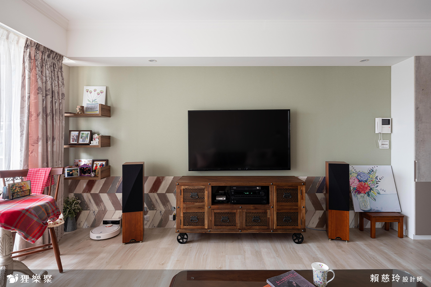 電視櫃選用美式風格強烈的實木抽屜櫃,櫃體呈現出材質本身自然的紋路,作舊的五金更增添了復古情懷,復古的物件更容易展現生活感。另外在主牆面漆上了跳色設計,下半部使用各色木材拼接而成,獨特的個人風格油然而生。
