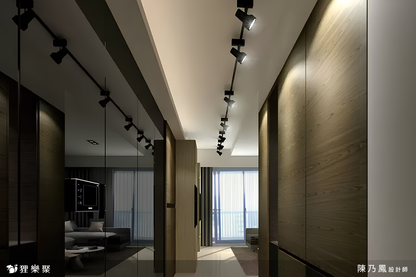 進門後右方規劃了鞋櫃和玄關櫃,狹窄的走廊造成不少壓迫感,所以設計師利用整面牆的黑鏡擴大視覺感,並加上軌道燈具照射在櫃體,透過黑鏡隱約地反射,更讓長廊增添了些許藝術感,一踏進家門就是一場視覺盛宴。