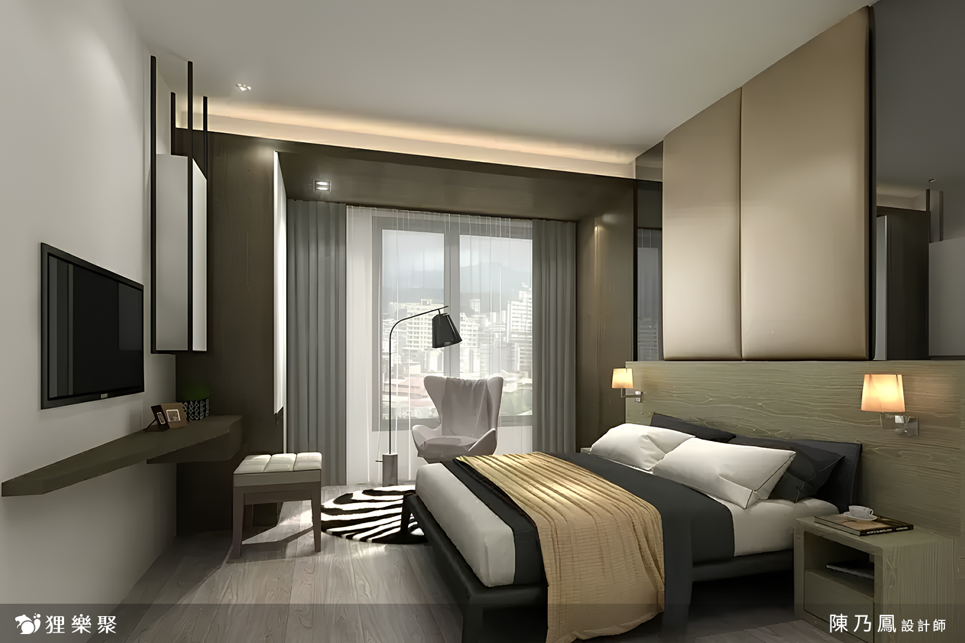 現代風格常用投射燈具來營造氣氛,在玄關和客廳都能看到它們的蹤影,在主臥則設計了柔和的間接照明和床頭溫暖的黃光壁燈,打造適合休憩的空間。整體色調以深色調的木紋色和黑色做搭配,並加入玻璃、鐵件等材質,營造出沉穩而有質感的氛圍,居家空間同樣能夠擁有低調的奢華感。