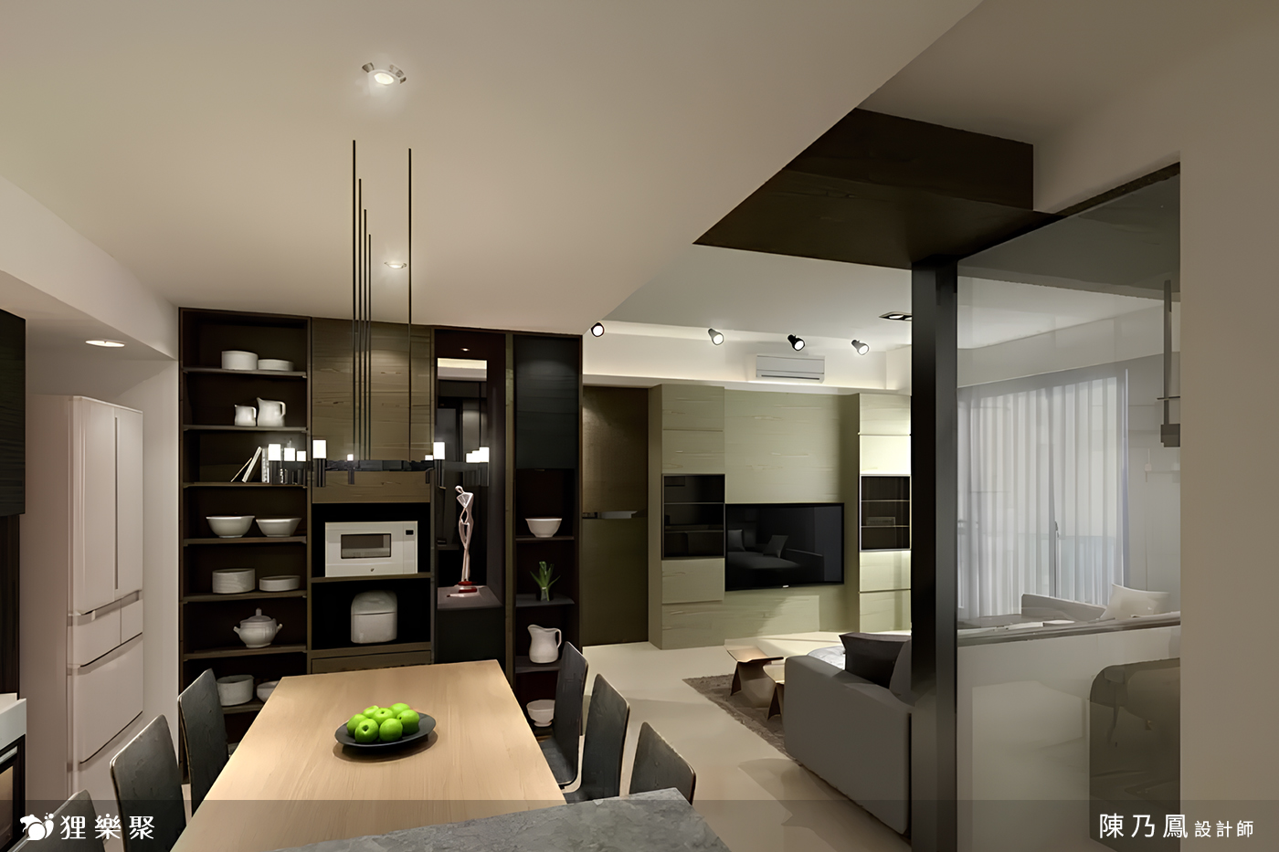 屋主喜歡俐落大氣的現代風,設計師利用燈具、黑鏡以及暗色系的材質來打造,讓屋子透出隱約的奢華感。此次規劃重點在於狹小的書房設計,要讓空間功能與美觀並具;另外,由於屋主有大量的器皿收藏,除了一般家庭會有的展示及收納空間外,在餐桌旁另外需要規劃展示櫃兼電器櫃,方便屋主使用。