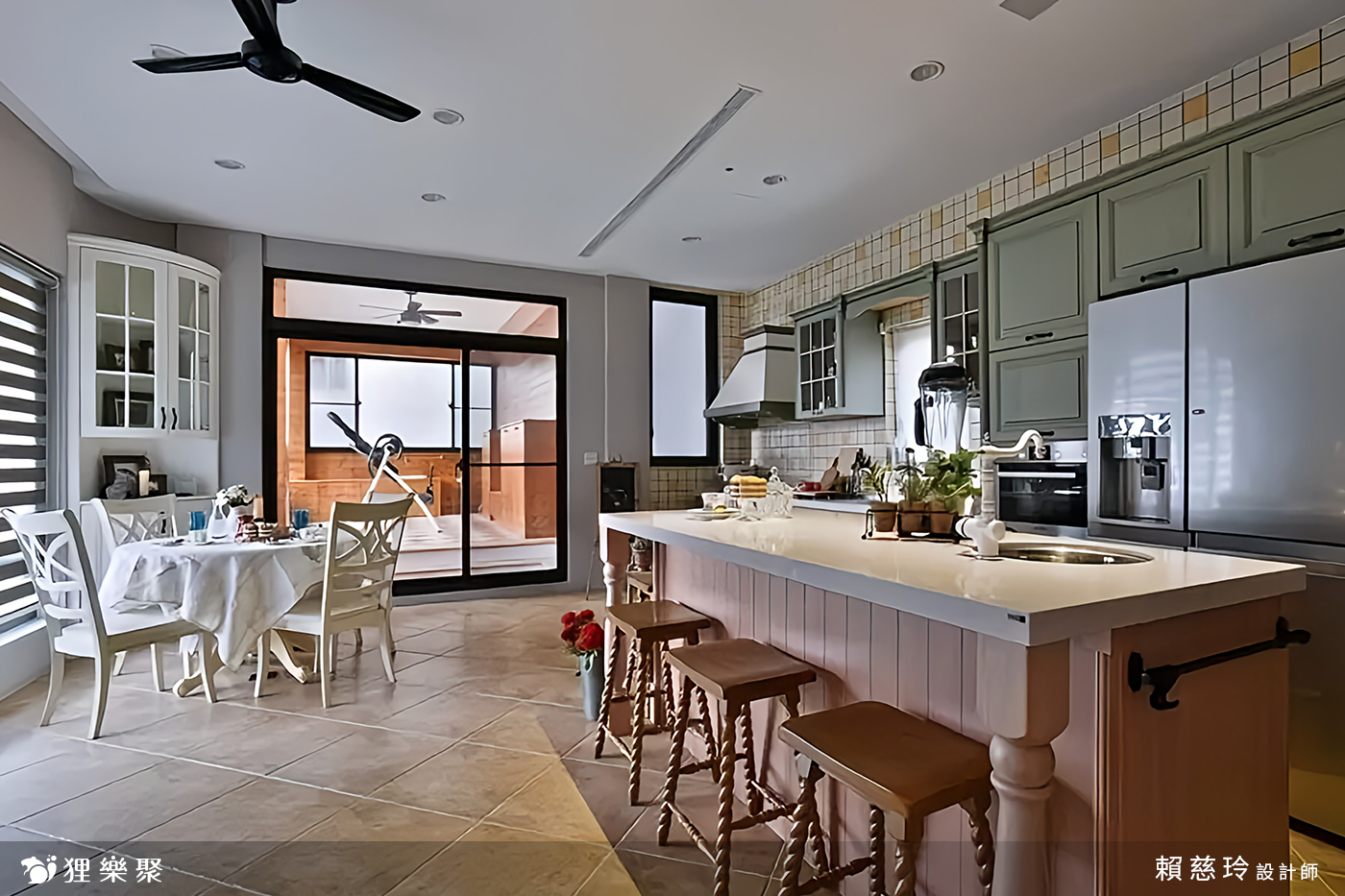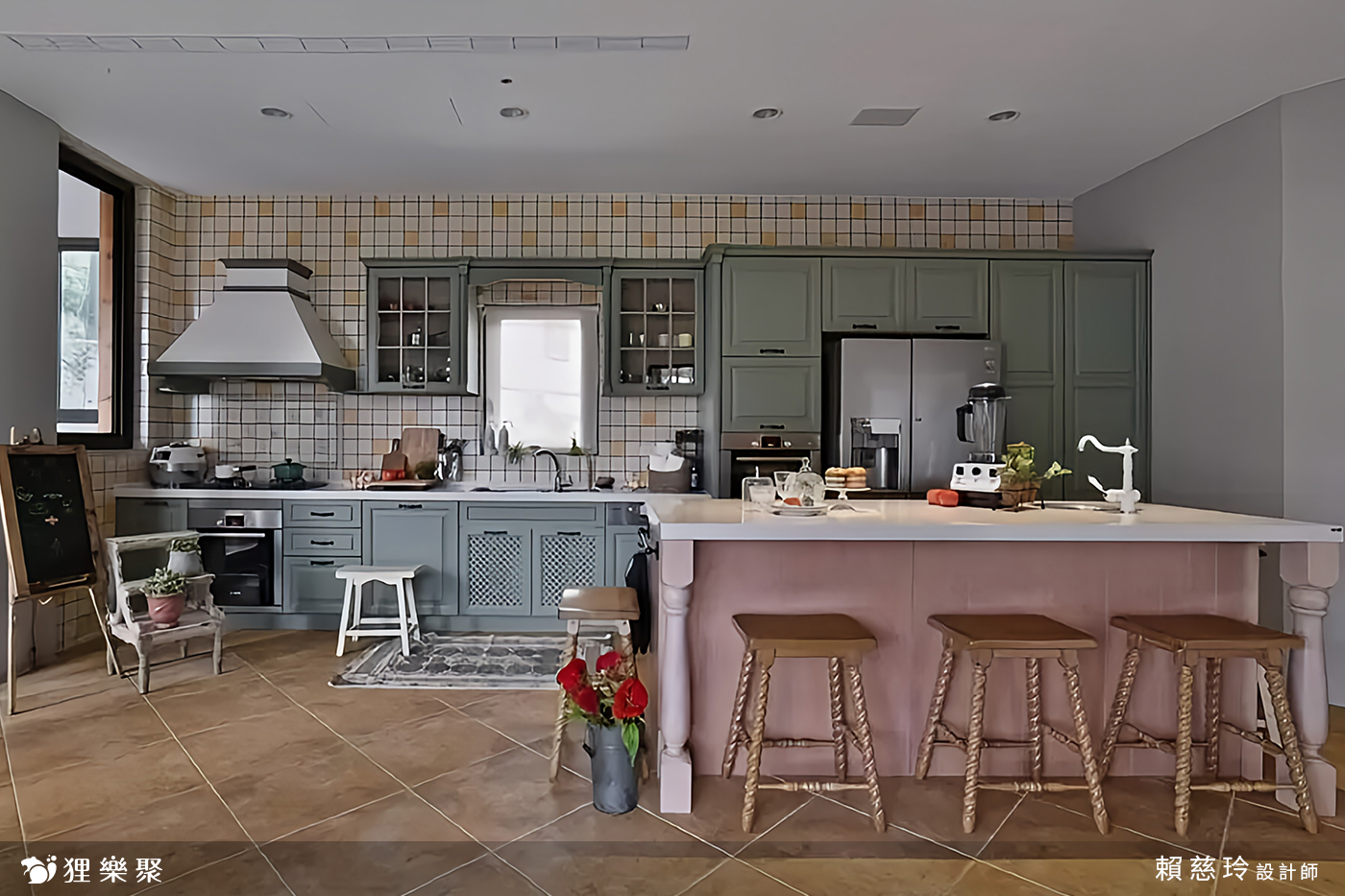 廚櫃的設計是展現鄉村風很重要的部分,在顏色上選擇淡雅的淺綠,搭配線板型的門片以及復古的五金把手,鄉村風的特點立刻呼之欲出。廚房和餐廳設置在同一個空間,煮飯不再只是一件日常任務,更是能和家人朋友一起進行的樂事,而開放式的廚房也能減輕複雜的線條帶來的凌亂感。餐桌則刷上淡粉色的漆,和淺綠的廚櫃相映成趣,讓整個空間顯得活潑又溫馨。