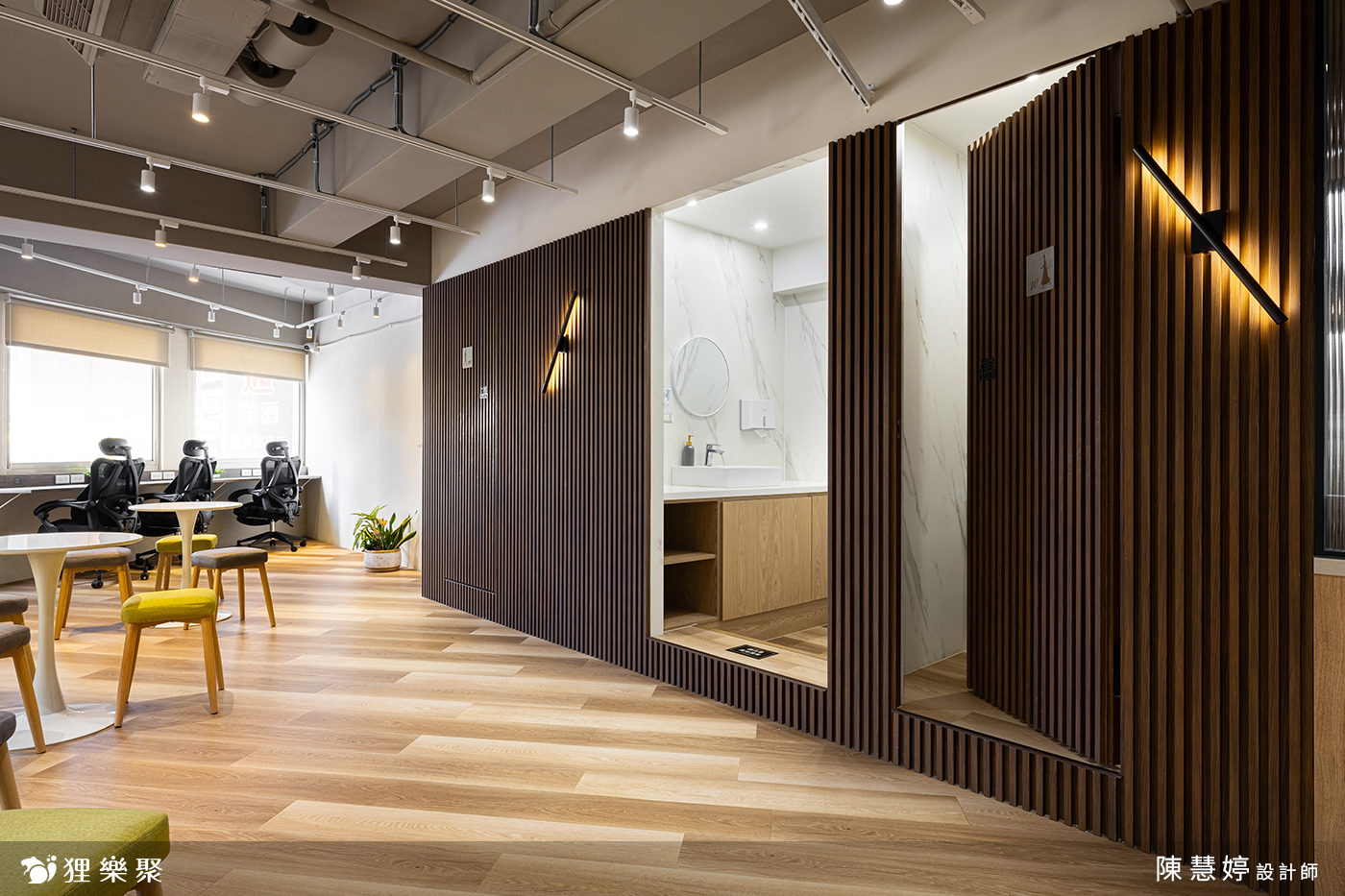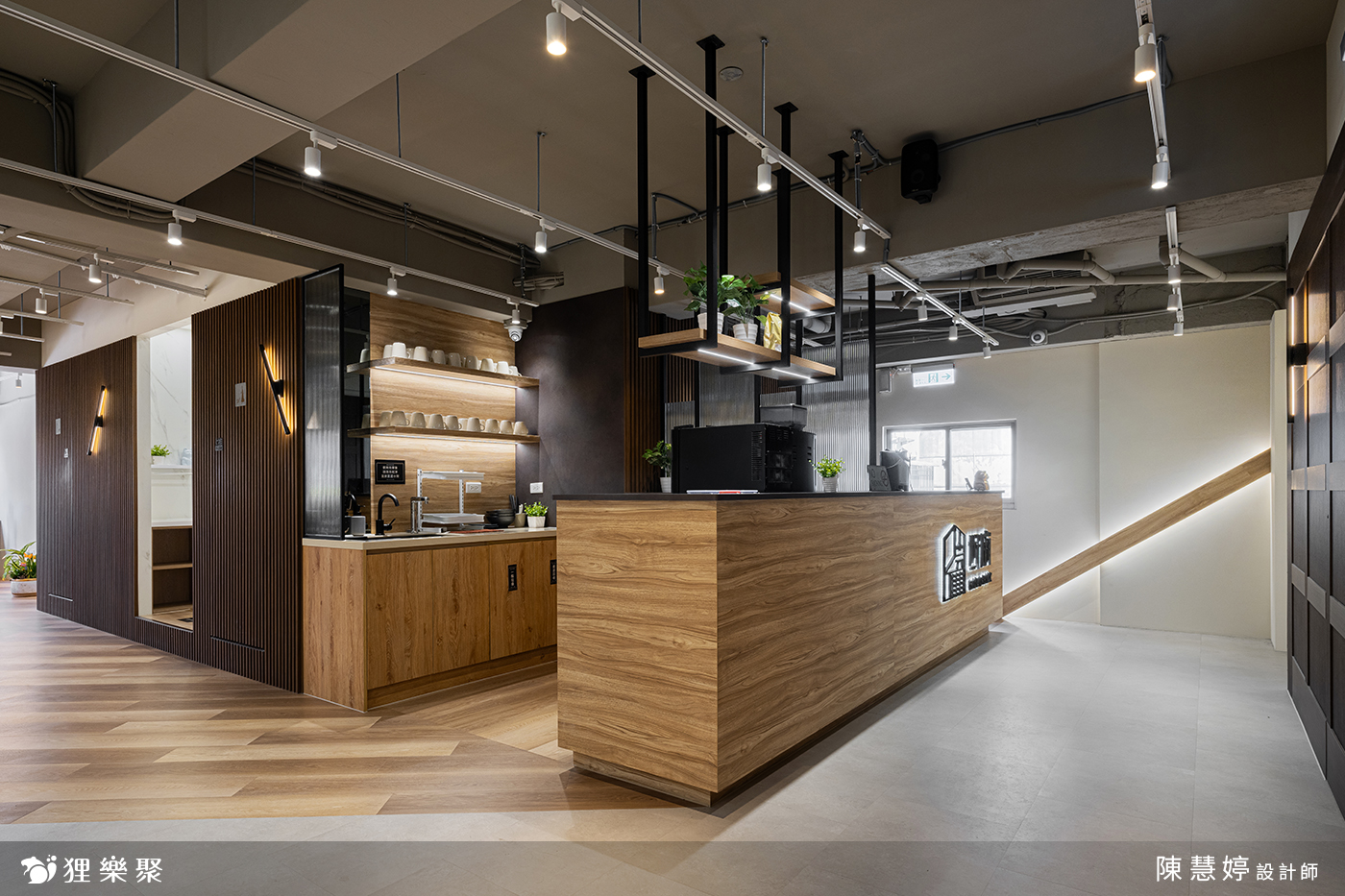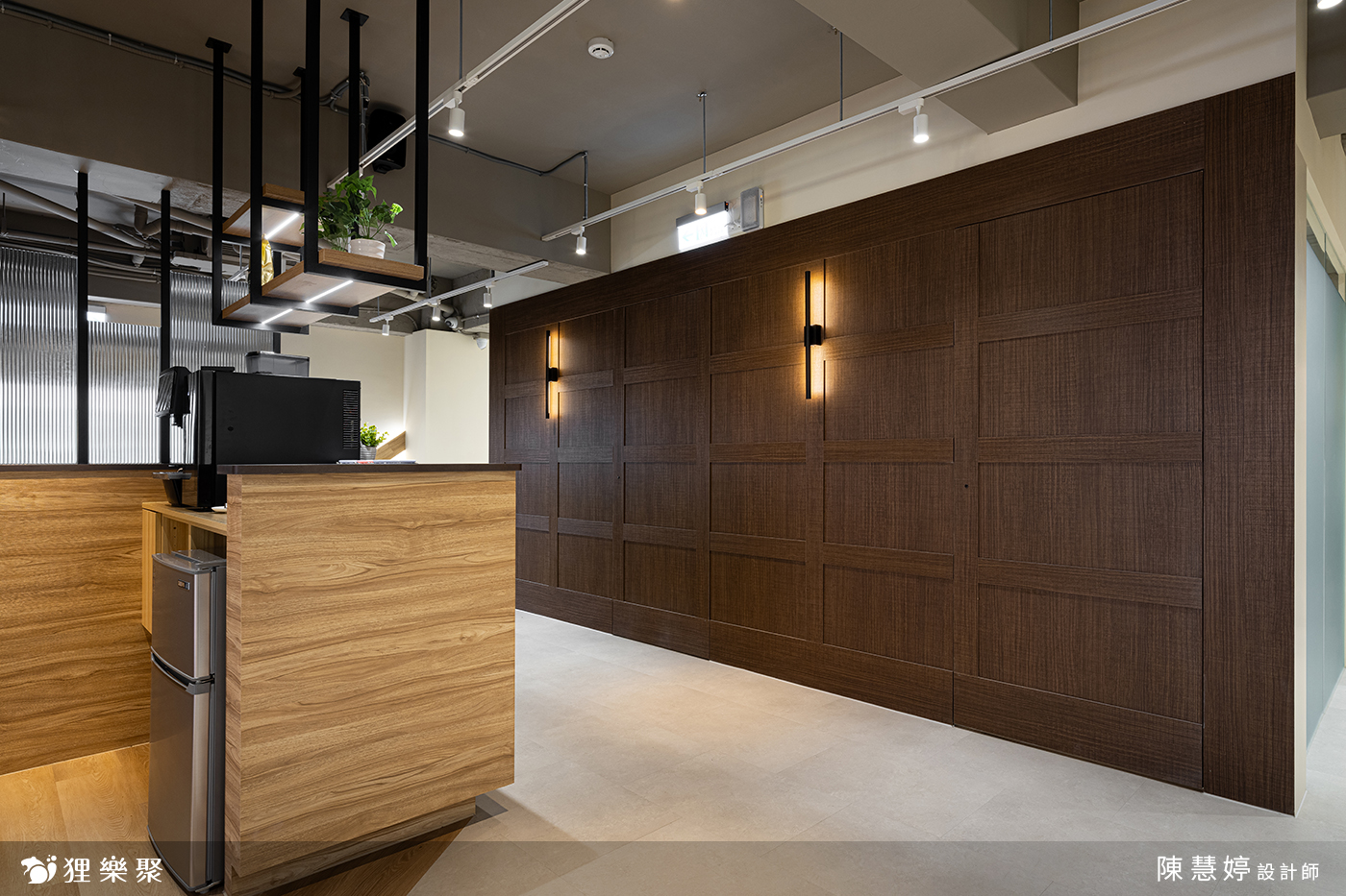 走進這間共享辦公室,即可看到運用了木材質與鐵件結合的櫃台設計,讓人感到溫暖愉悅。搭配後方深木紋格柵、軌道燈設計,使空間低調沉穩,展現出專業的辦公室氛圍,結合能自由使用的茶水間等公共區域,不僅增添視覺上的舒適感,也讓使用此共享空間的人們感到舒適自在。