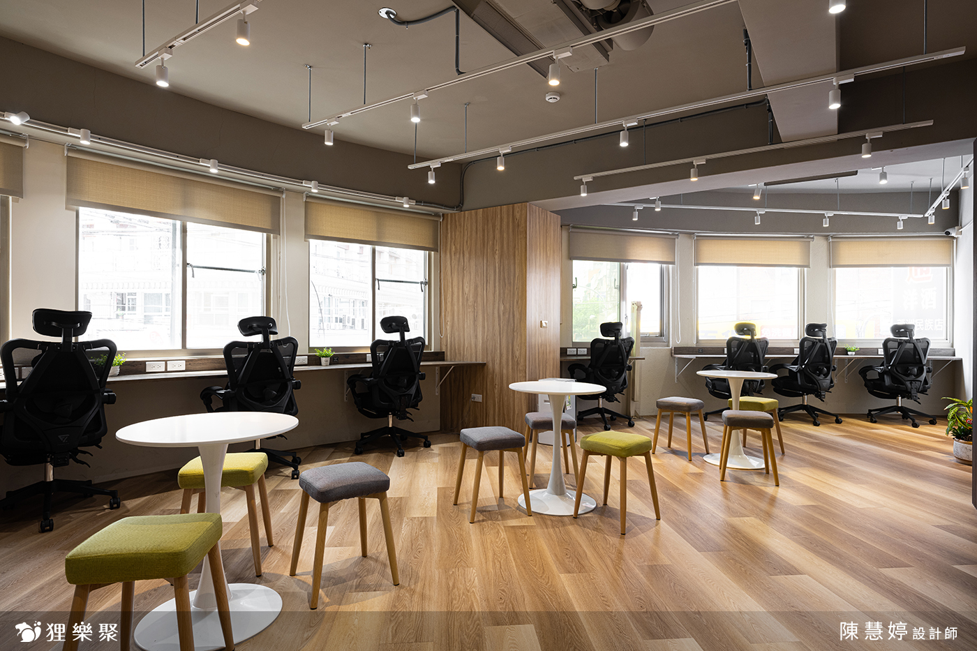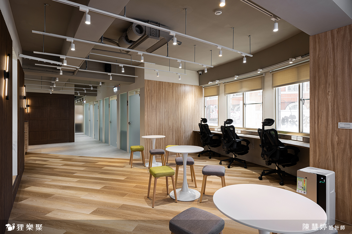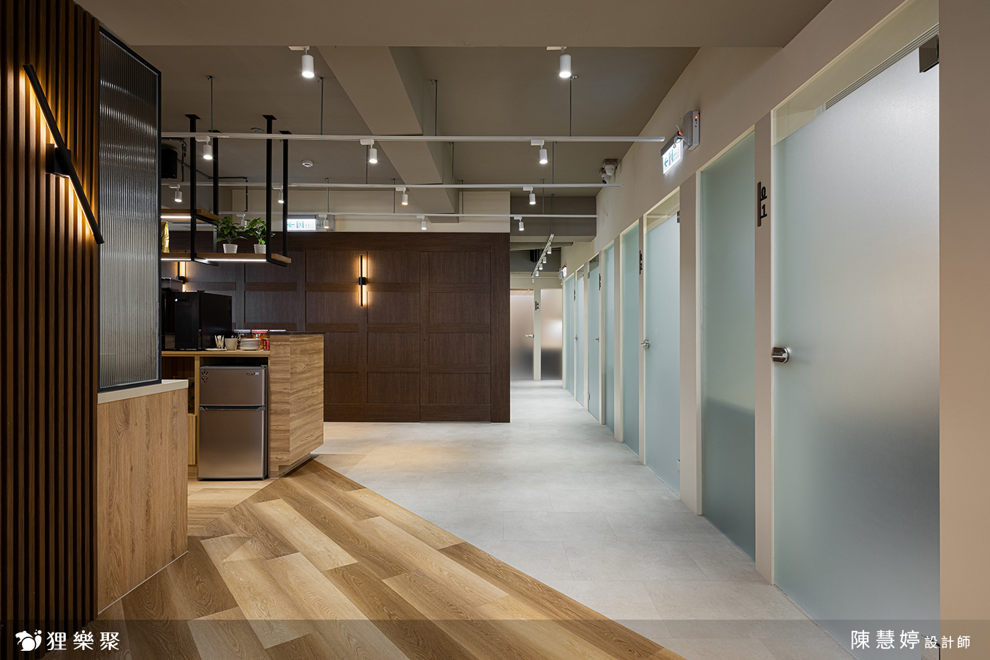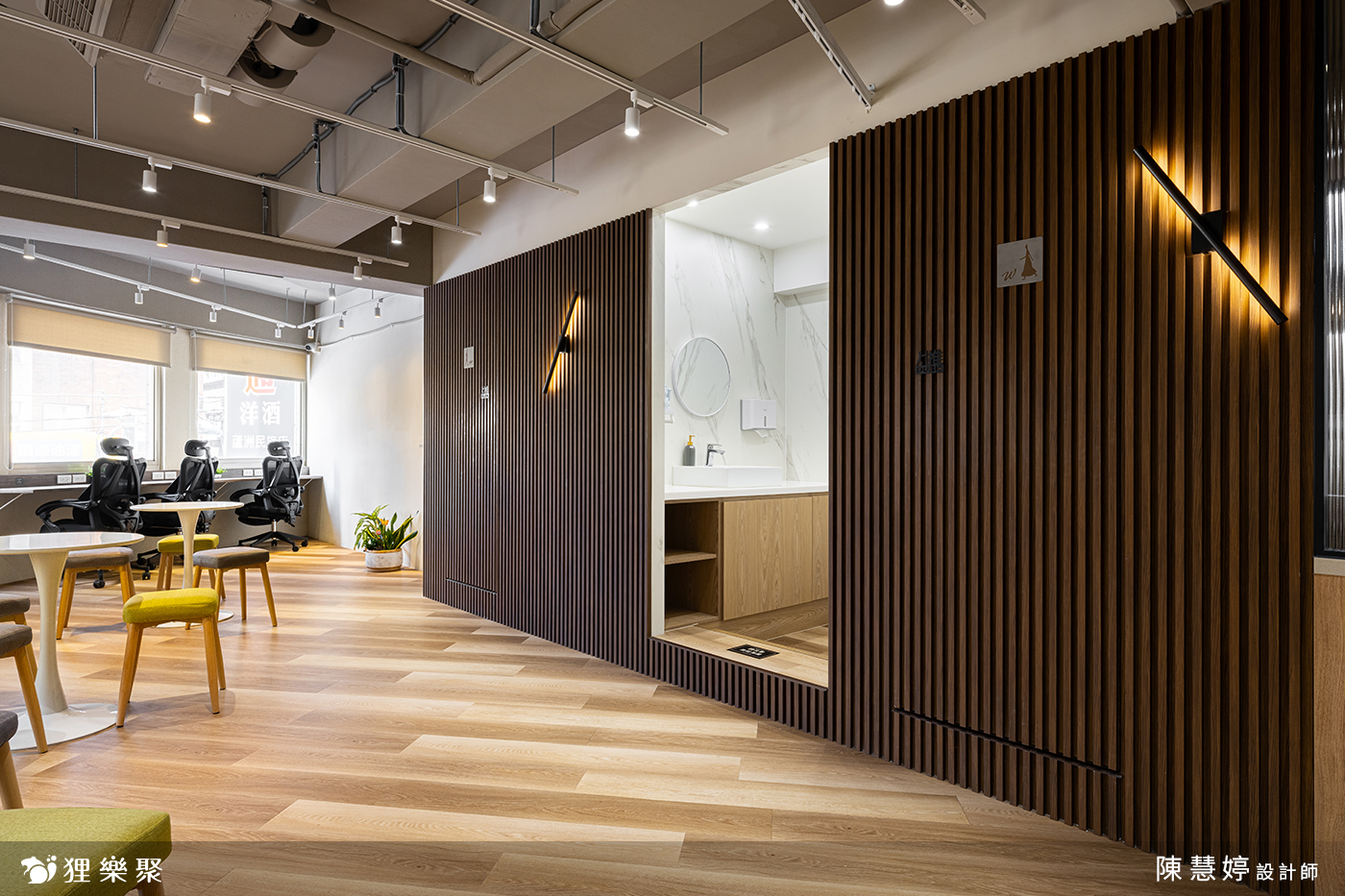 走進這間共享辦公室,即可看到運用了木材質與鐵件結合的櫃台設計,讓人感到溫暖愉悅。搭配後方深木紋格柵、軌道燈設計,使空間低調沉穩,展現出專業的辦公室氛圍,結合能自由使用的茶水間等公共區域,不僅增添視覺上的舒適感,也讓使用此共享空間的人們感到舒適自在。