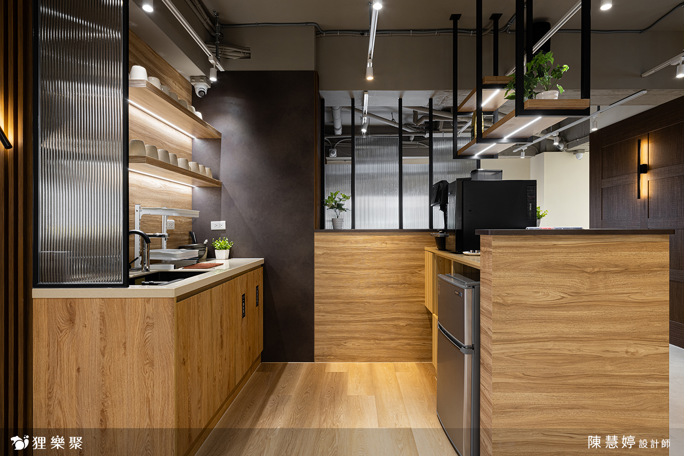 茶水間規劃了簡約的木質吧台、洗手台,搭配方便擺放杯具的開放式層架與長虹玻璃,完美結合展示儲物機能與美感,讓來使用共享辦公室的人都能在此短暫休憩或交流。鐵件吊架懸掛著綠植,為整體增自然氣息,搭配復古的深色造型牆面,營造出視覺上的層次感,打造出充滿個性又實用的放鬆空間。