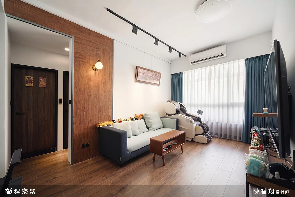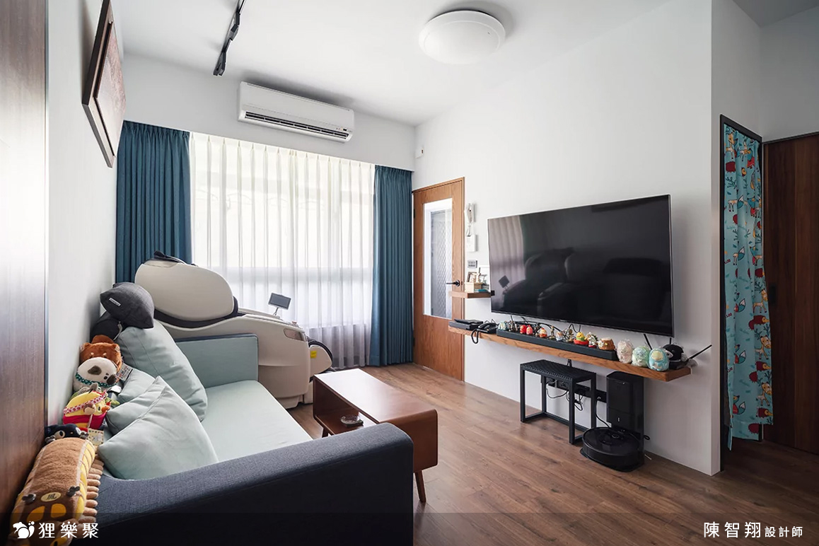 空間的基調先以沉穩的深色木地板打底,帶來視覺上的溫度,茶几、窗簾、浴櫃等等也都選擇了飽和色系,再加上復古的家具造型及花磚設計,營造出沉靜的氛圍。