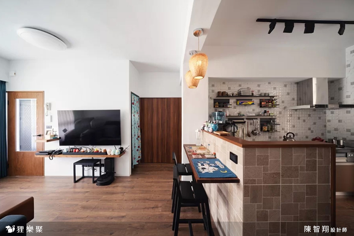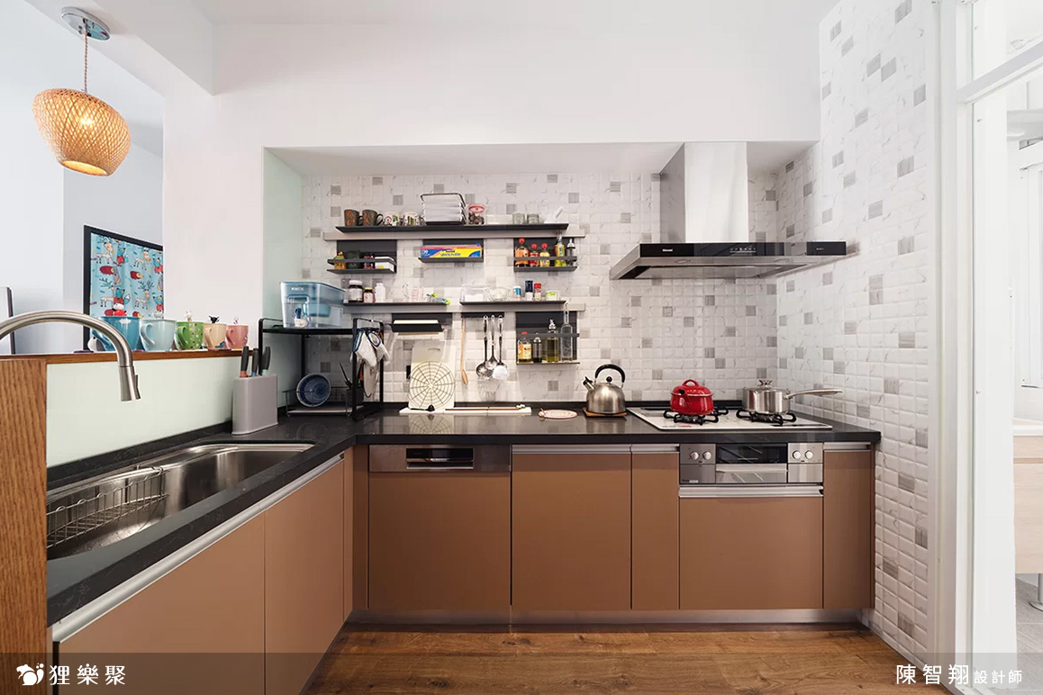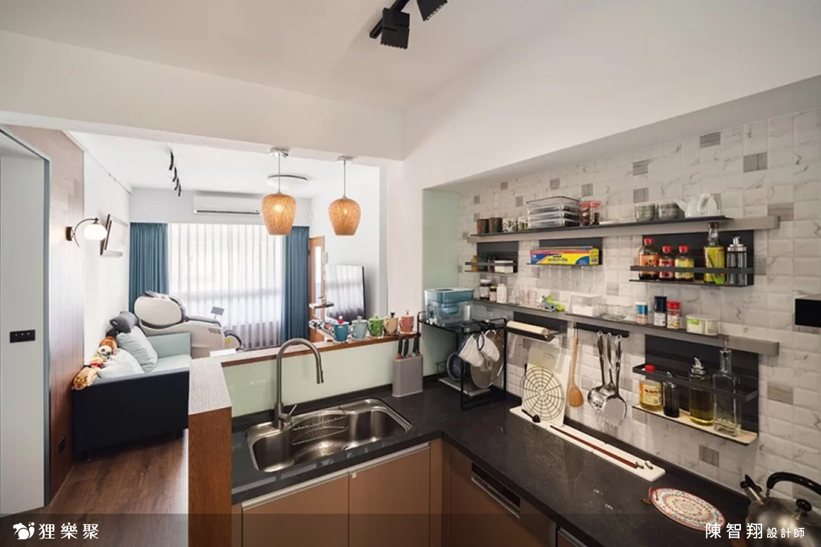 許多人喜歡開放式的廚房,對於小坪數的房子來說,少了隔間牆讓空間感覺更大了,開放式廚房設計和家庭成員的互動性也更加良好,這個案例中的開放式廚房將流理台做成L型,水槽前則利用半牆加高,可以稍微擋住廚房的雜亂,半牆的另一面則結合小小的吧檯,是個相當多用途的場域。