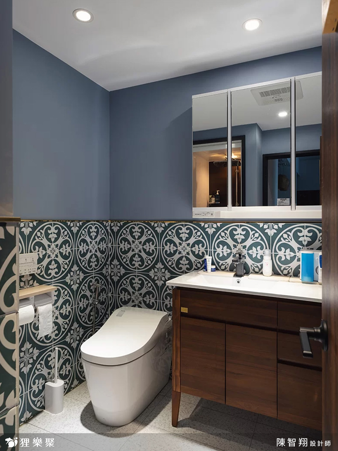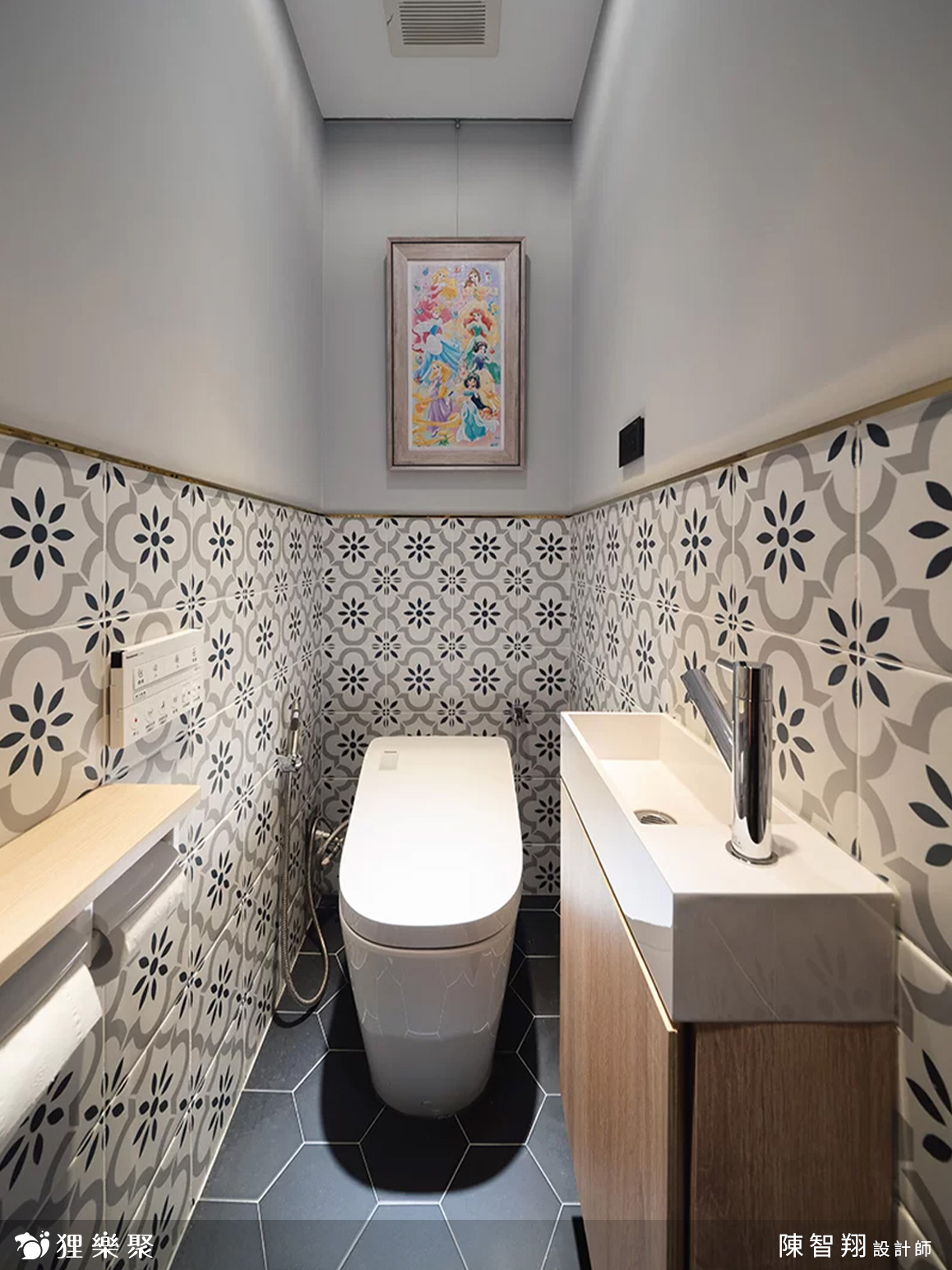 從廚房到衛浴都可以看見滿滿的花磚元素,在不同空間利用不同的花磚設計來營造空間的獨有風格,並輔以同色系油漆,讓空間的整體性更強,再掛上一幅畫,彷彿置身美式餐酒館的廁所一般。燈具的部分以吸頂燈、軌道燈為主,再輔以吊燈和壁燈,不僅有著區分場域的作用,也營造出溫馨的居家氛圍,是個典雅中帶著可愛的美式風設計小宅。