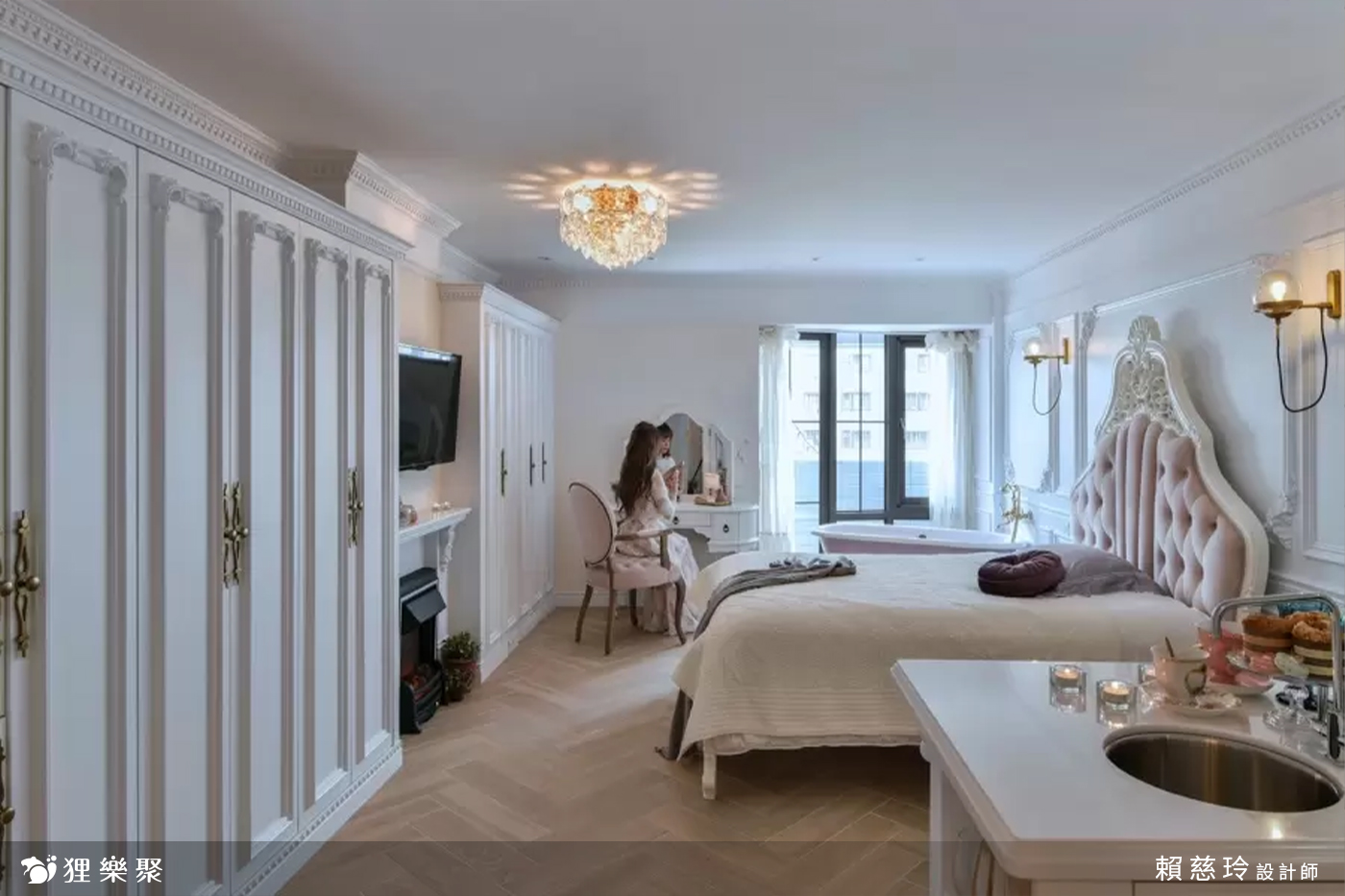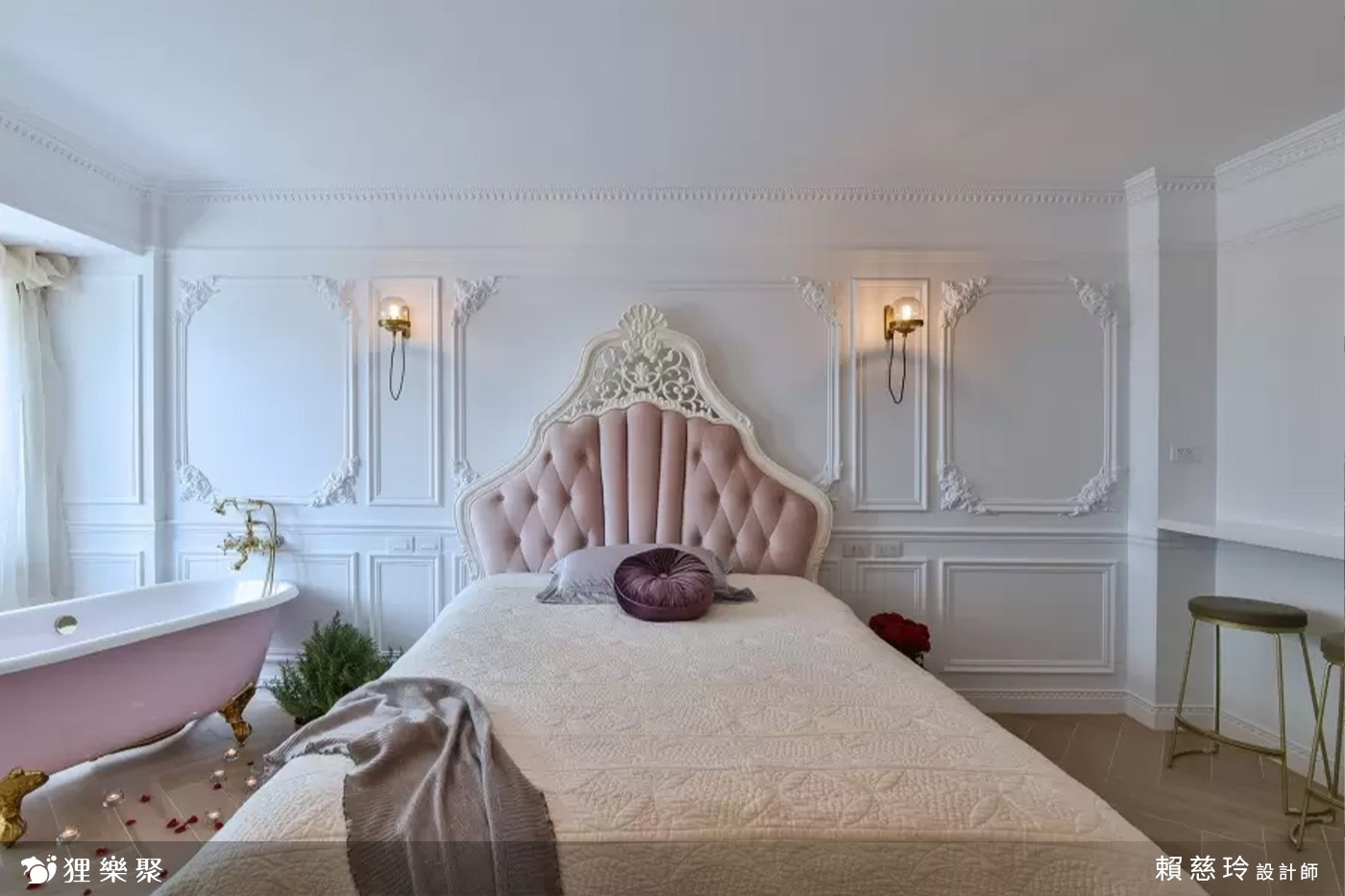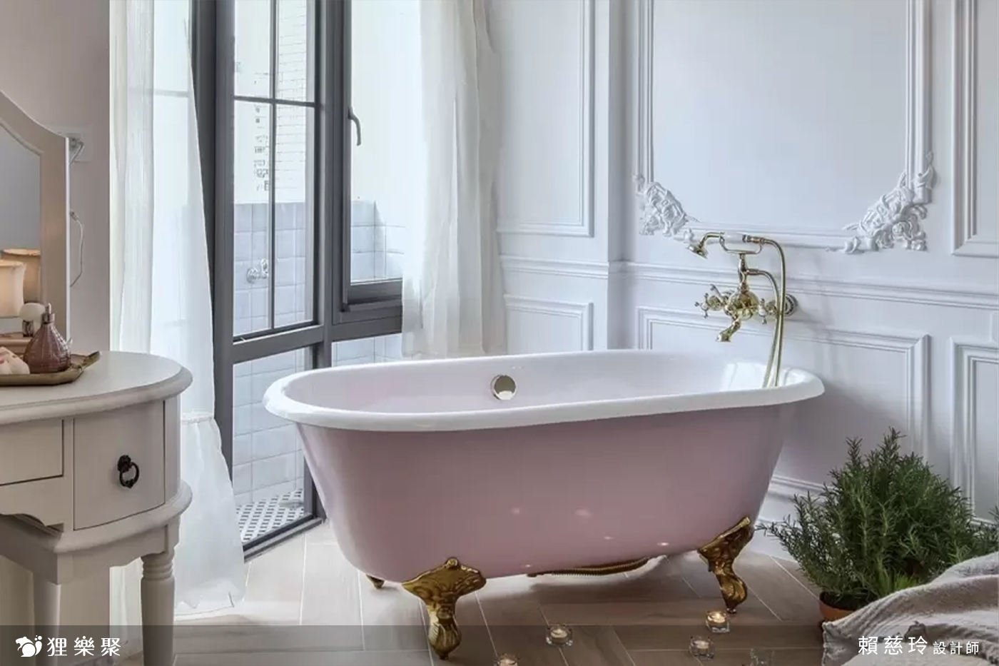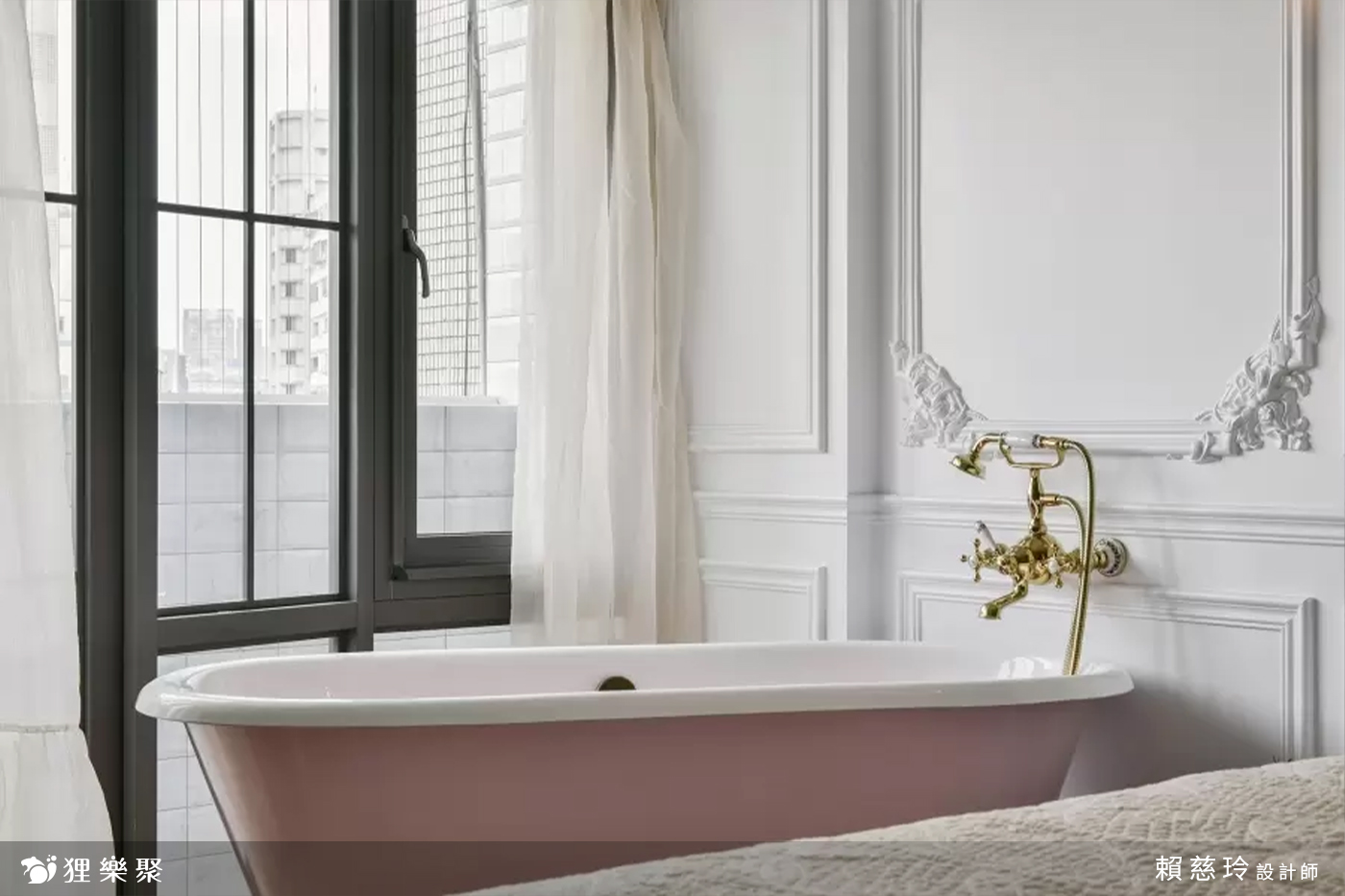 全室使用白色為底色,如線板、櫥櫃、家具等等皆是選用白色,讓空間能在華麗的裝飾下不顯浮誇;再以金色做為點綴,壁燈、水龍頭、以及窗邊浴缸的貓腳,從小處著手展現貴氣;最後再融入業主喜愛的淡粉色,帶出個人獨特的風格。
