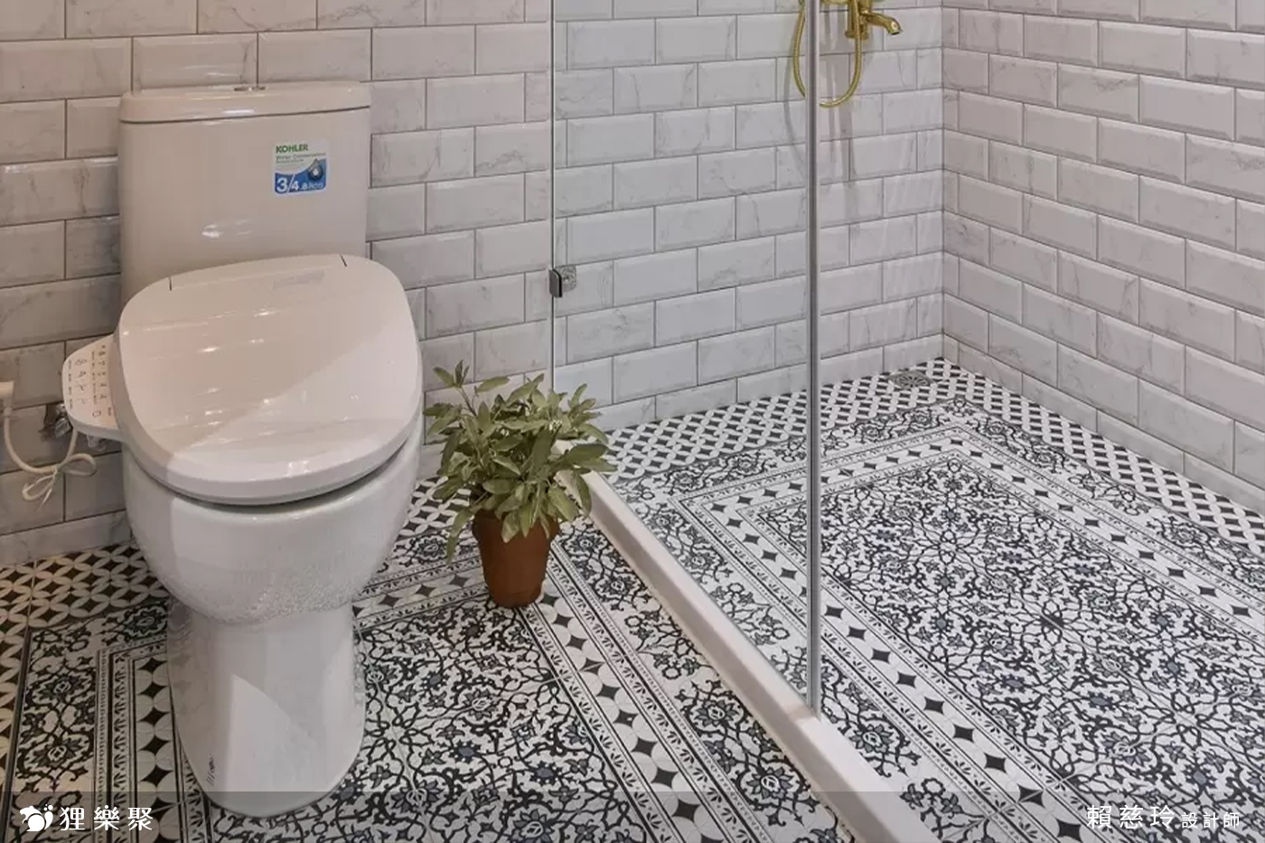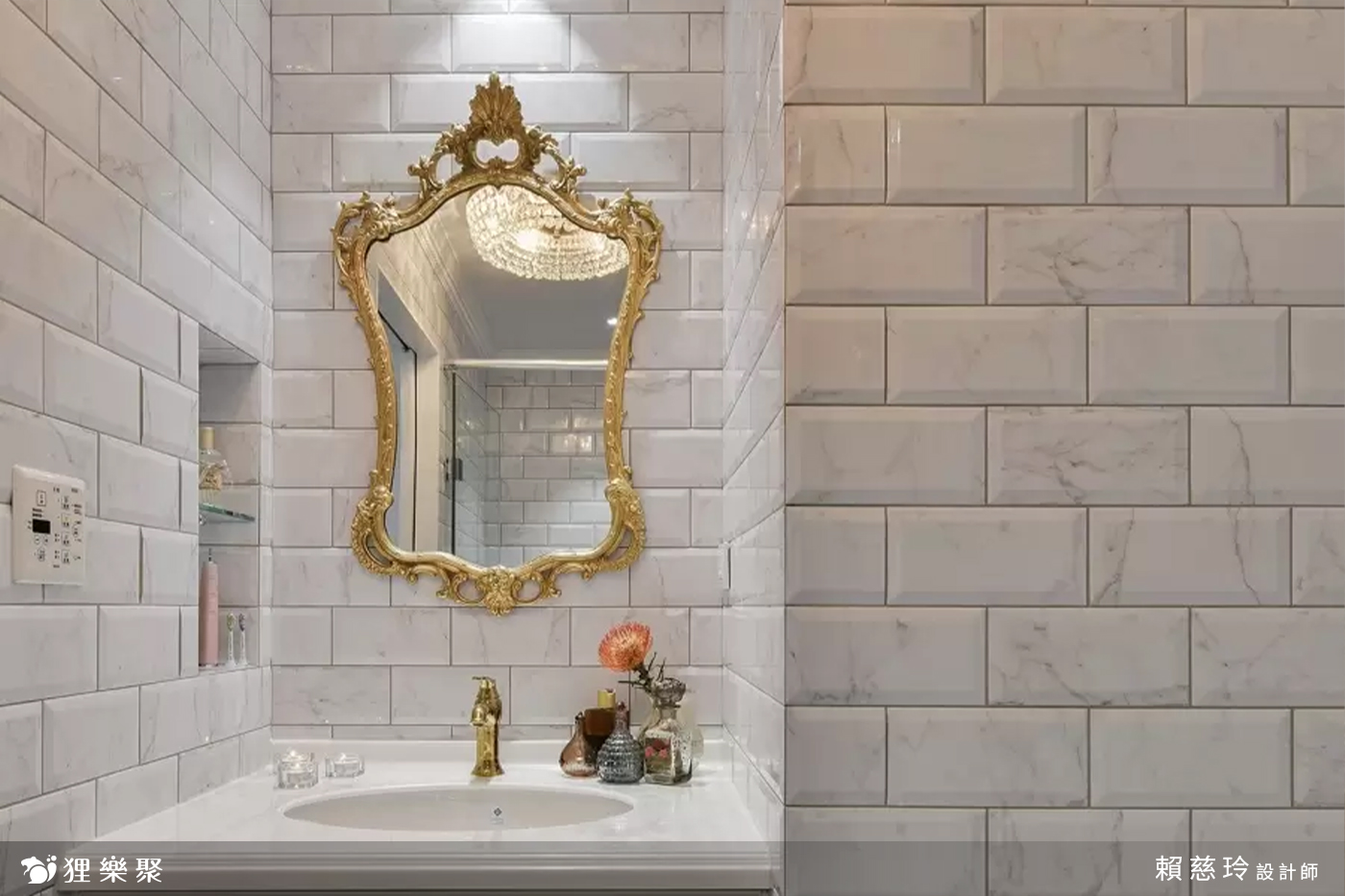 水晶吊燈是法式古典風必不可少的重點元素,將其做為整個空間的主燈,再輔以壁燈,盡量減少其他的照明方式,僅在長形房間的兩側做有崁燈,如此更能營造出唯美浪漫的氣氛。廁所的地板鋪上紋路較複雜的復古花磚,金色的蓮蓬頭和水龍頭呼應房間內的金色零件,並且掛上有著華麗浮雕的金框大鏡子,和冷色的石材紋路牆壁碰撞出高貴中帶著典雅的氣息。