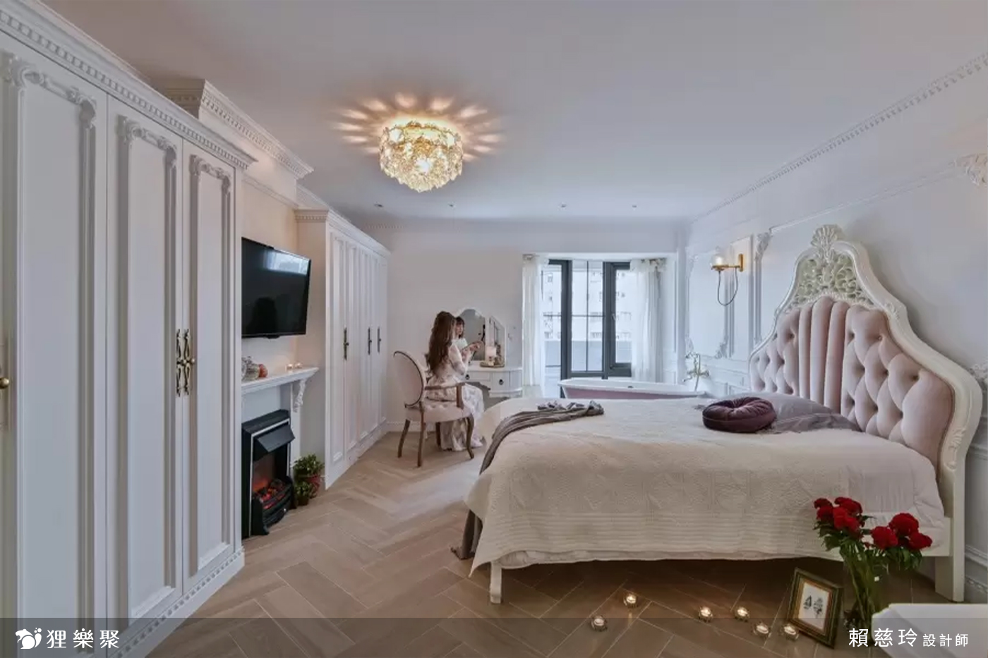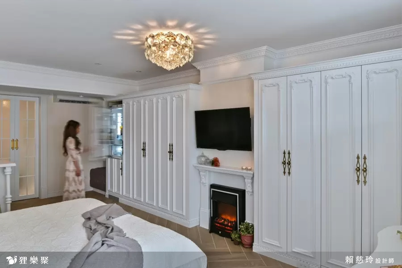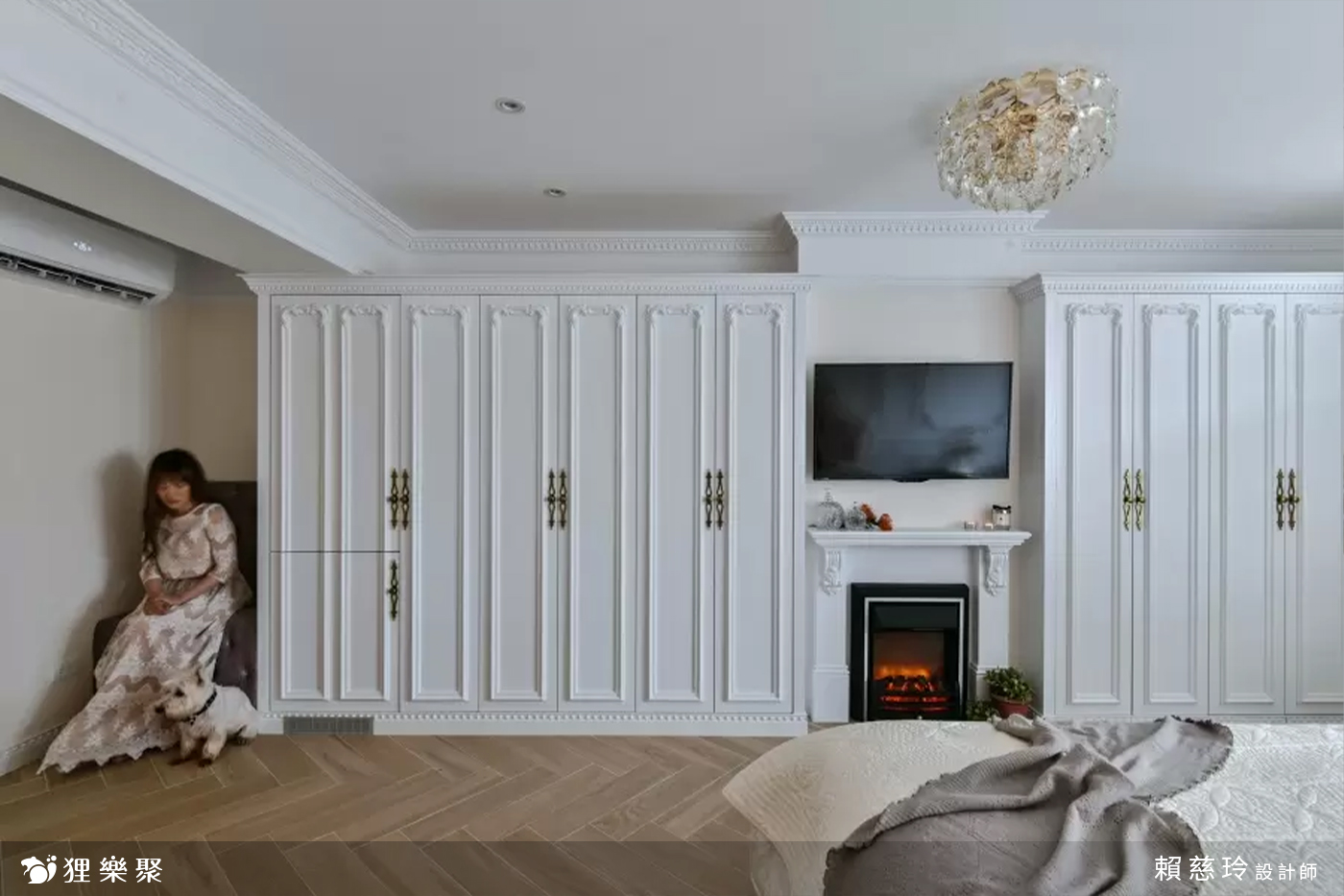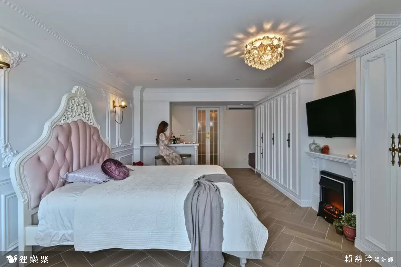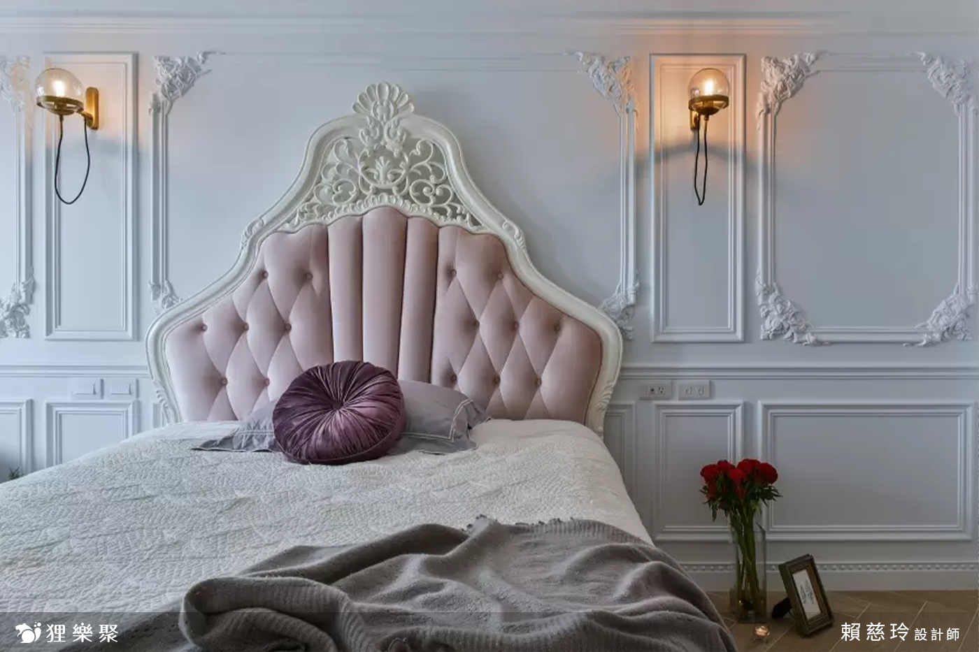 在床頭背牆、天花板的邊緣和櫥櫃的設計上皆使用了大量複雜的浮雕及線板來做裝飾,並且在配置上重視中軸線及兩側的對稱性,以展現法式古典風的大氣。在把手的部分也選擇較複雜的款式,營造出豐富有層次的視覺效果。