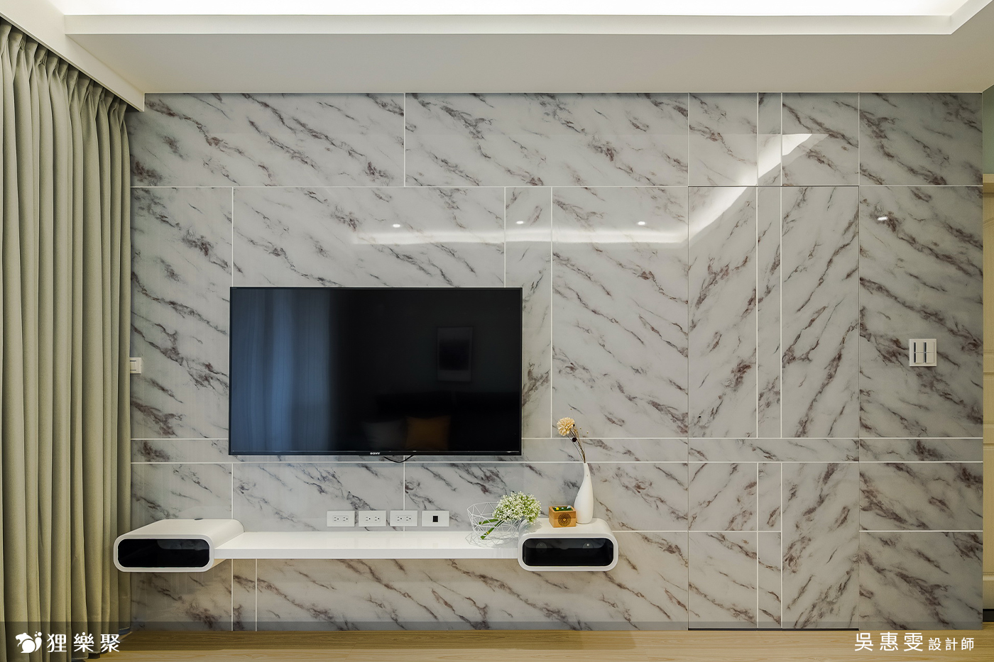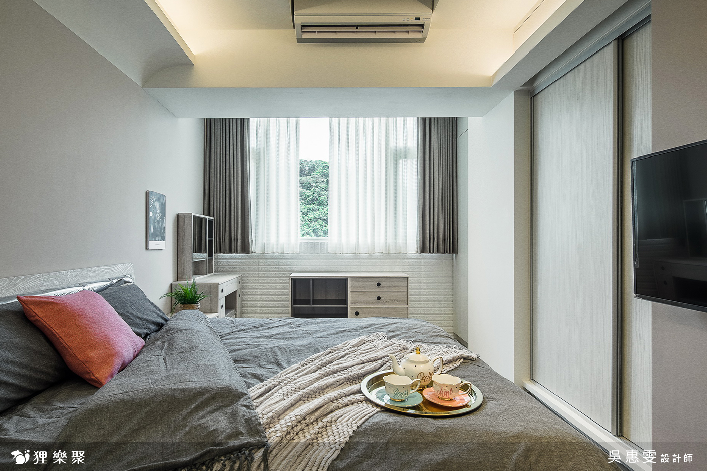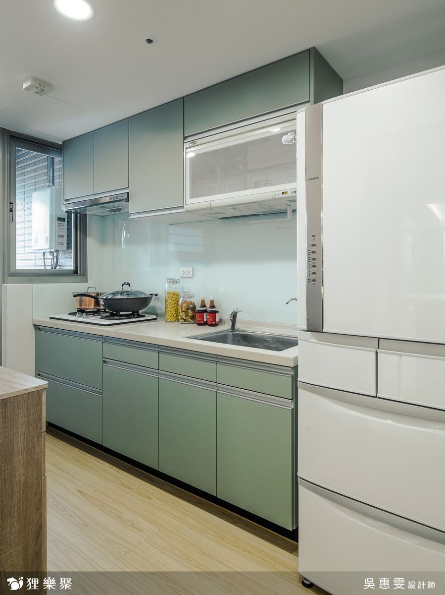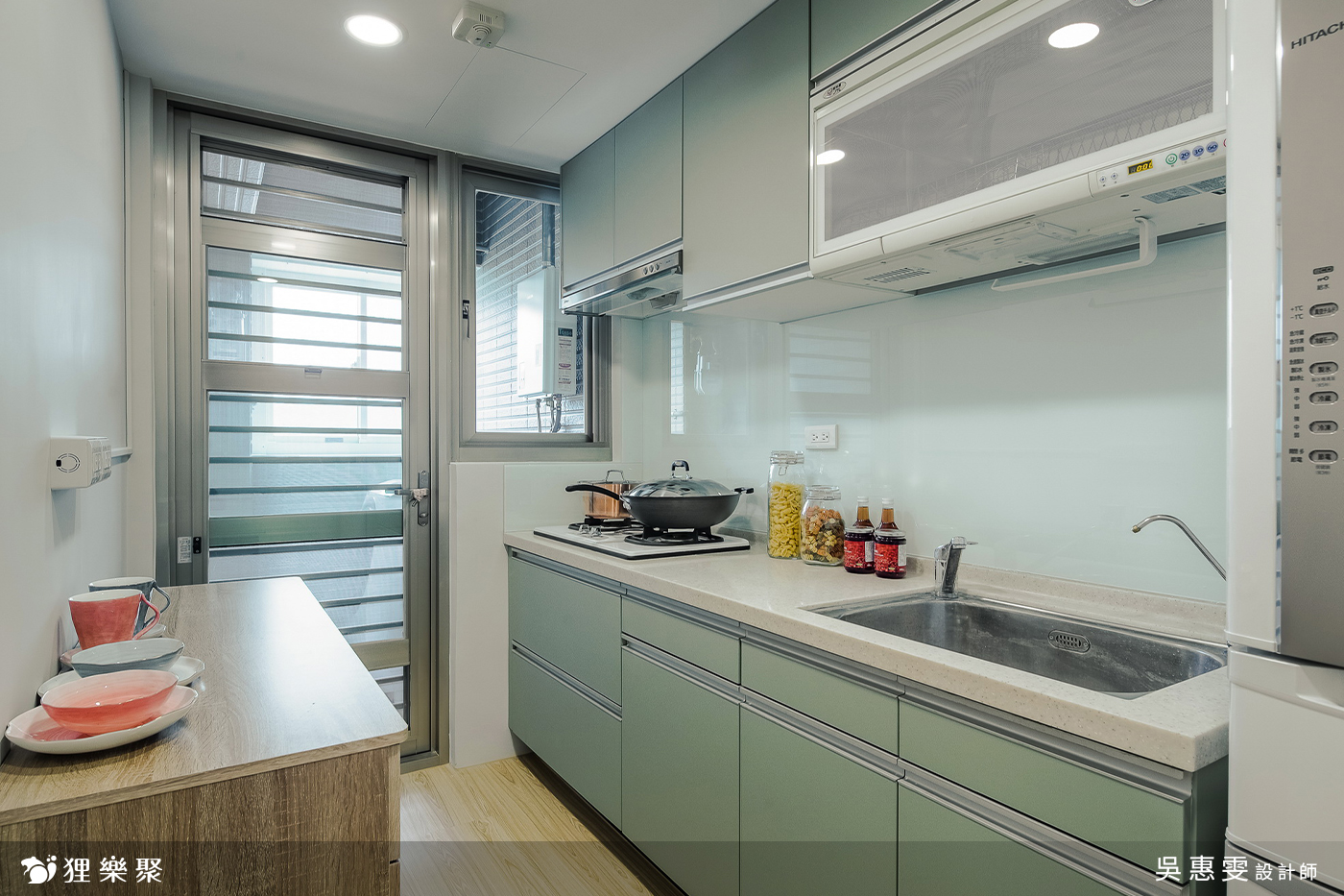 公共空間皆是藍綠色調,營造出清新活潑的感覺;餐椅與吊燈活潑的跳色,交織成繽紛的樂章,跳躍在這綺麗的小小世界;主臥的房間門融入電視牆的範圍,來增加主牆的強度;而主臥則以溫柔的藕紫色為空間增添一點女人味,滿足新婚夫妻的小小甜蜜。