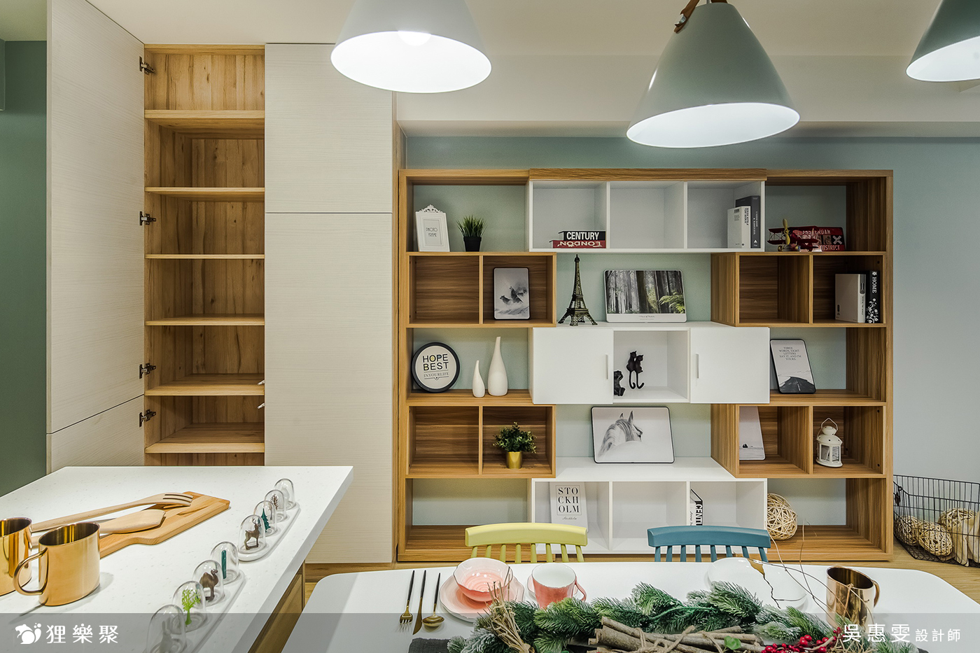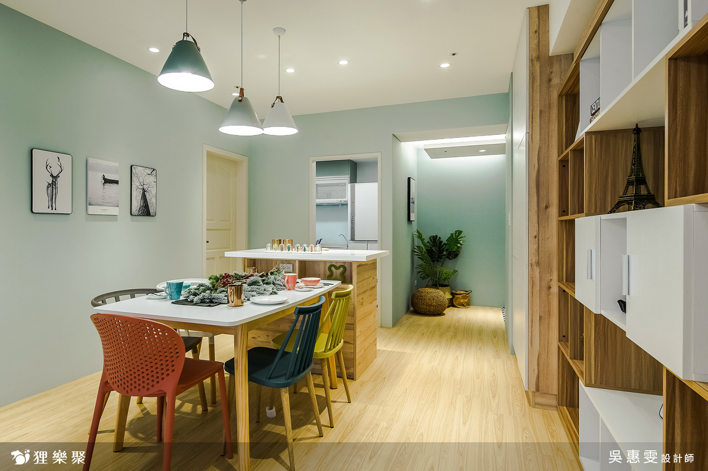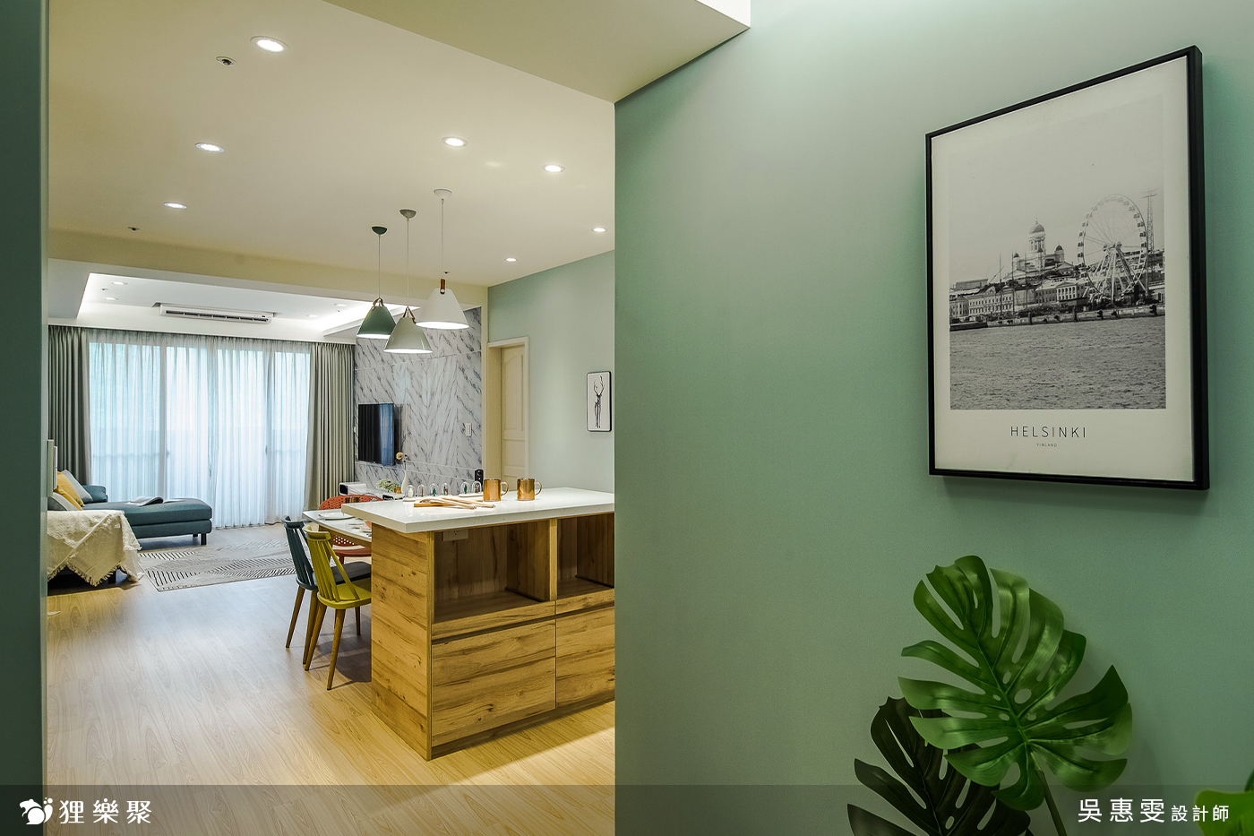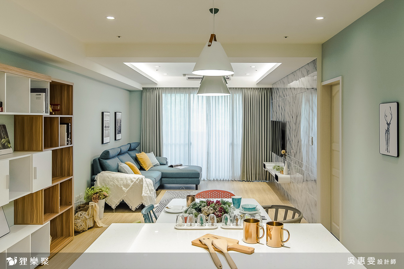 將玄關的天花板局部下降,上下分別裝設間接照明和崁燈,在小空間內營造出有如星光大道般的氣派感;客廳和主臥都設置了層板並搭配間接照明,柔和且均勻的燈光照射著整個空間,非常適合溫馨舒適的北歐風格;最後在餐廳配置藍色和溫綠色的簡約造型吊燈,和整體空間色調相互呼應,活潑又有設計感。