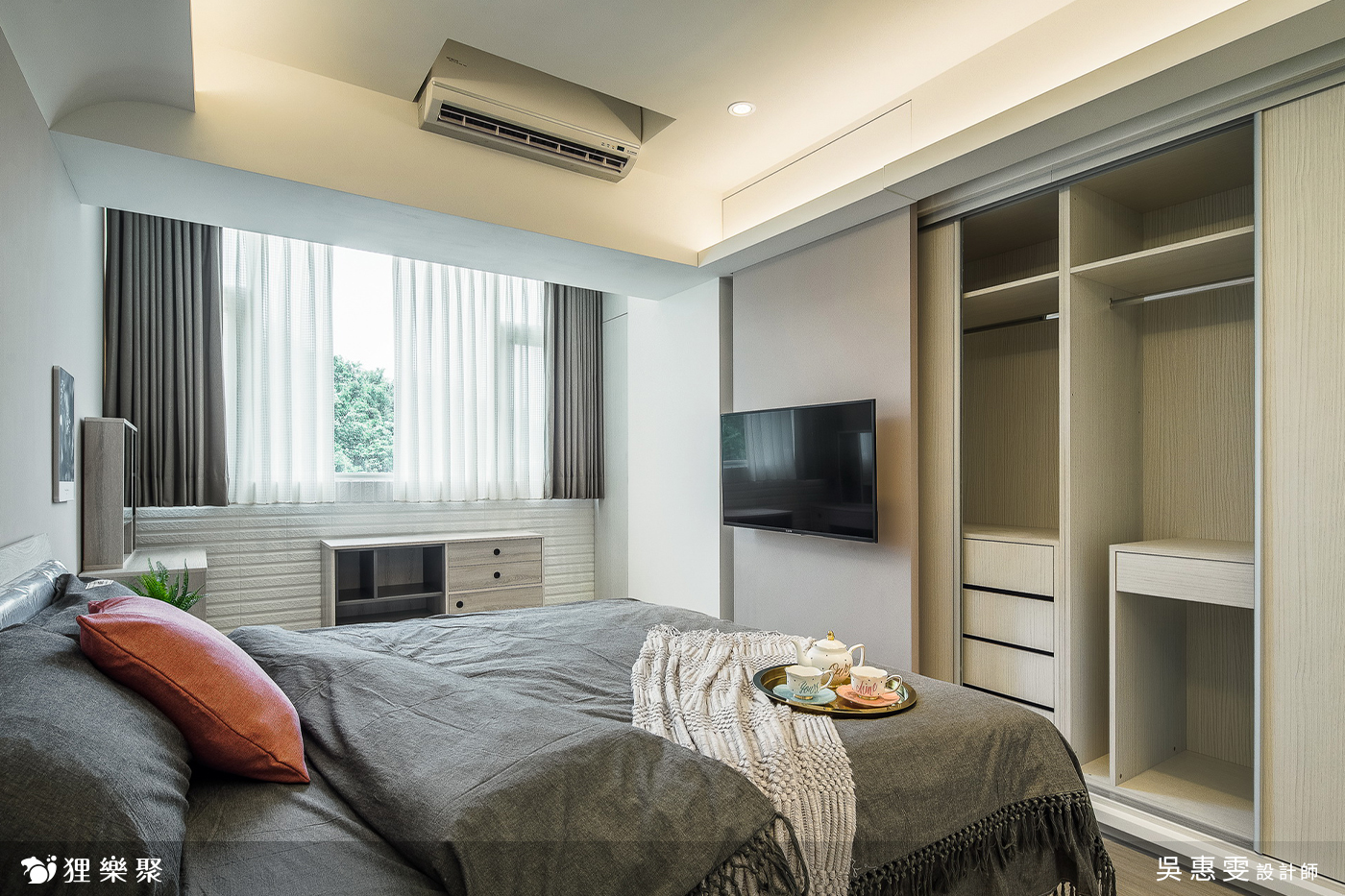 系統櫃的板材甲醛含量低、易清潔好保養,是裝潢的好選擇,並且相較木工來說有著施工快速、品質穩定、粉塵少等優點。此次屋內的收納皆以系統櫃做規劃,從玄關鞋櫃、客餐廳展示收納櫃、中島電器櫃到主臥衣櫃,利用白色和木紋色的板材做拼接變化,整體設計統一而不無聊。