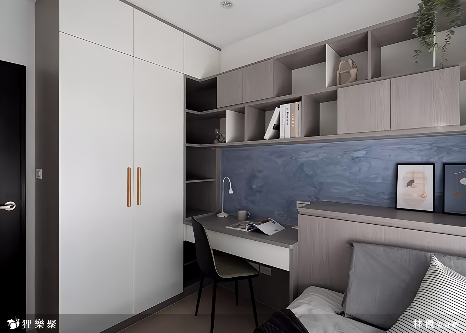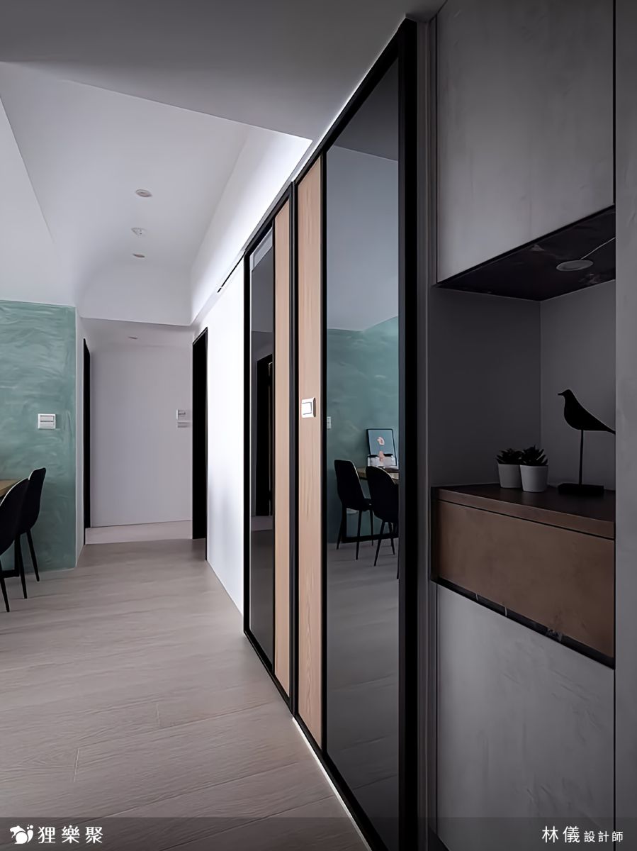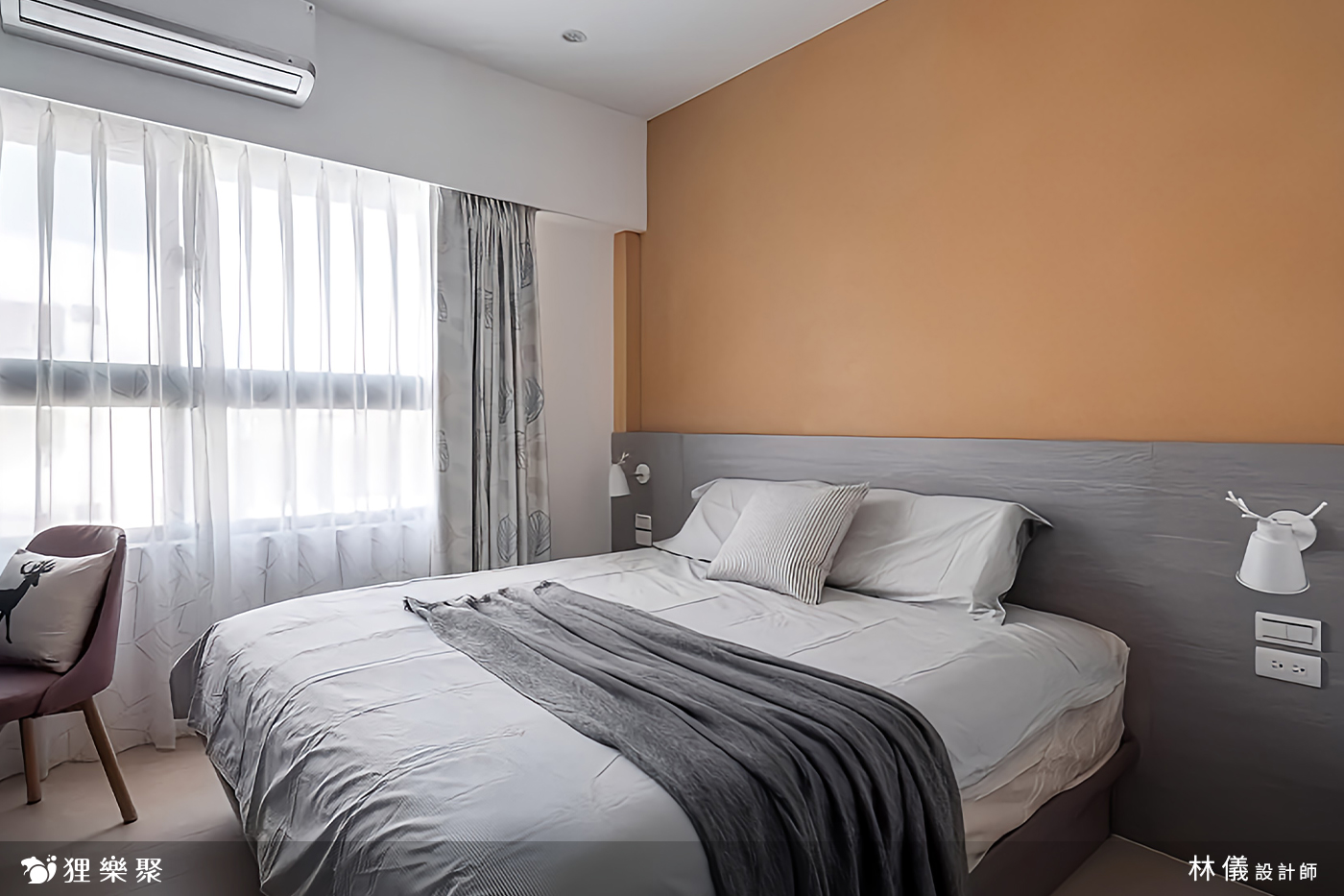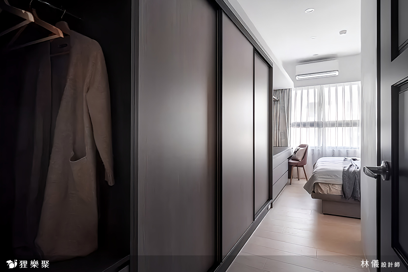 由於坪數的限制,為了保留足夠的走道寬度,加上屋主喜歡開闊的視覺感,公共空間的櫃體都集中於電視牆一側,沙發背牆的重點就留給特殊漆來展現;在主臥室的部分全部選擇滑門衣櫃,以保持走道的流暢性,是小坪數設計中常見的得力助手,若是有人在拿取衣物,也不會因此影響到另一人的行走動線。