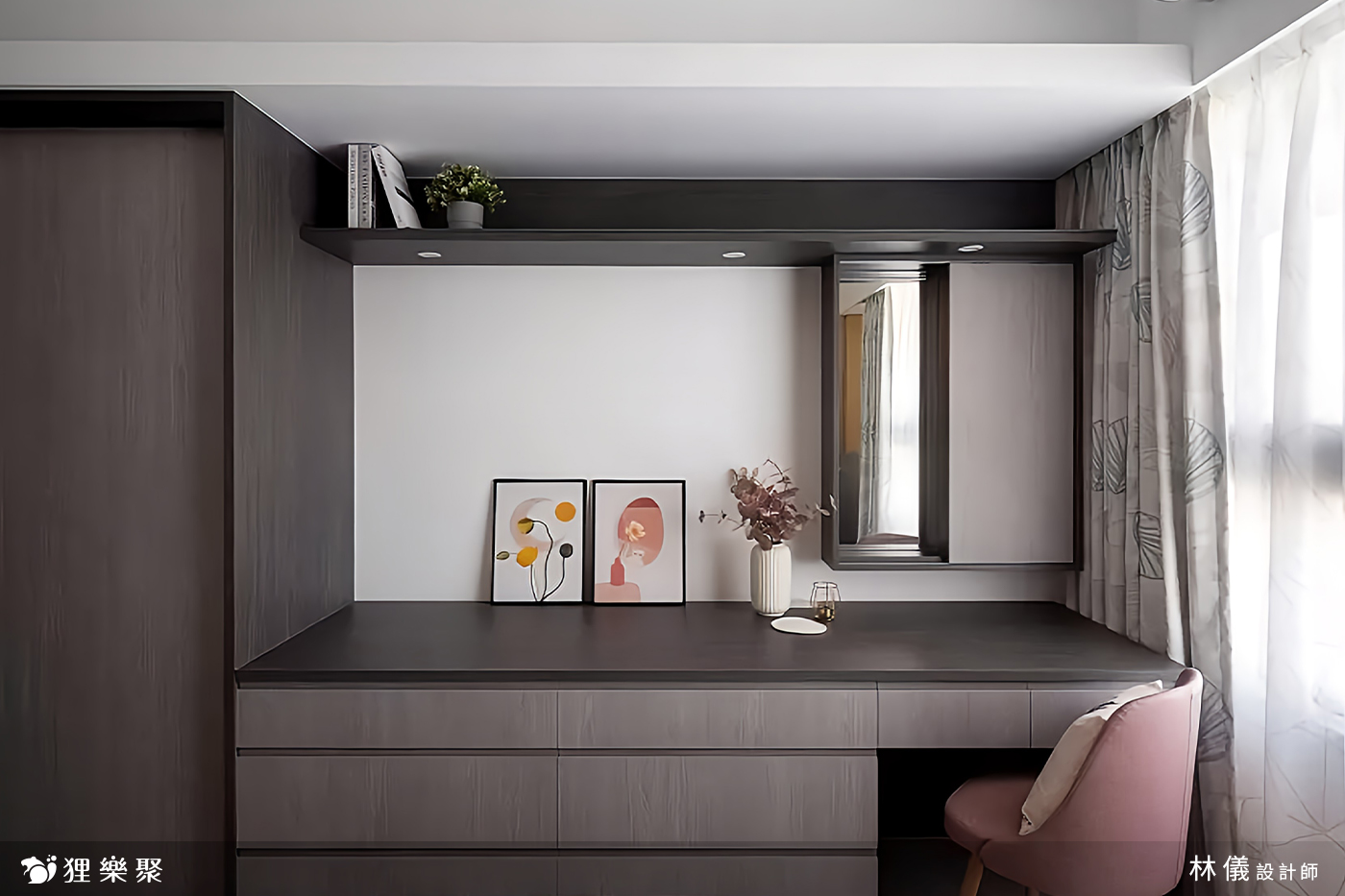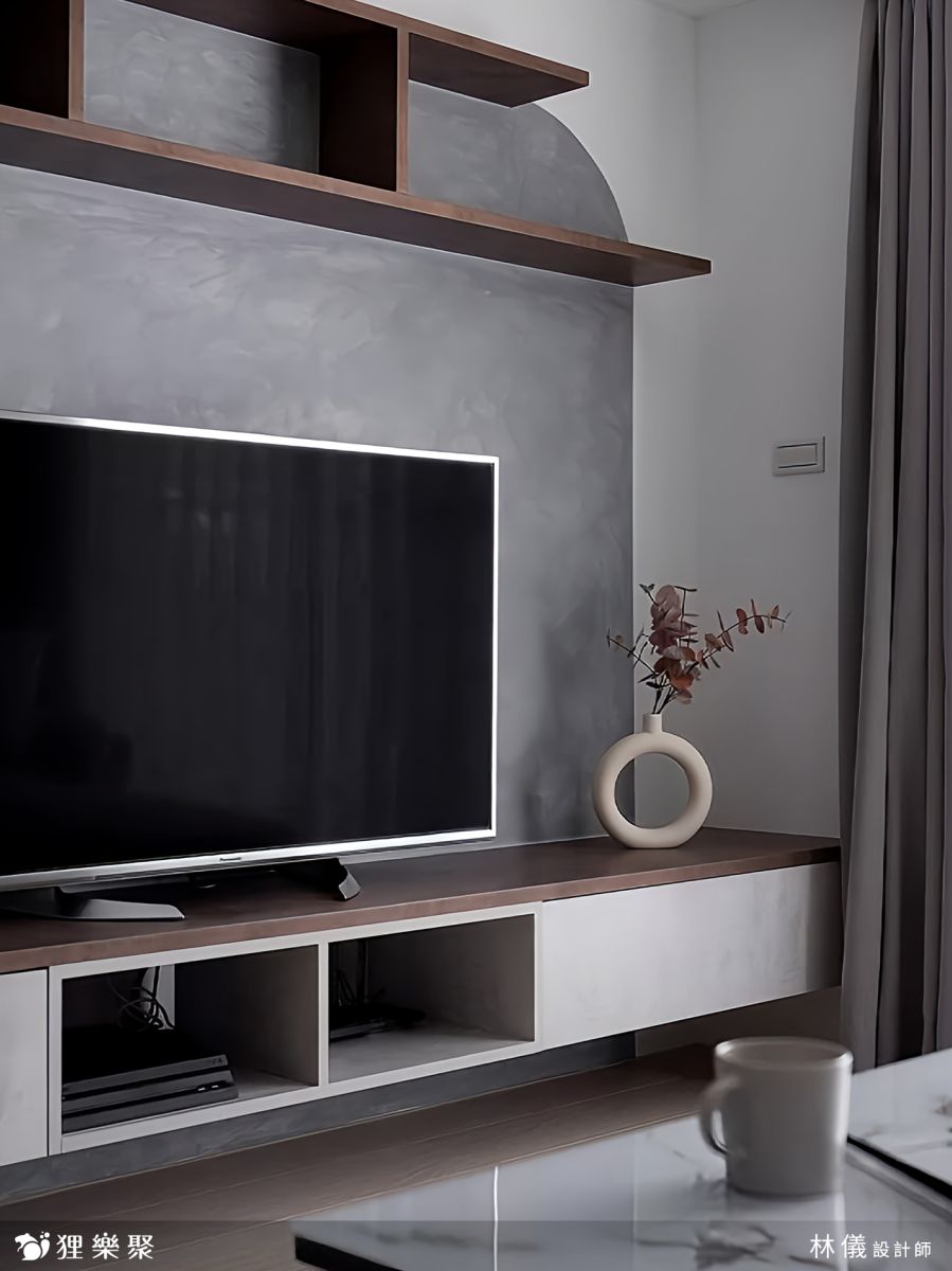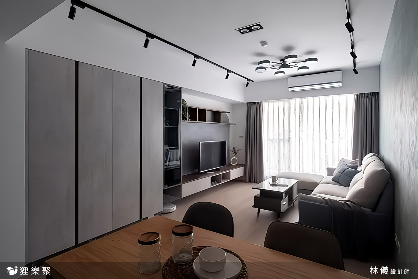 由於經典的工業風所使用的材料較多元,視覺上也較為複雜,所以設計師以輕工業風裝潢來做這個新成屋設計,保留工業風的重點元素,但又不會讓小坪數設計顯得過於繁雜。公共空間中櫃體的選擇以深木紋色為主,搭配仿舊感的木紋門片,以及仿清水模的弧形電視牆,呈現出復古、靜謐的沉靜氛圍,在客廳待上三天三夜都不會膩!臥室中也延續公共空間的風格,以深木紋色搭配淺淡色系的門片為主,再局部以金色把手或床頭壁燈作點綴。燈具的部分,客餐廳使用軌道燈及盒燈,讓天花板呈現一些俐落的線條感,臥室則選擇一般的嵌燈做均勻的照明,主臥更加上造型壁燈,增加了視覺上的趣味性。
