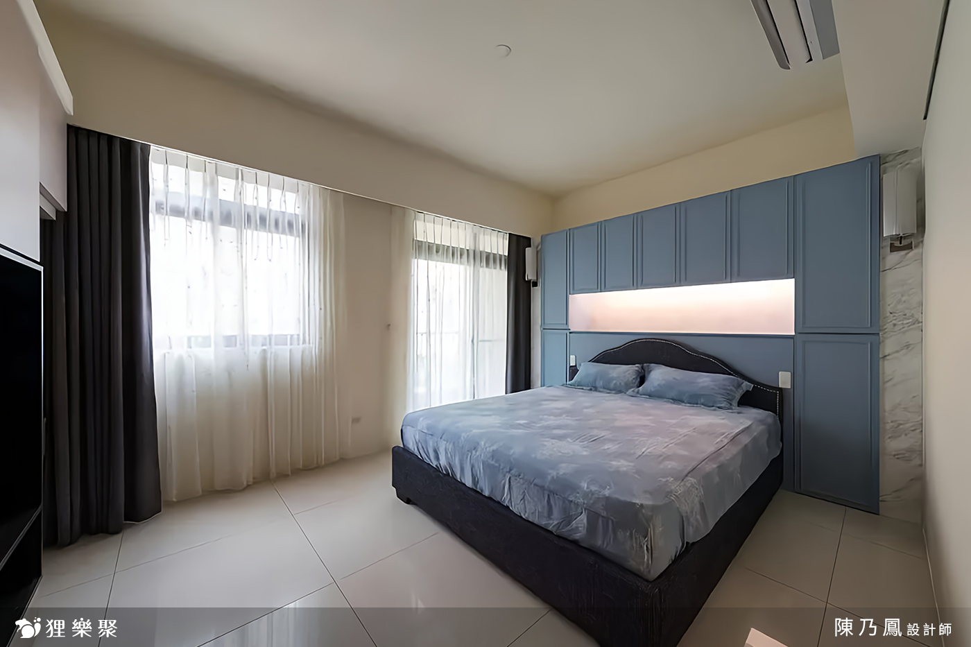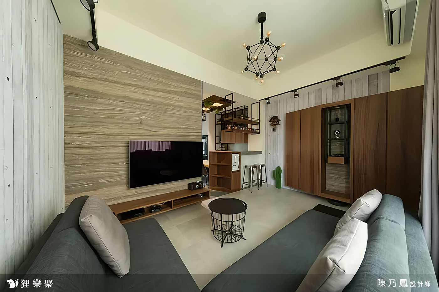 一般常見的格局是電視牆在屋子的長邊,以營造出大器的氛圍,但在這個透天裝潢案例中則將整個客廳轉了90度,沙發背靠窗戶,而電視牆則成為了配角,搭配上L型沙發和一旁的吧檯桌,讓兩個空間的連結性更強,營造出溫馨、明亮的空間感受。