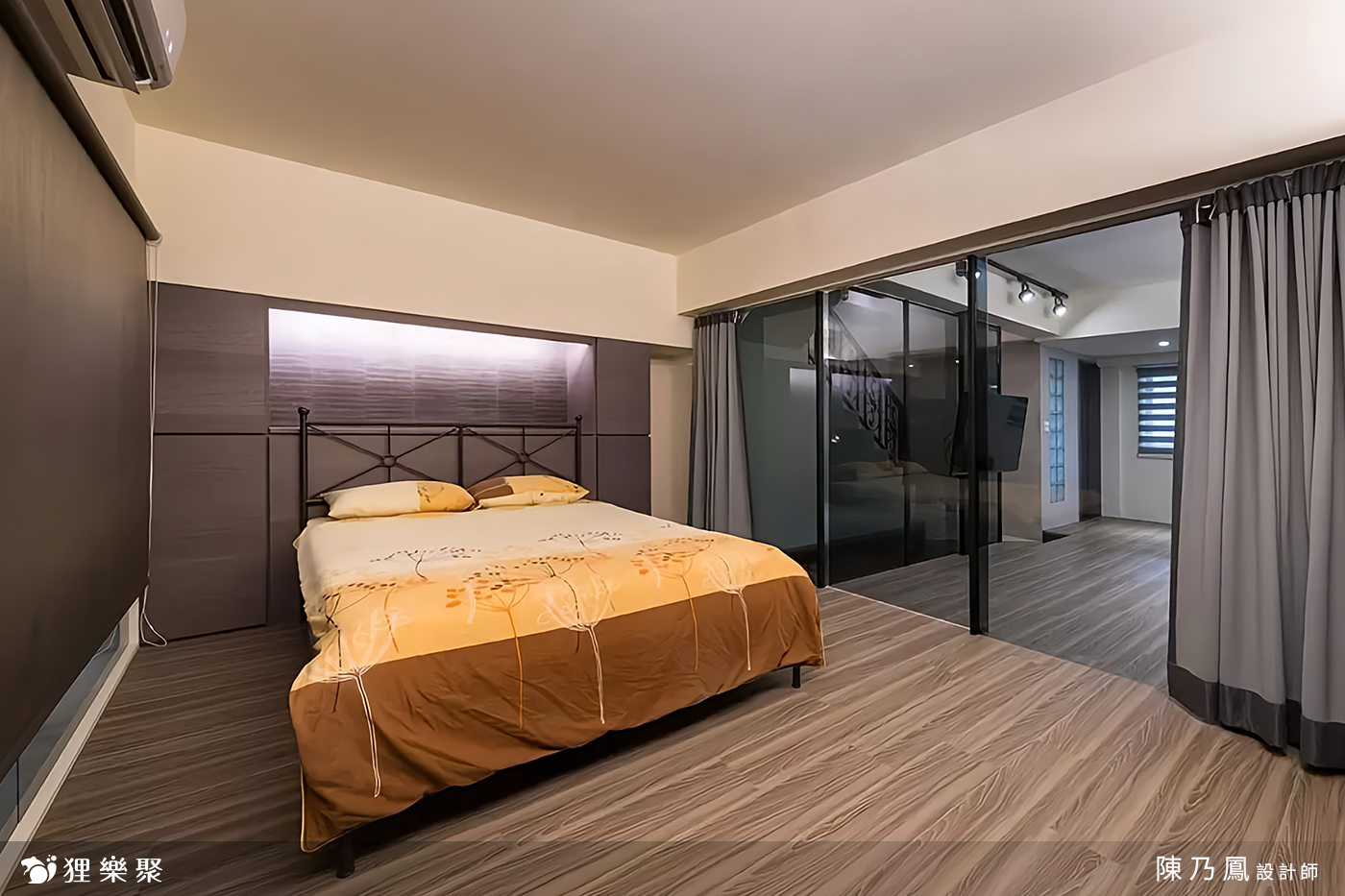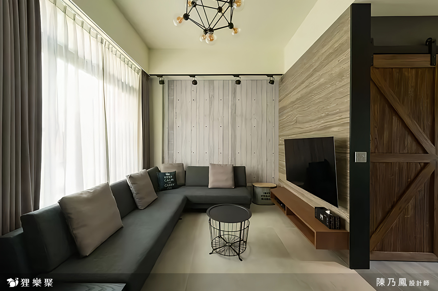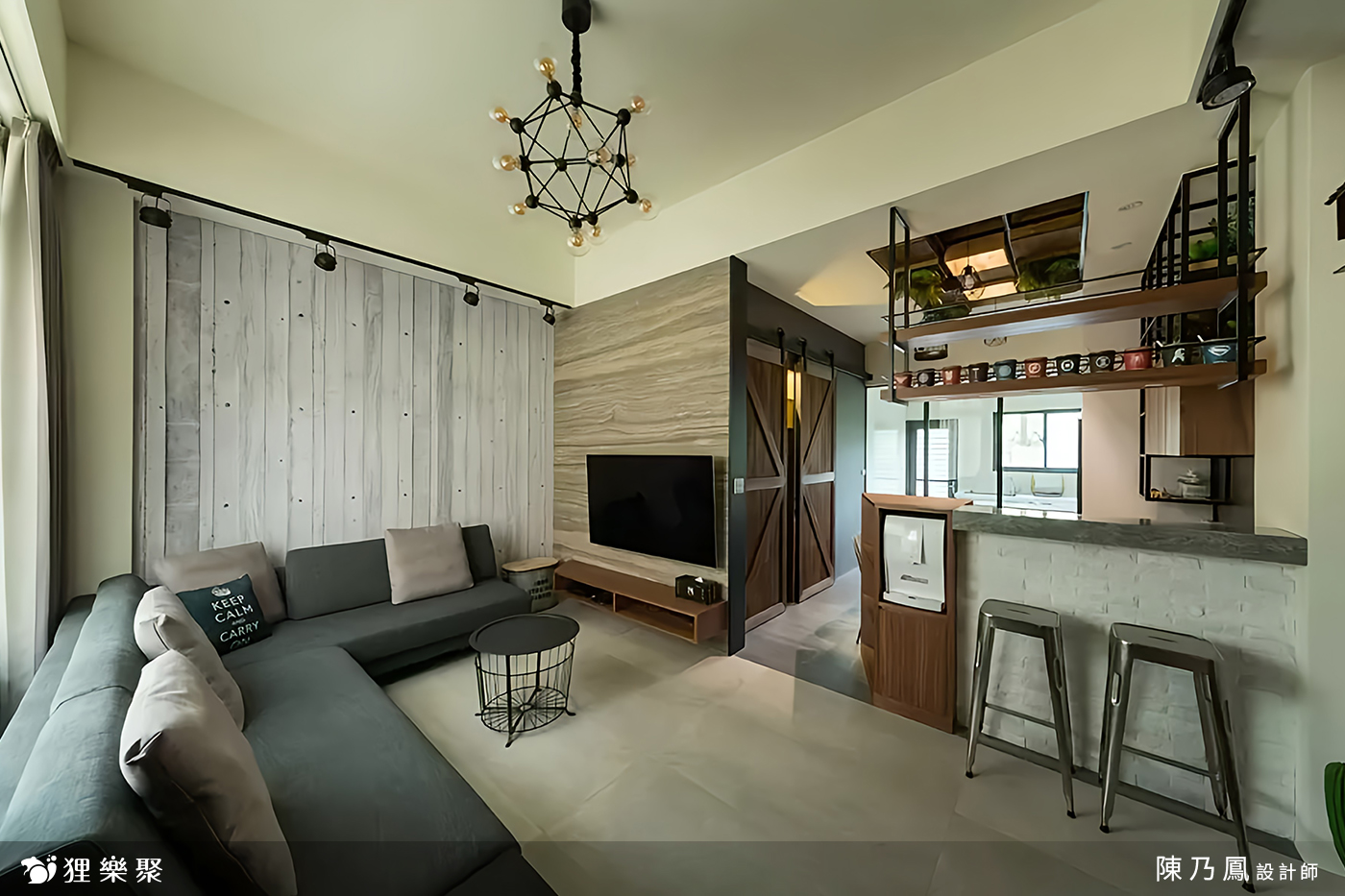 在這個透天室內設計案中,利用許多溫暖的深色木紋和鐵件去互相搭配,是經典的工業風設計一定會使用到的材料,可以為屋子輕易地打造出個性感,而穀倉門、軌道燈也是工業風裝潢的必備元素,穀倉門不僅具有隔間的作用,對於牆面來說就像是一幅最美的掛畫,微微仿舊的復古感也相當有味道。