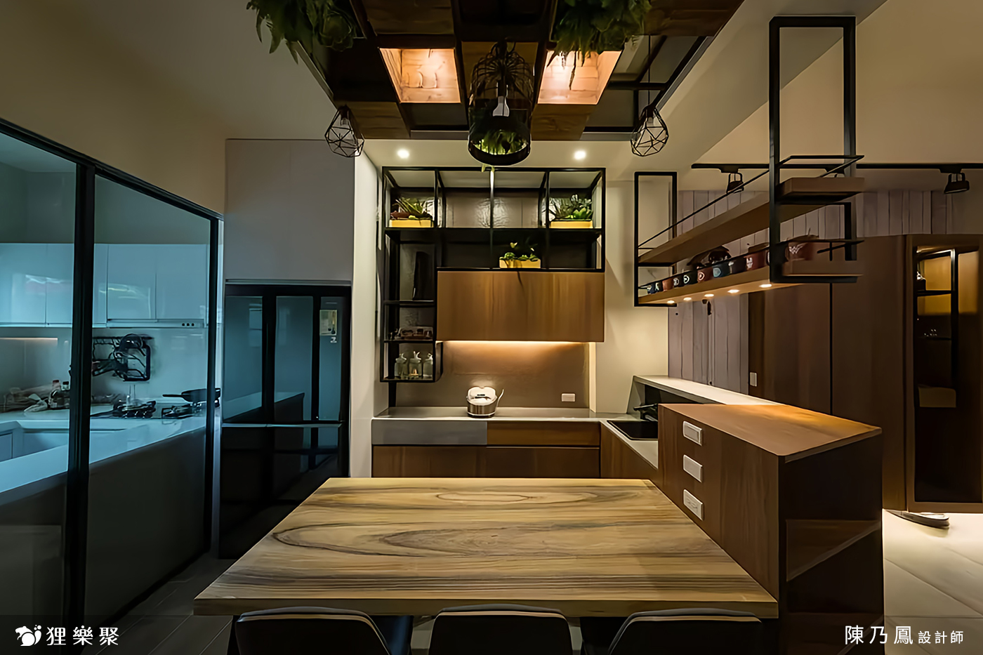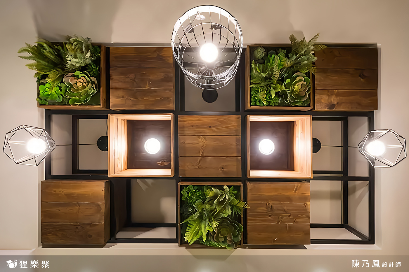 餐廳的天花板設計是這個透天裝潢的一大亮點,利用鐵件做出格狀造型,並以燈具、木頭和假植栽來填空,視覺感受上相當溫暖,一些綠意也營造出生機蓬勃的氛圍,是一個令人百看不厭的造型天花板設計。這個工業風設計宅在每個空間的牆面都不馬虎,利用各式各樣的材質來做為裝飾,如磚牆、石紋或木紋拼接等等,視覺主牆對於營造氛圍佔據著相當重要的角色,在規劃上都可以利用主牆設計去做延伸。