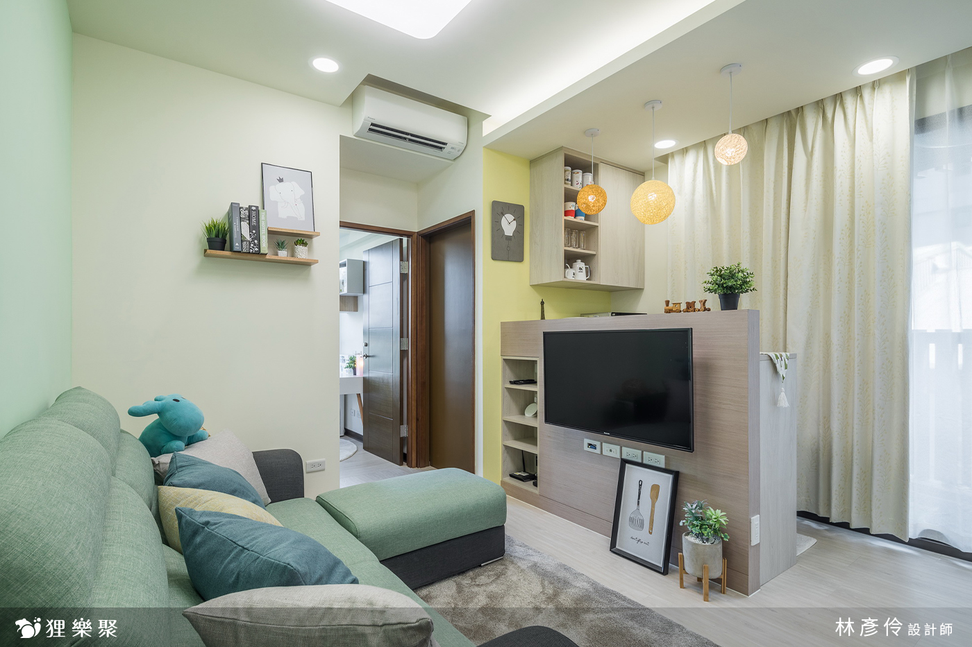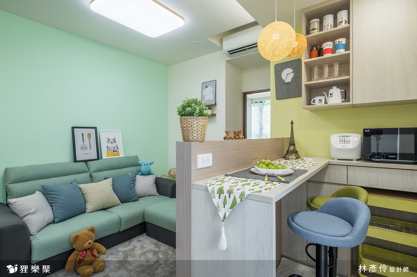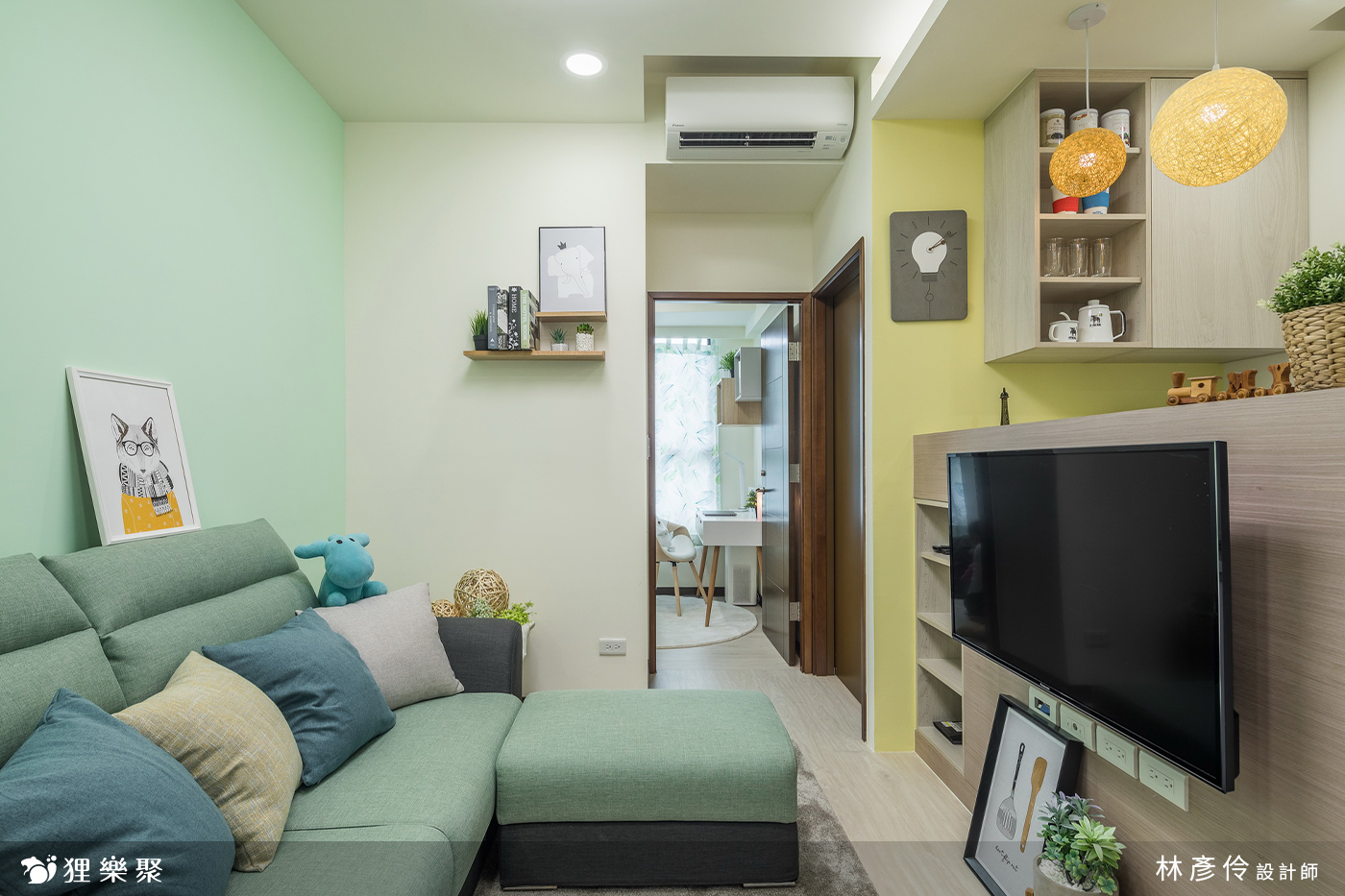 當預算有限卻想要營造風格時,選擇使用油漆也能夠很輕易地烘托整體的氛圍,而小坪數裝潢不適合做太多造型裝飾,會讓空間顯得過於擁擠,讓舒適感大大下降,這種情況同樣適合利用油漆作點綴,例如屋主在公共空間選用不同深淺的黃色搭配馬卡龍綠,馬上呈現出明亮又帶點俏皮的感覺。