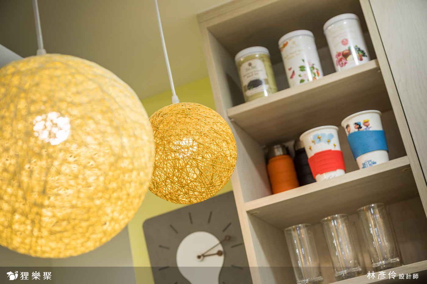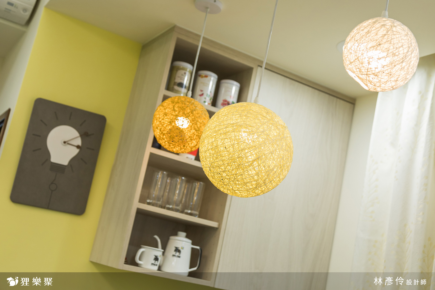 在電視牆吧檯的重點區域選擇三個一組的球狀吊燈,黃色的外型和整體的溫馨色調相互呼應,不同深淺的黃色和水平高度打造出層次感;玄關區域的造型吊燈選擇了黃光,讓屋主一打開門就能感受到家散發出的溫暖感覺。