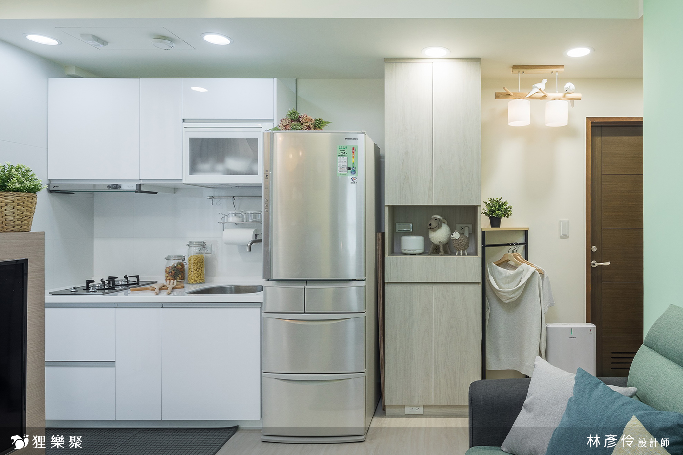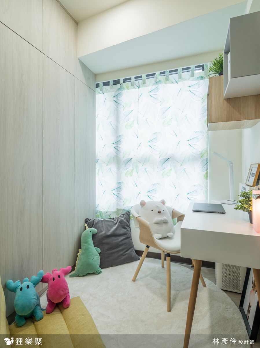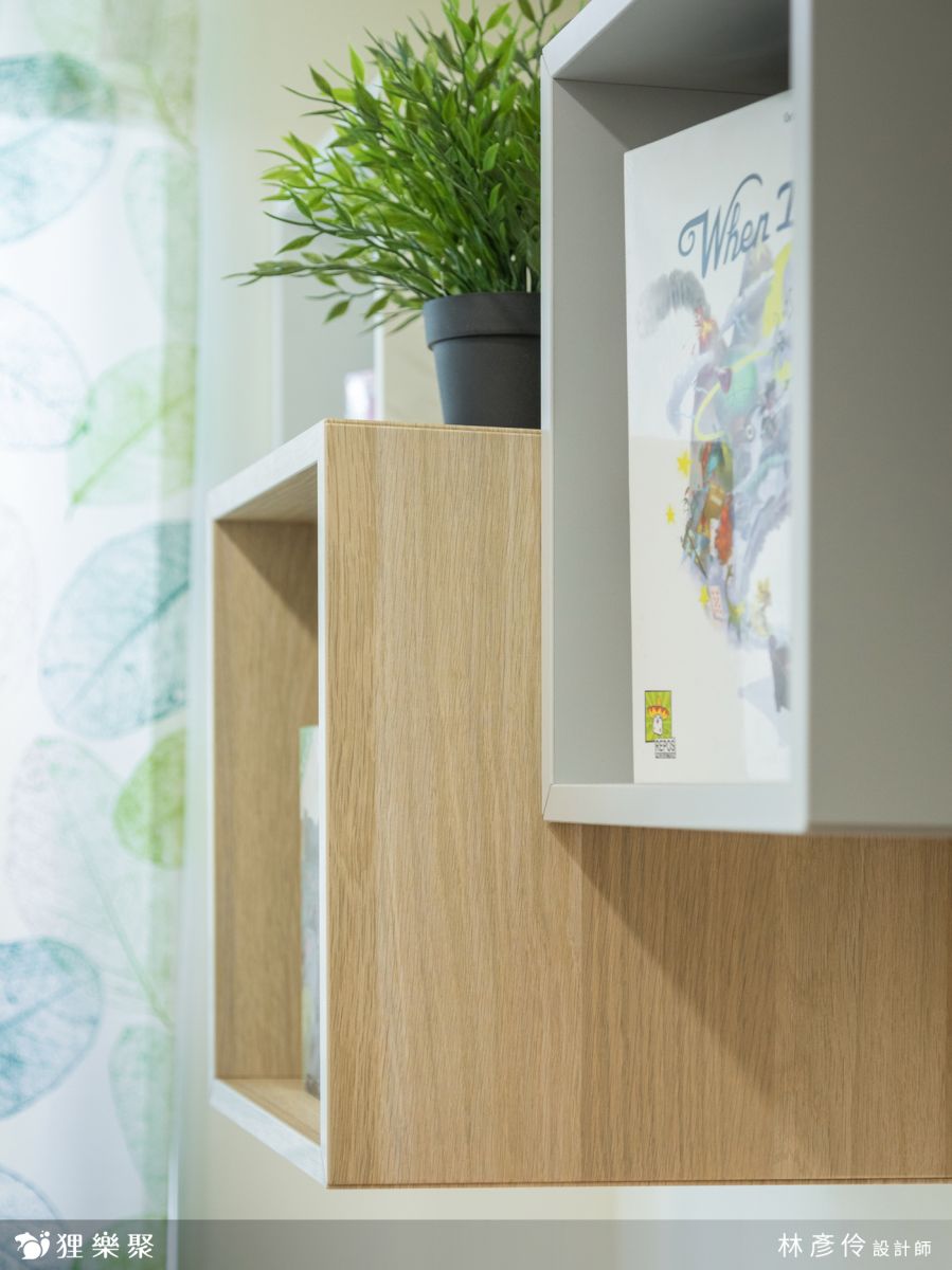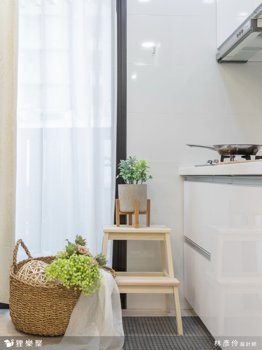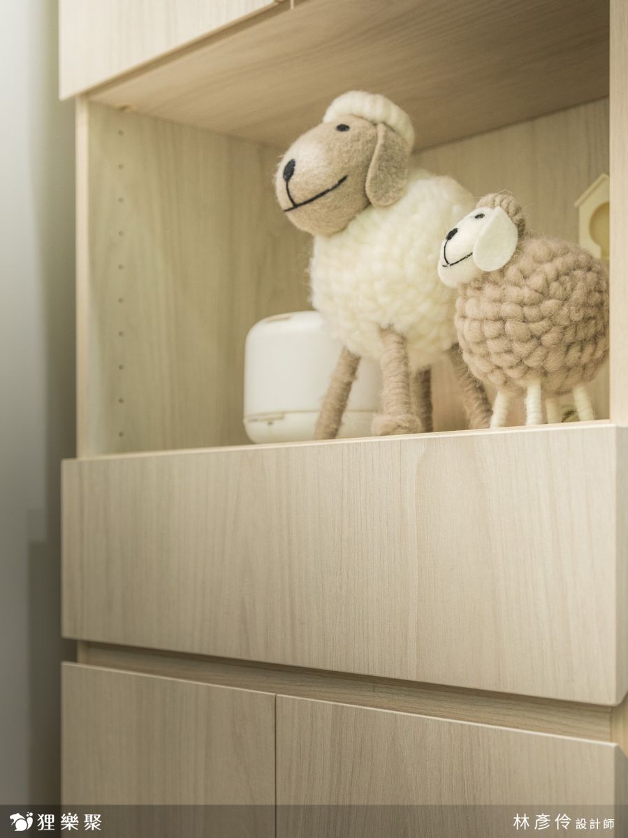 北歐風常使用木紋元素來打造明亮溫馨色調,除了建商所附的廚房,其餘櫃體皆使用木紋來打造,而房間內坪數不大,淺色的木紋門片不做任何把手,整體效果會更乾淨,以減輕視覺上的負擔。