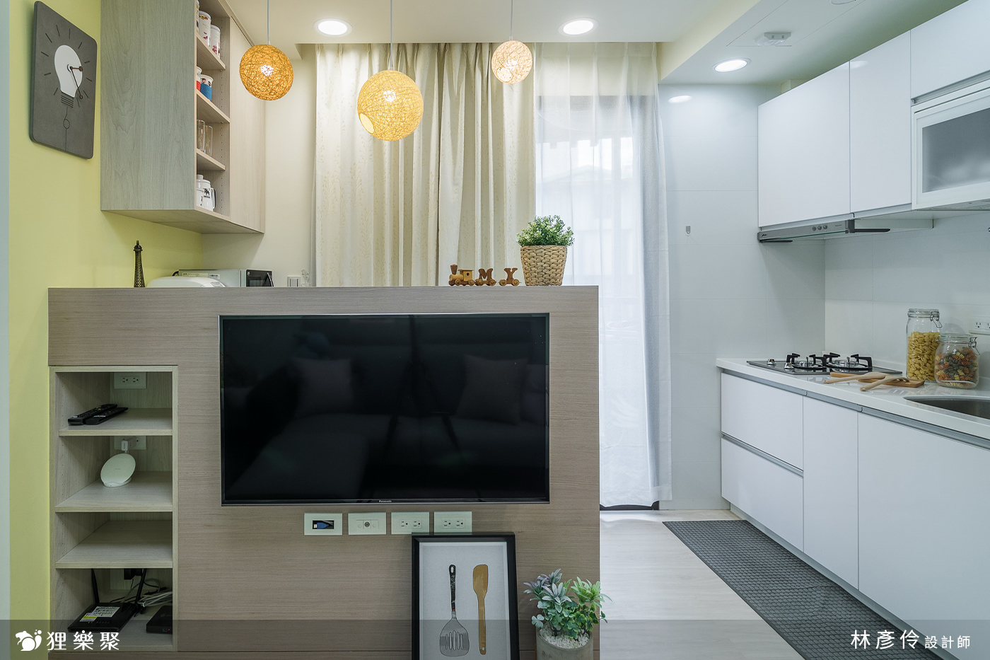 由於吧檯剛好是個狹長型的空間,設計師便將屋主要求的吧檯與半高電視牆結合,成為一個微微有分隔但又不會將空間完全截斷的區域,身在沙發上和在吧檯區的人也能夠進行交談,電視牆吧檯讓屋主的活動區域更加不受限;而以吧檯區的角度來說,L型櫃子並不是非常方便使用,正好將轉角的區域規劃給客廳區域,放置一些小雜物等等,提高空間的利用率,是設計師針對小坪數裝潢的小巧思。
