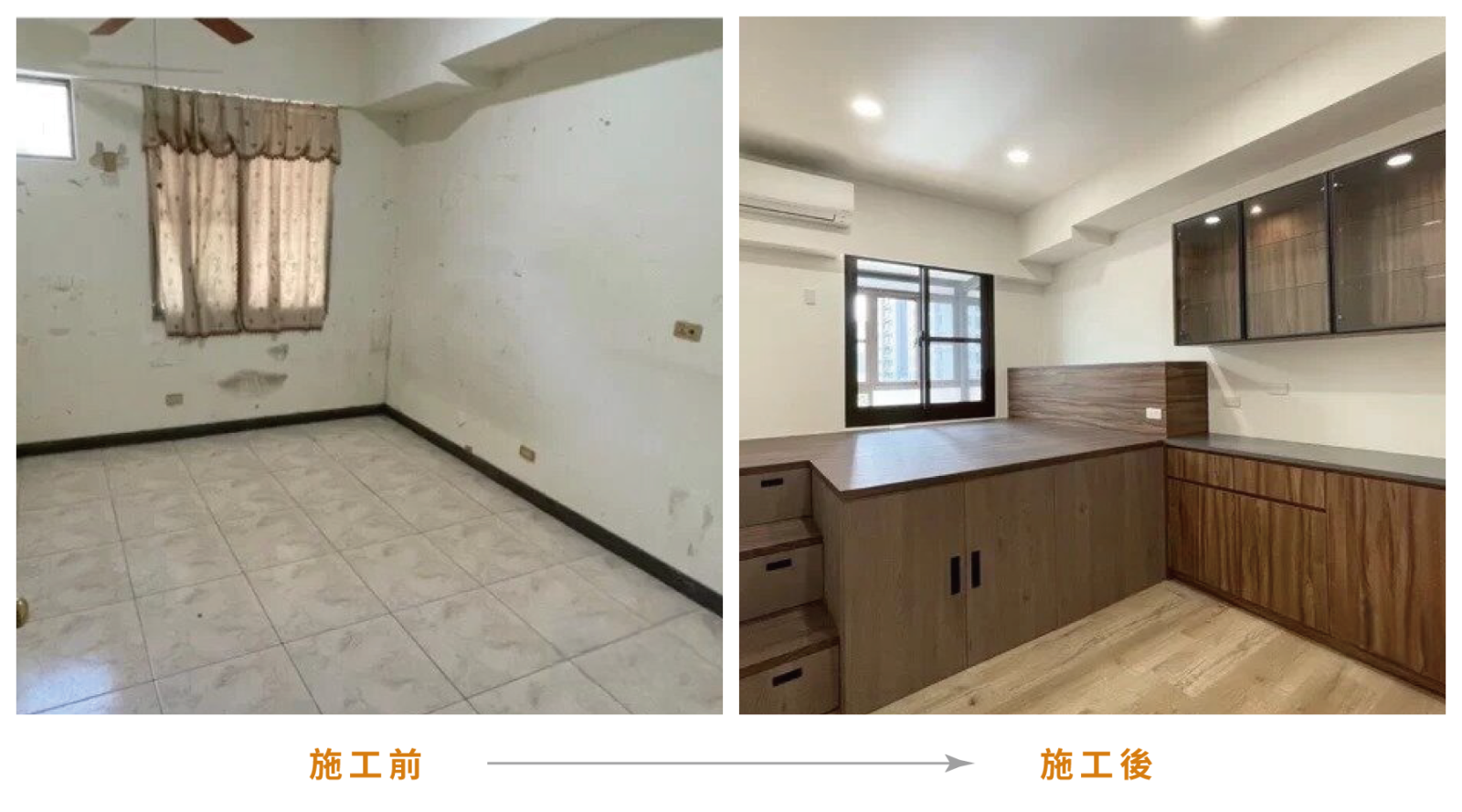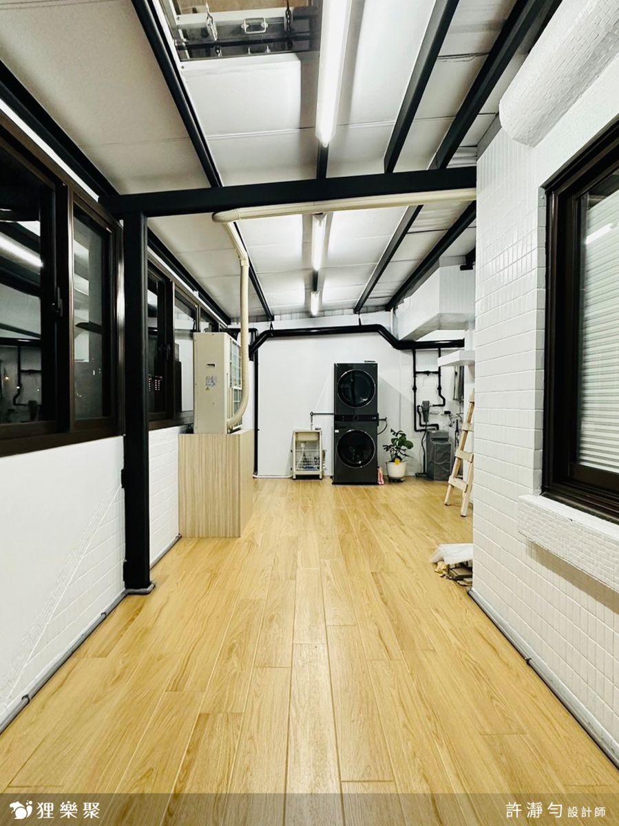 這個老屋的陽台相當大,業主希望可以將陽台也裝上窗戶,鋪上木地板以後就能做更多元的利用,除了一般晾曬衣服外,也可以在這裡做一些簡單的運動,或是放一組桌椅,偶爾在這兒喝喝茶、吹吹風,非常愜意;除此之外,廚房和浴室也都換上了全新的面貌,將原有的舊式磁磚剔除,並與屋主仔細地討論使用需求後,重新打造了時尚且實用的新面貌。