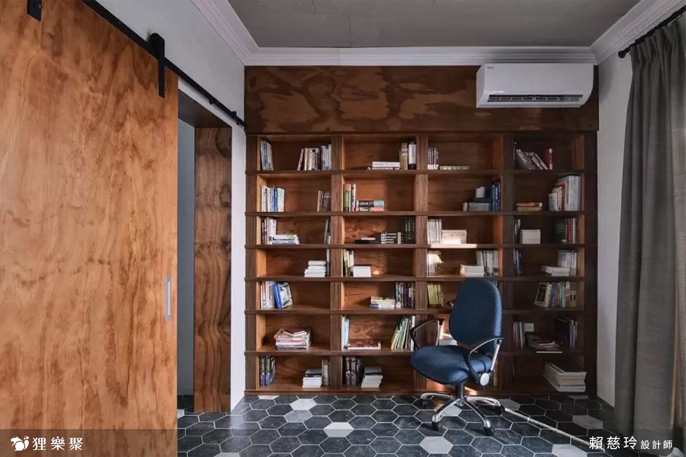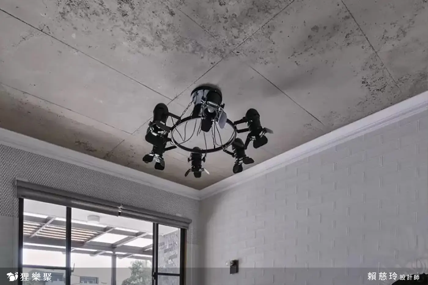 將棕色原木使用在天花板,呈現工業風的感覺,以及書櫃、穀倉門、窗簾盒、壁板等等,透過顏色的銜接,在多樣化的元素下仍保持一性,視覺上繽紛而不繁雜,而這種溫暖的色調也能帶來居家的安定感。裸露的天花板以及穀倉門(書房)可說是工業風非常具代表性的重點特色,再配上特殊造型的吊燈,風格立刻鮮明了起來。