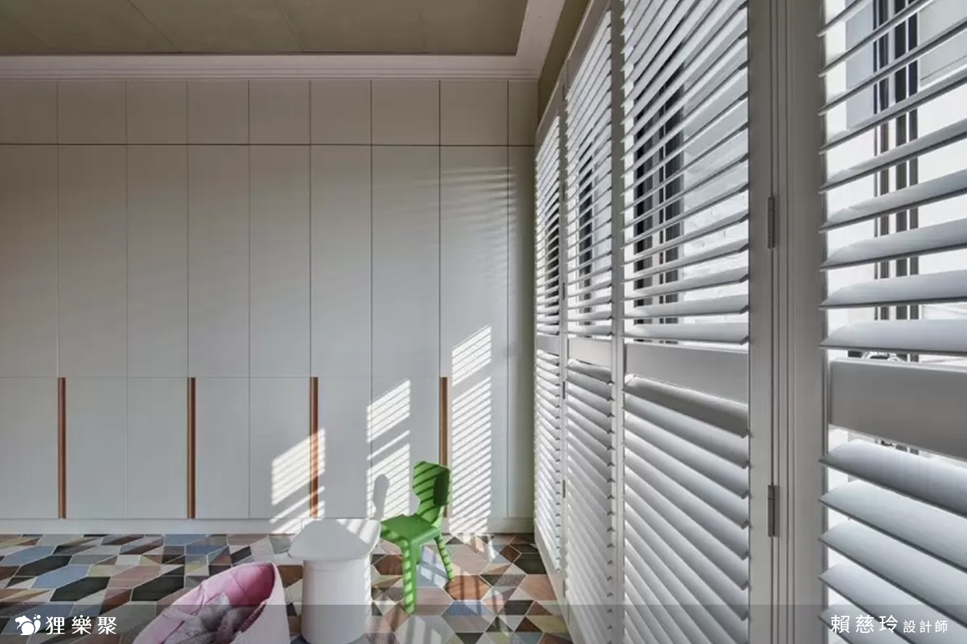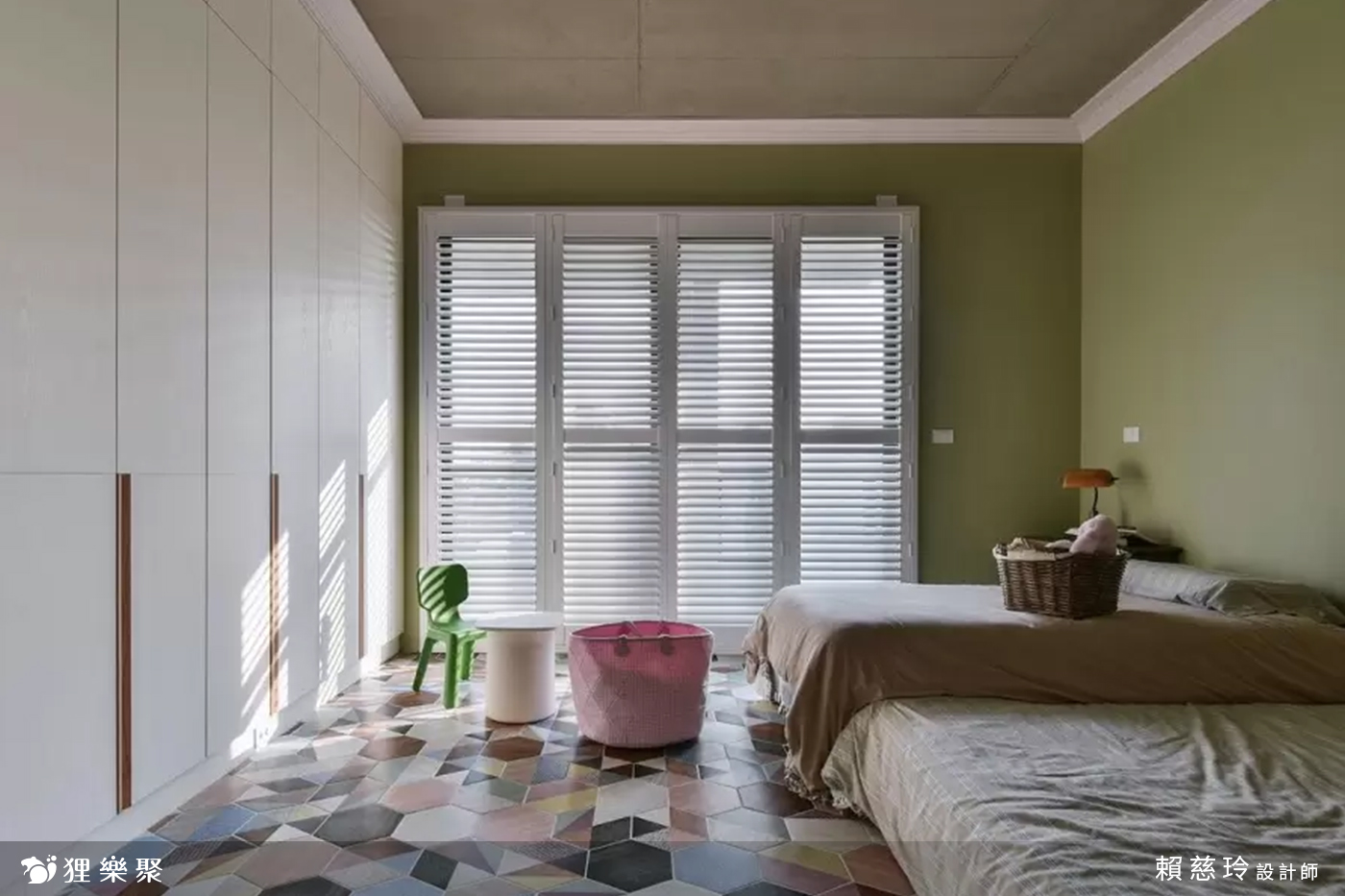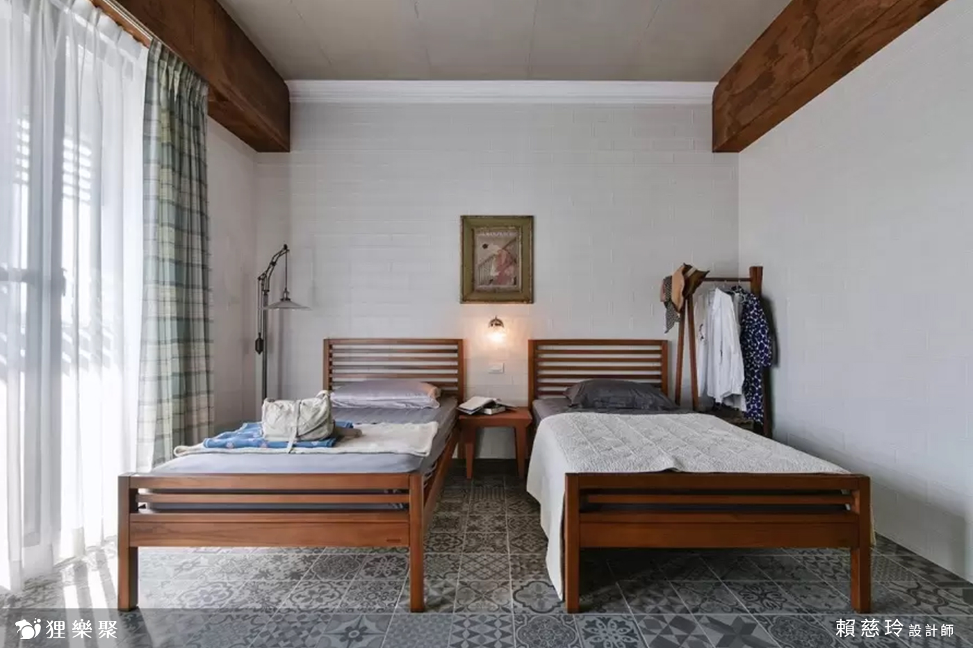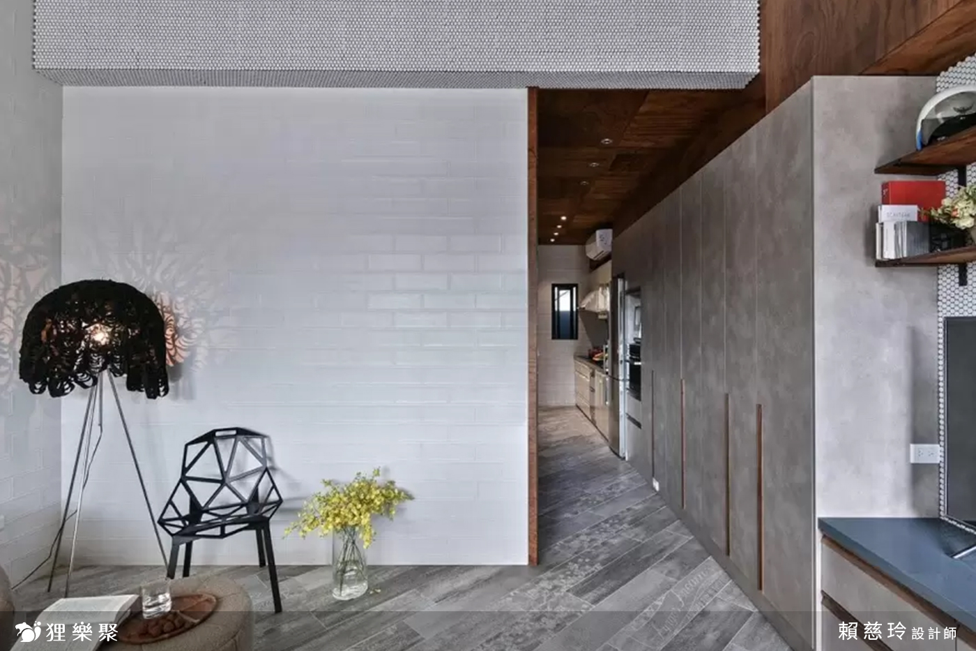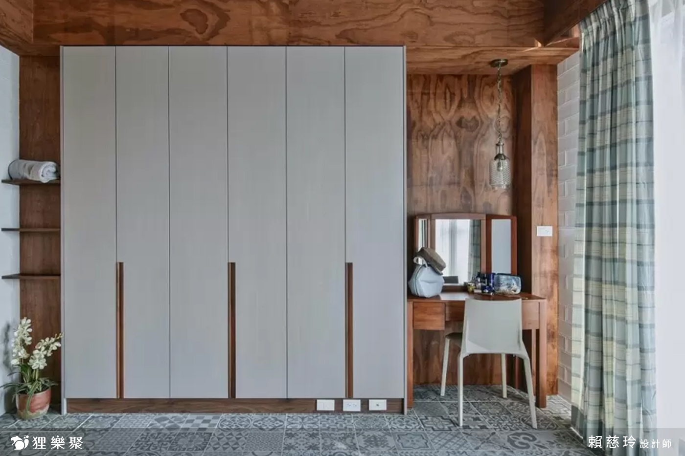 客廳和廚房的地磚部分選擇原始石材的花色,搭配牆壁上的白色復古磚,並且在客廳連接廚房的通道的系統櫃選用水泥質感的板材,營造出工業風的氛圍。在臥室的部分使用復古的花磚做為地磚,抑或是搭配美國石木百葉窗,打造每個房間的獨特風格。