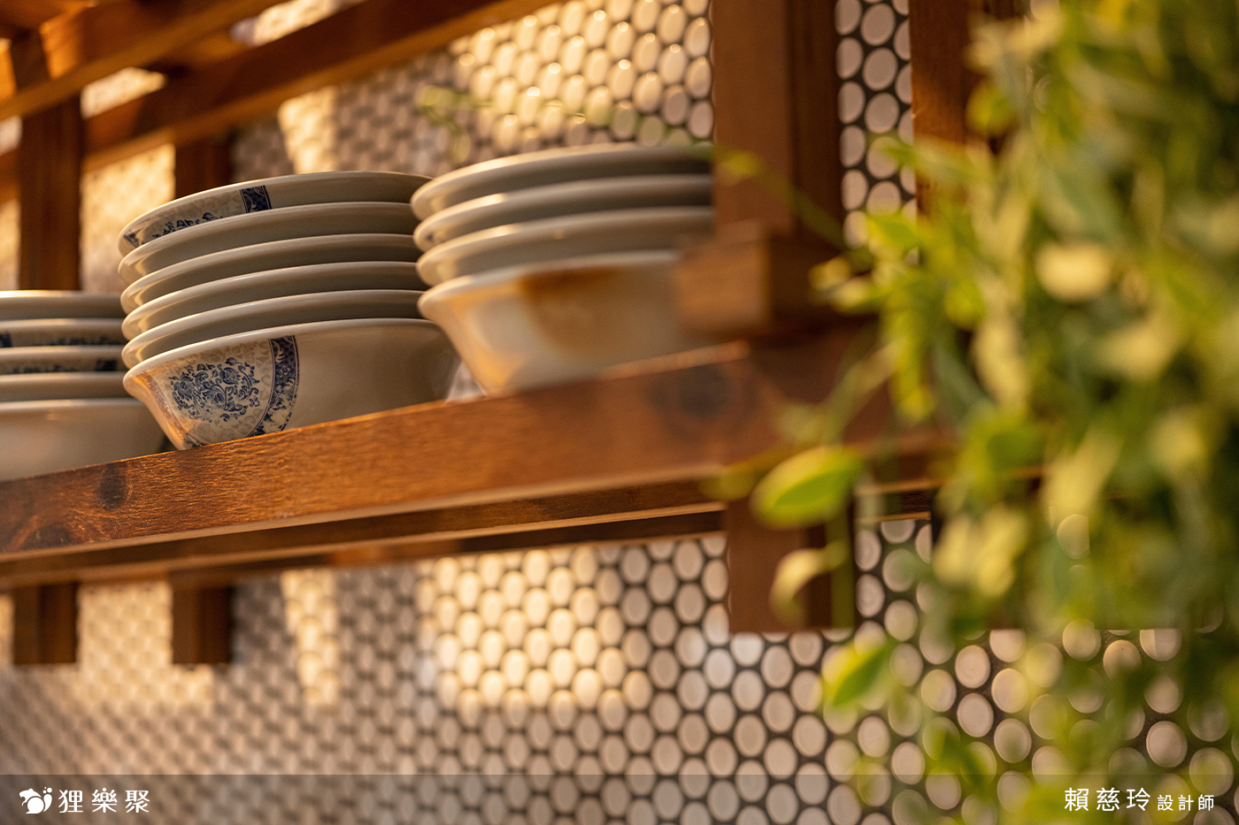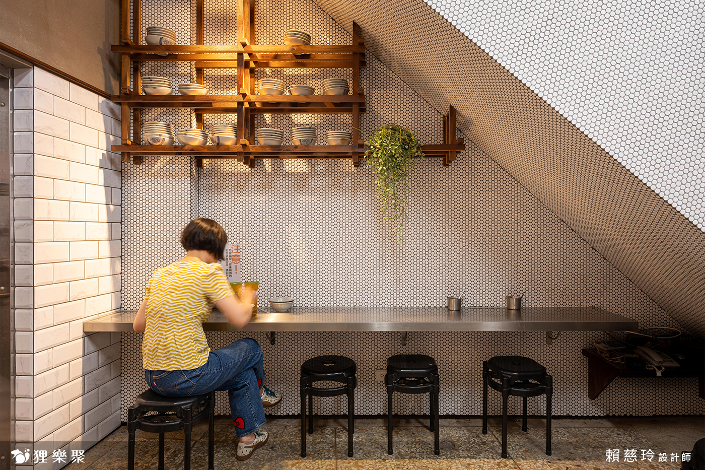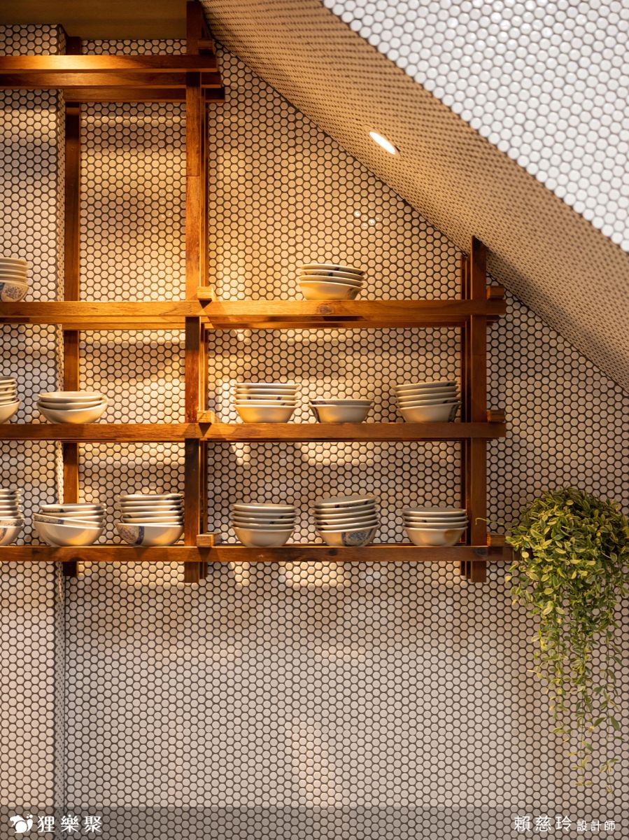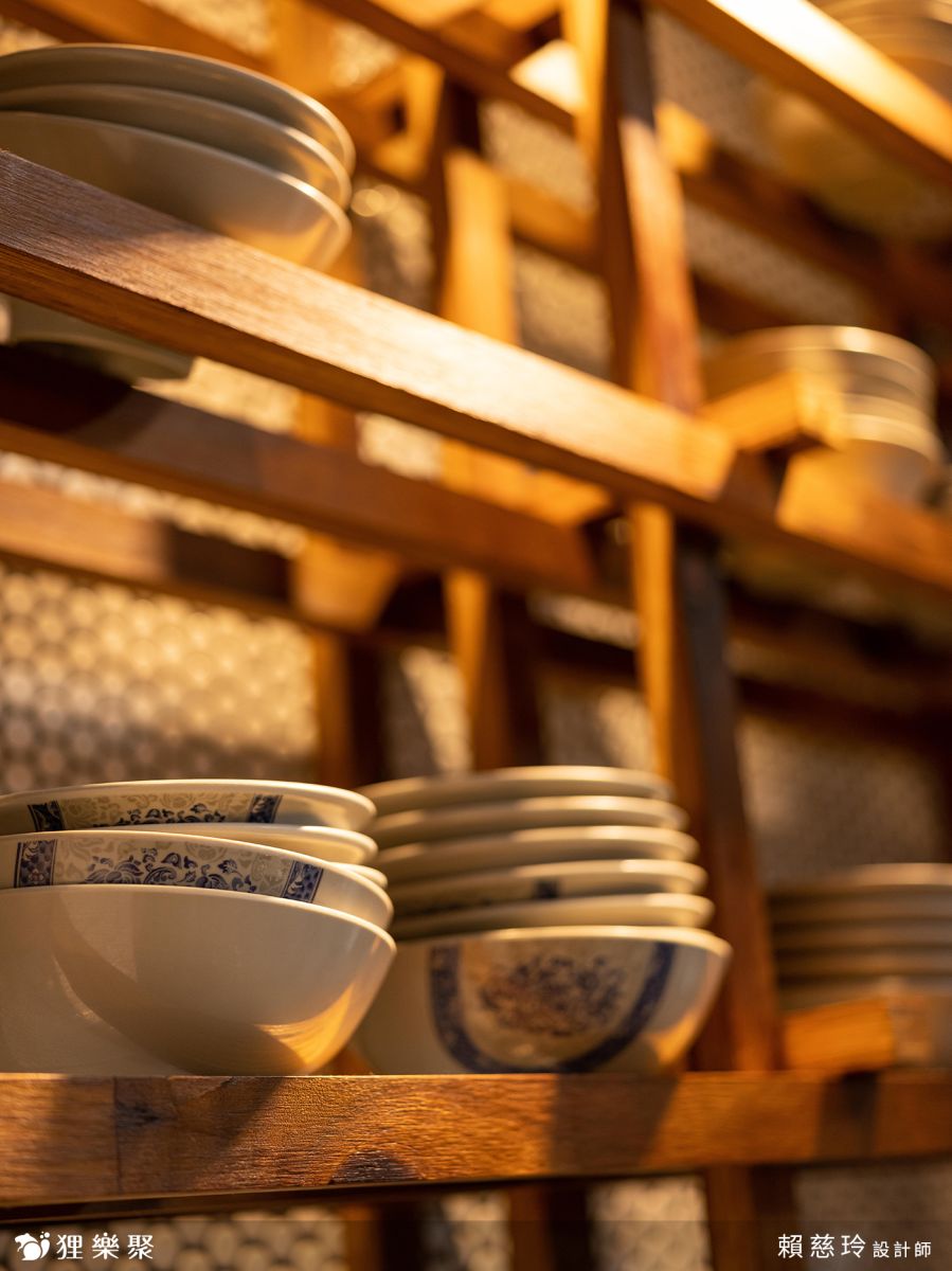 樓梯下的吧台用餐區,先拆除擺放雜物的紊亂隔間門牆後,以碳化角材堆砌出溫潤的木作結構,擺上復古的碗碟,將樓梯下的壓迫感修飾於無形,反之變身為熱門的拍照打卡處。