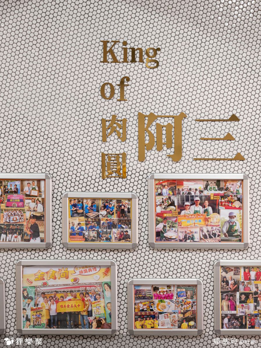 一進門暸然的主牆,排列著歷年所得的獎牌與獎盃,使用淺白石材紋路的地鐵磚包覆半牆高,上半部覆蓋防火防潮的木絲水泥板,另一面牆則搭配圓型馬賽克抹鐵灰縫,讓灰白輕工業風乍現!