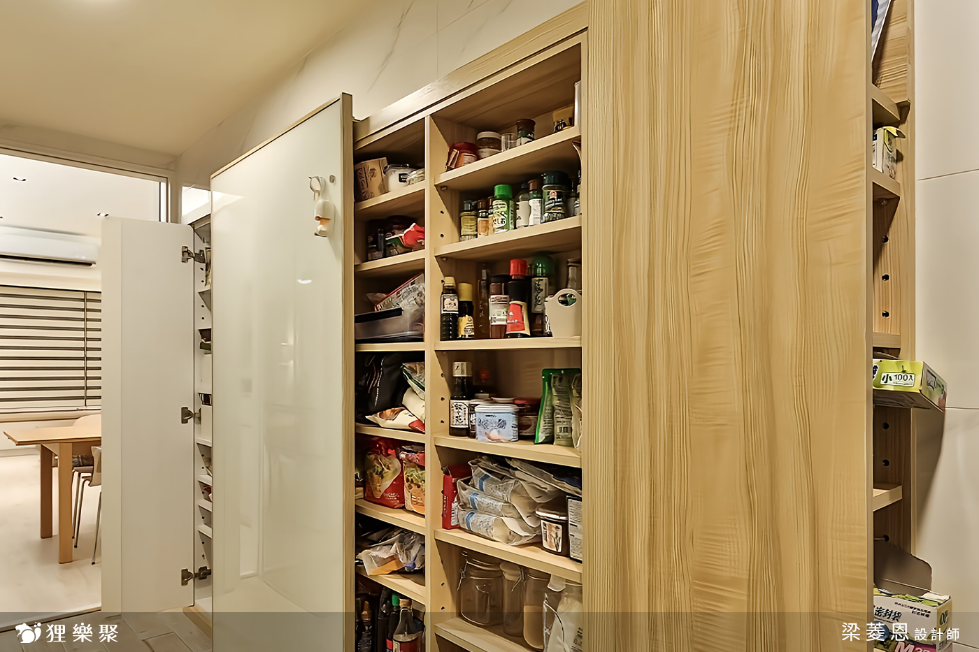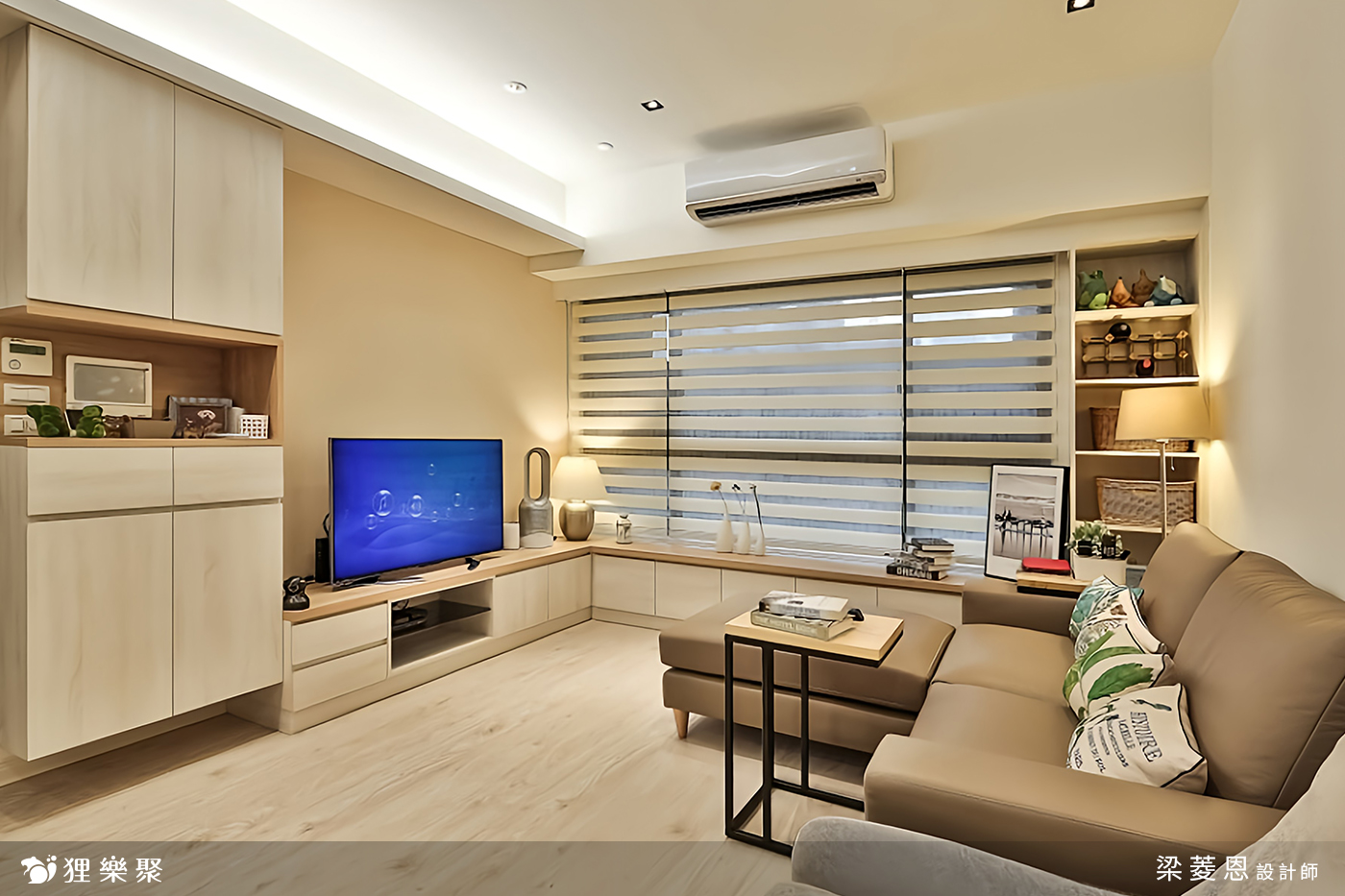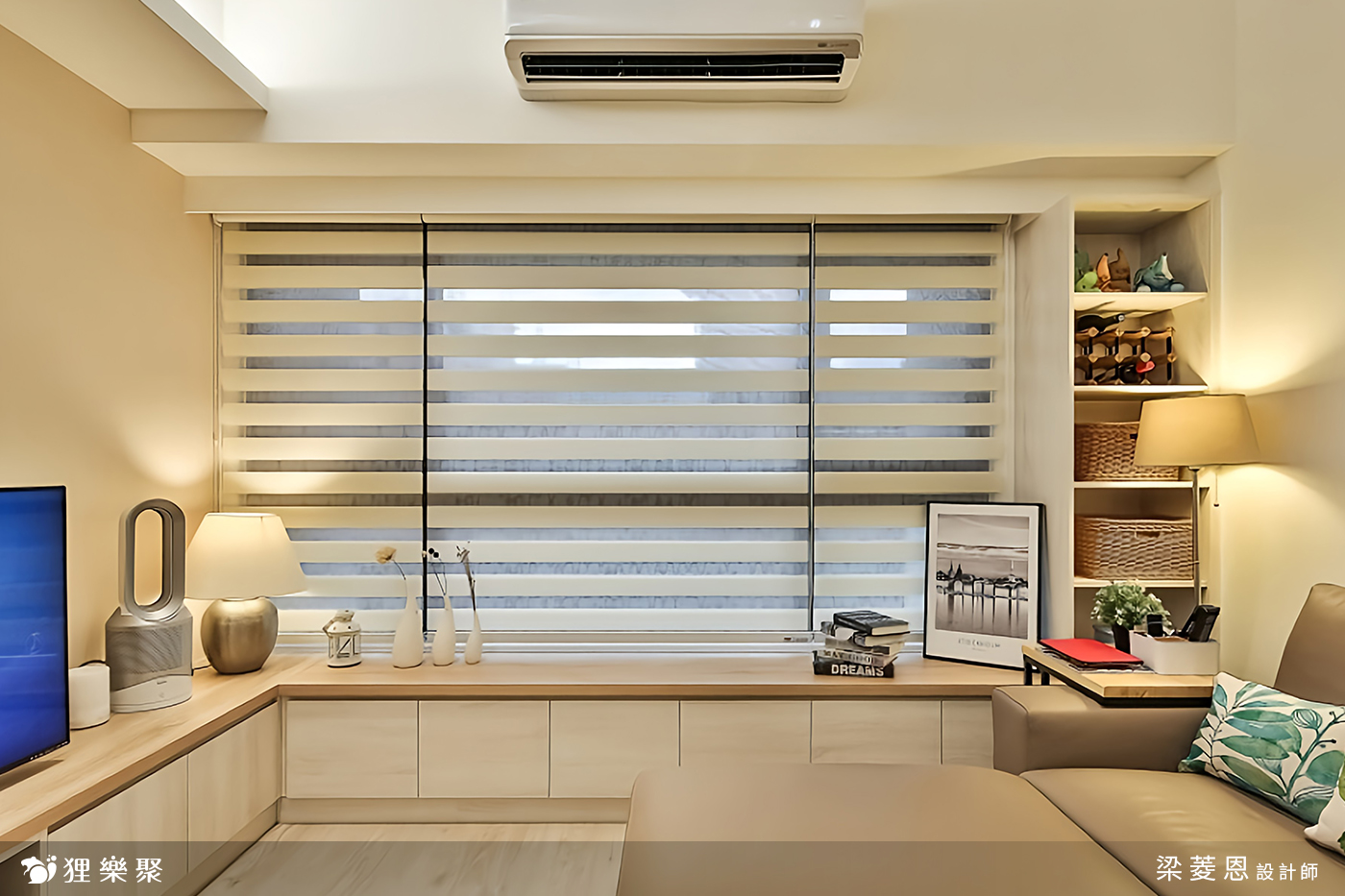 屋主需要大量的收納空間,在各個房間都設計了櫃子,再利用線條簡約的門板使雜物不外露,把小坪數的房子打造成大空間的錯覺,視覺上相當整潔之外,實際上的功能也不馬虎。客廳的收納區涵蓋玄關櫃以及電視櫃,另外在窗邊多設計了臥榻的區域,臥榻一向也是個擁有多功能的好物,除了擺放裝飾品、平時能夠在窗邊休憩之外,客人多的時候放個軟墊就多了許多位置,而臥榻底下的空間更是收納的好幫手。