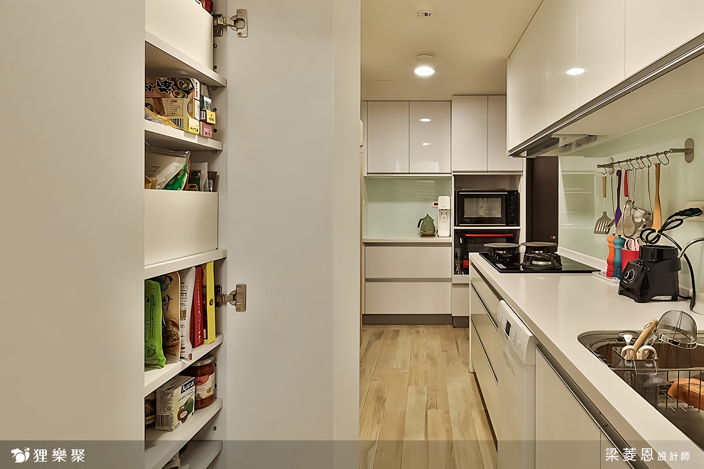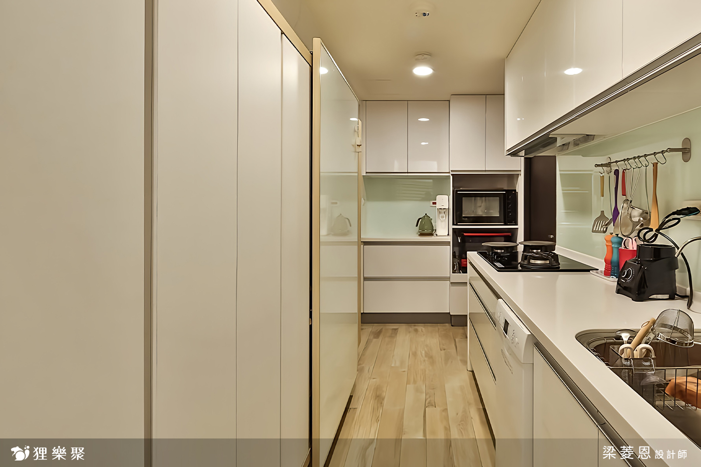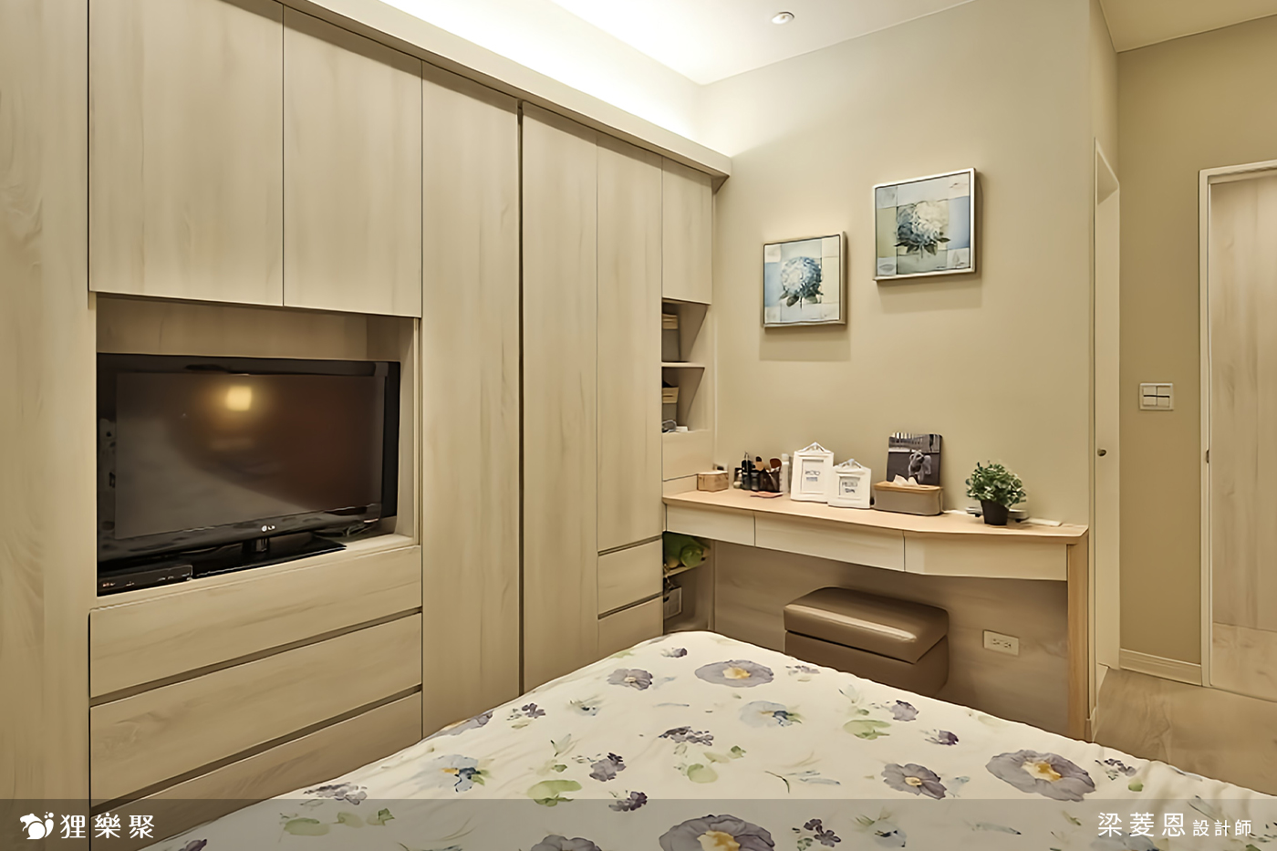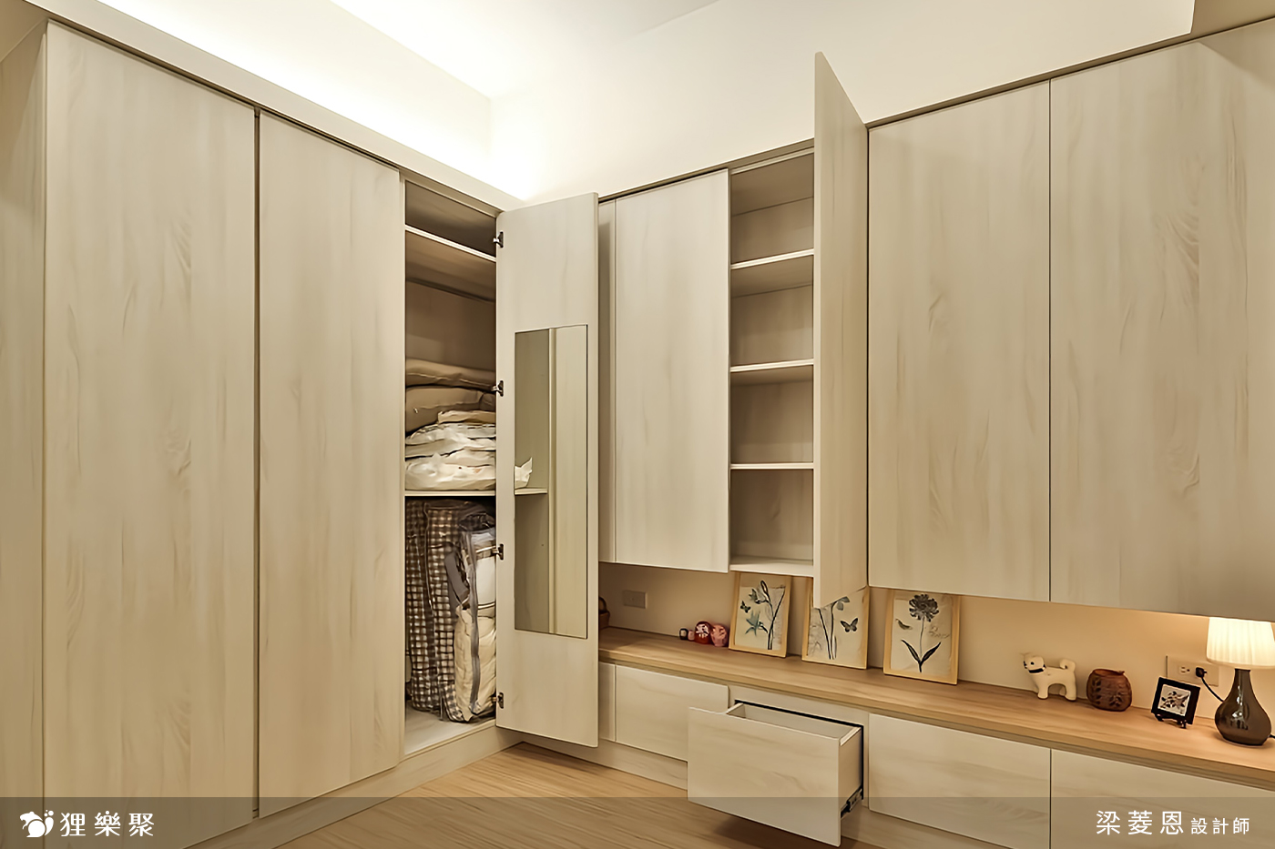 屋主需要大量的收納空間,在各個房間都設計了櫃子,再利用線條簡約的門板使雜物不外露,把小坪數的房子打造成大空間的錯覺,視覺上相當整潔之外,實際上的功能也不馬虎。客廳的收納區涵蓋玄關櫃以及電視櫃,另外在窗邊多設計了臥榻的區域,臥榻一向也是個擁有多功能的好物,除了擺放裝飾品、平時能夠在窗邊休憩之外,客人多的時候放個軟墊就多了許多位置,而臥榻底下的空間更是收納的好幫手。