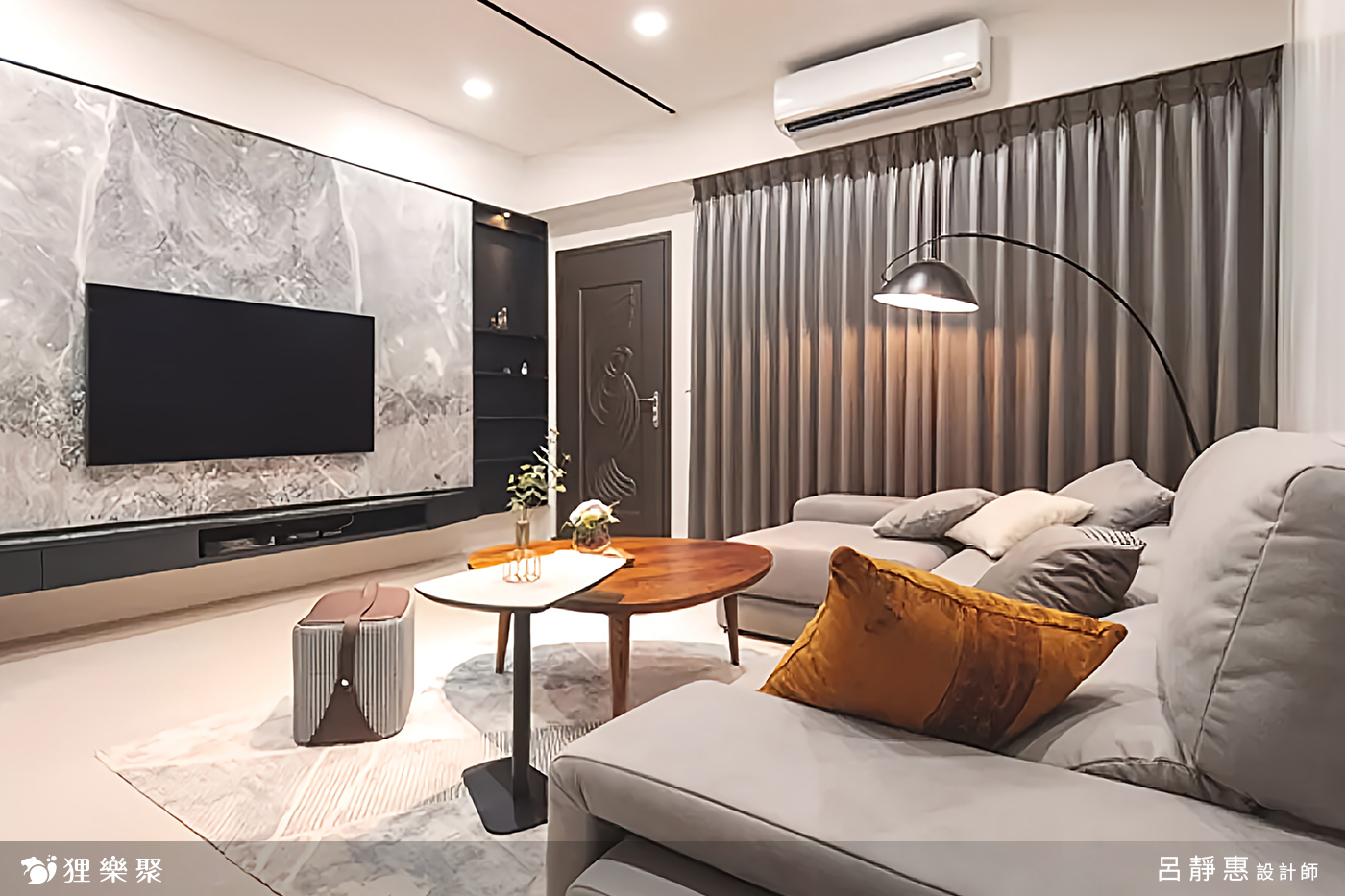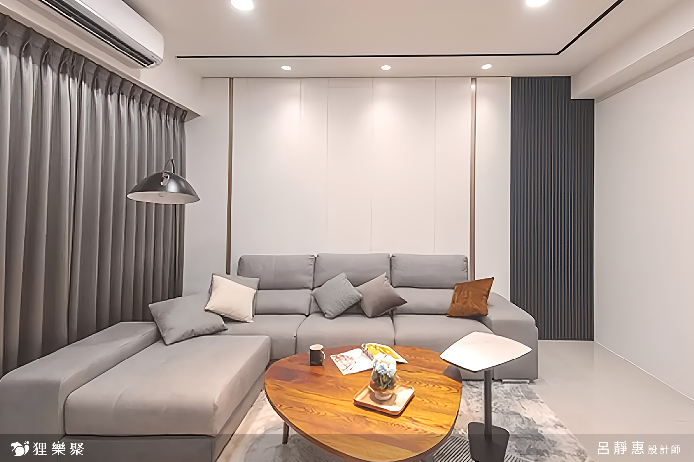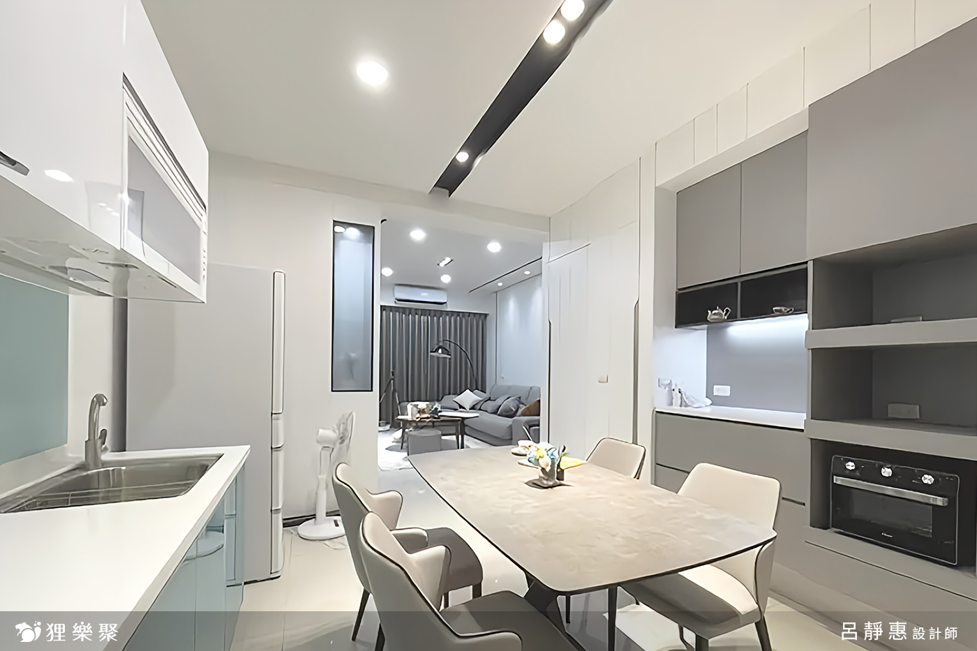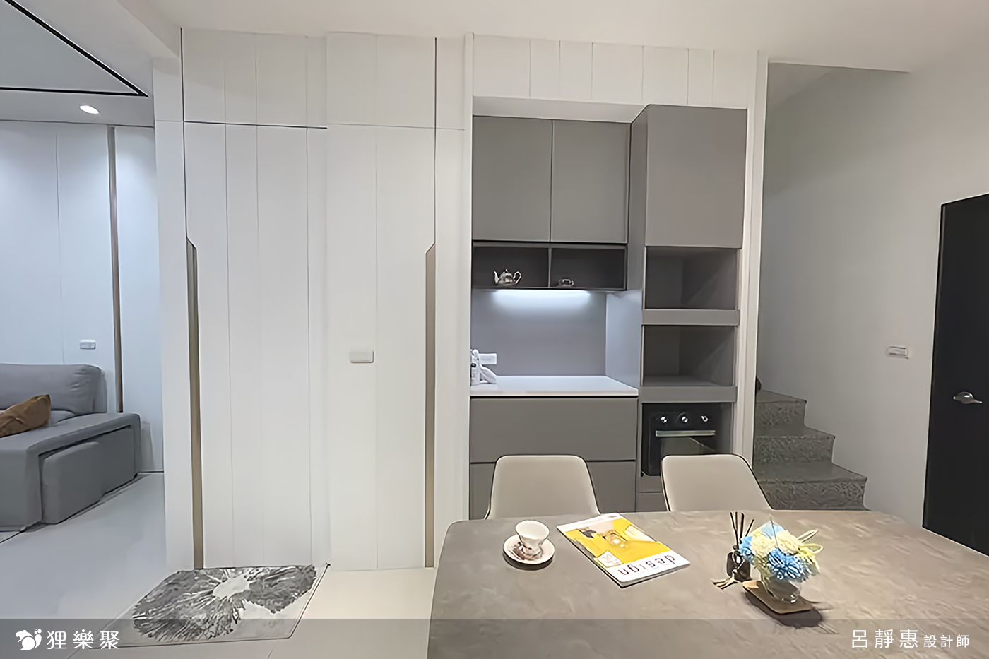 空間以現代極簡風格為主軸,運用石材元素營造沉靜且大氣的質感,並以灰階家具與軟件相互搭配,呈現出雍容而時尚的舒適氛圍。家飾巧妙點綴木紋,使空間更顯溫馨。大片白色牆面搭配對稱設計與木格柵板,展現優雅氣質。廚房則以黑、白、灰色塊構築,搭配消光黑色俐落線條勾勒輪廓,展現簡潔俐落的設計感。電器櫃旁設有通往浴廁的隱藏門,白色門片巧妙減少空間切割感,同時提升整體空間的通透與寬敞感。