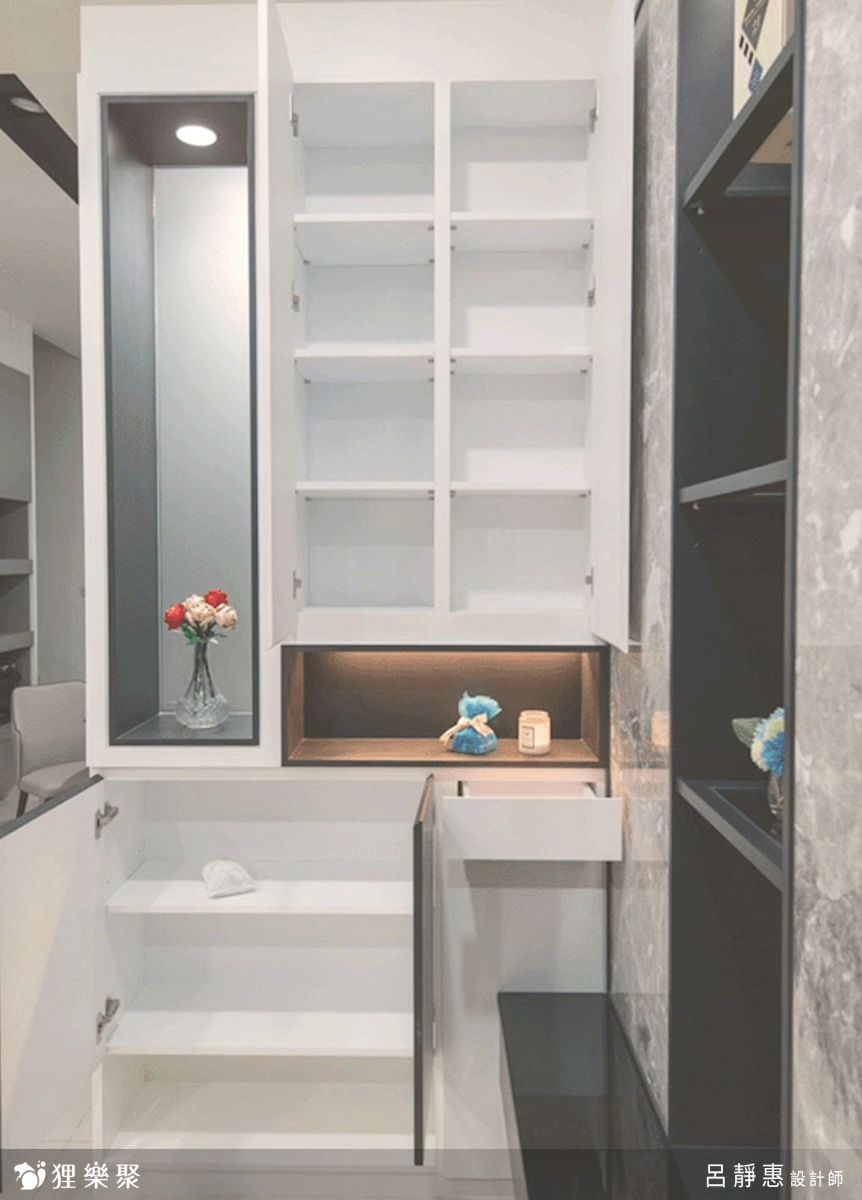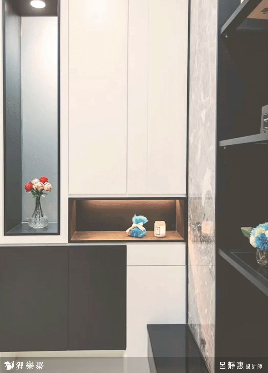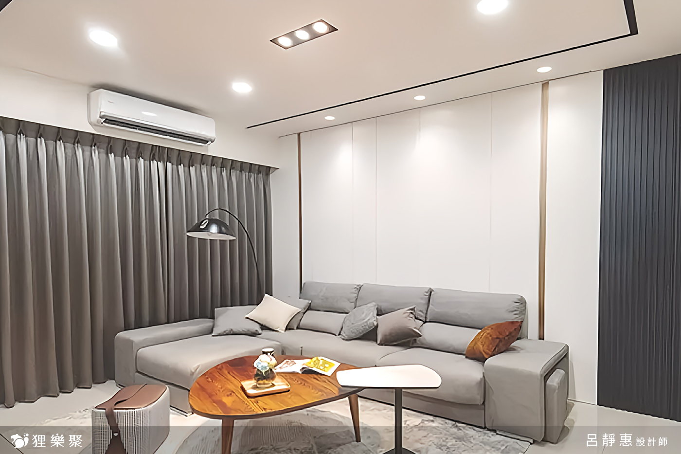 設計師以現代極簡風替業主做規劃,利用黑、白、灰色塊作為空間主調,並搭配流暢消光黑色來勾勒俐落的線條,讓空間感呈現出簡潔時尚的風味,輔以灰階色階家具及軟件搭配,並在局部選擇隱藏門設計,巧妙地為空間做修飾,顯現雍容且不失時尚的氛圍。