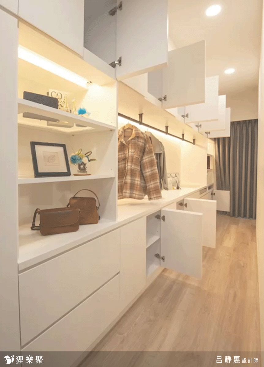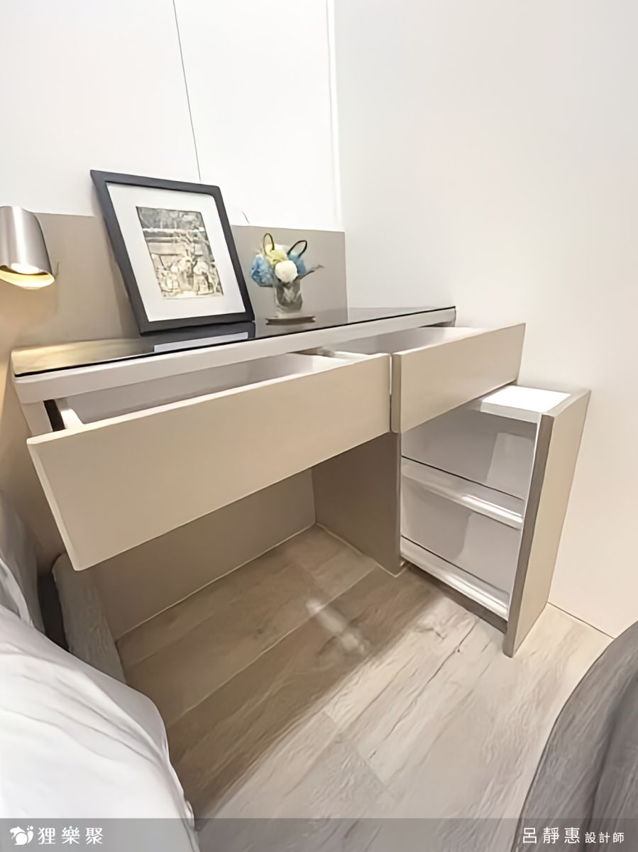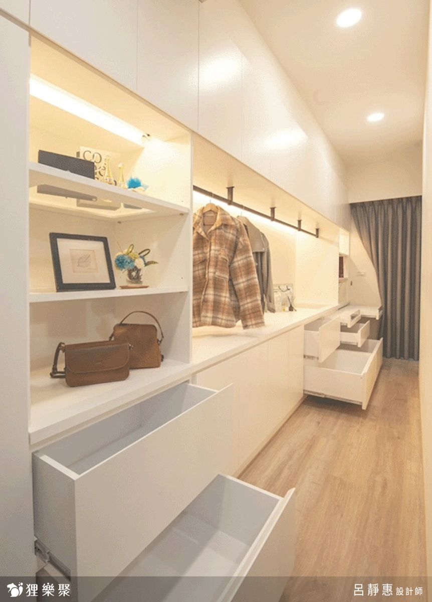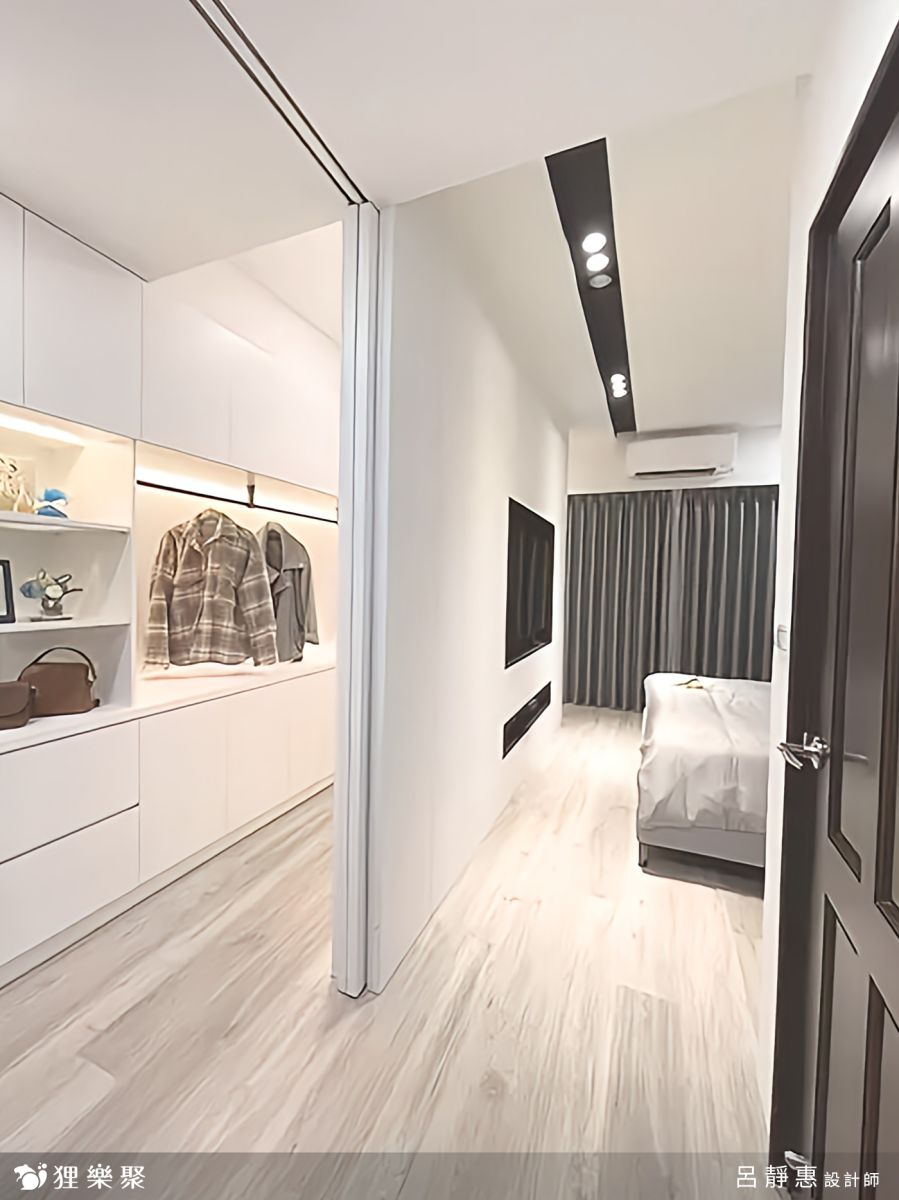 二樓主臥室採用暖色木地板打造溫暖的居家空間,而由於空間有限,臥室主牆利用大量白色搭配亮面暖色鏡面線條來擴大 空間效果,並用木紋床頭背板來完美呈現女主人心目中的大地色系臥室。以功能為考量,化妝台結合在床頭側邊,功能與收納同時並存。而顧慮風水上門對門的問題,更衣室規劃隱藏門來區隔空間,而擁有大量儲物空間的開放式衣櫃則搭配燈 帶光源,彷彿置身專櫃一般。