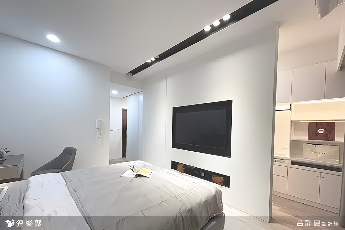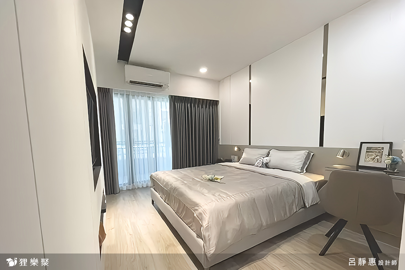 主臥室以暖色木地板搭配大地色木皮,並運用帶有反光效果的琥珀鏡面,營造出低調中帶有高貴氣息的氛圍。電視牆以黑白塊體分割設計,呈現塊體堆疊的俐落懸空感,展現現代風格的精緻質感。化妝台巧妙融入空間,滿足業主對化妝品收納的實用需求。隔間設計劃分出主臥與更衣室,使動線更清晰,空間感更明確。更衣室採用開放式設計,結合適當燈源配置,使整體空間顯得更加寬敞大氣。