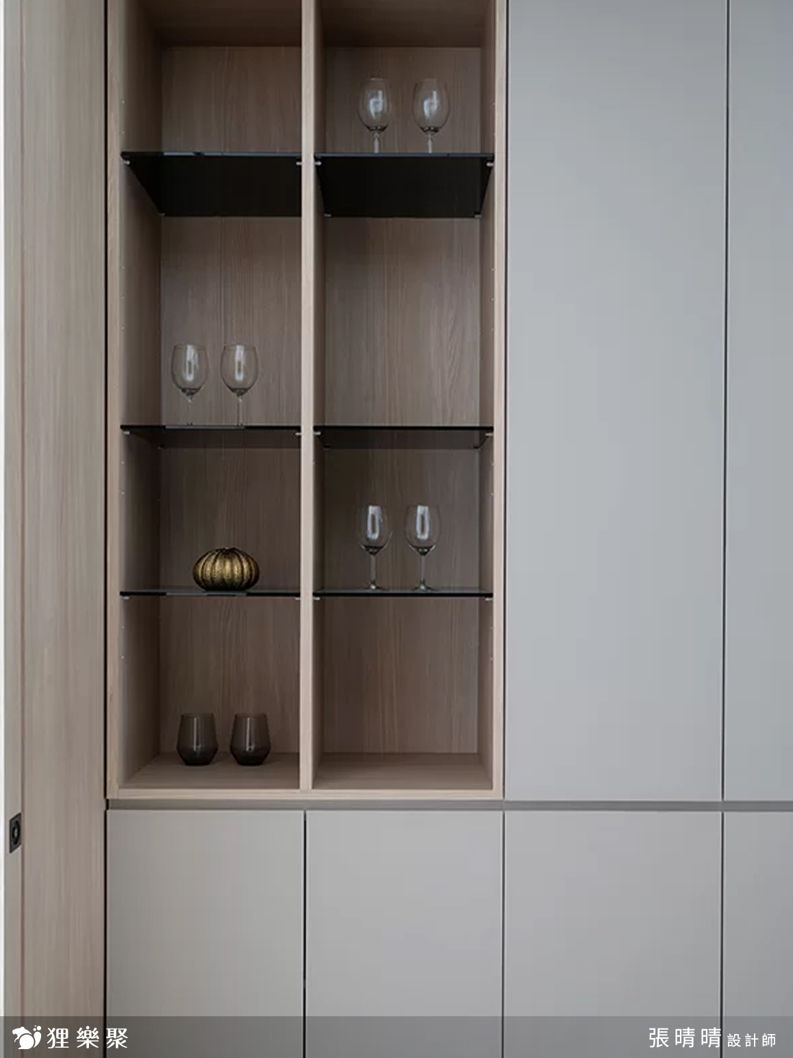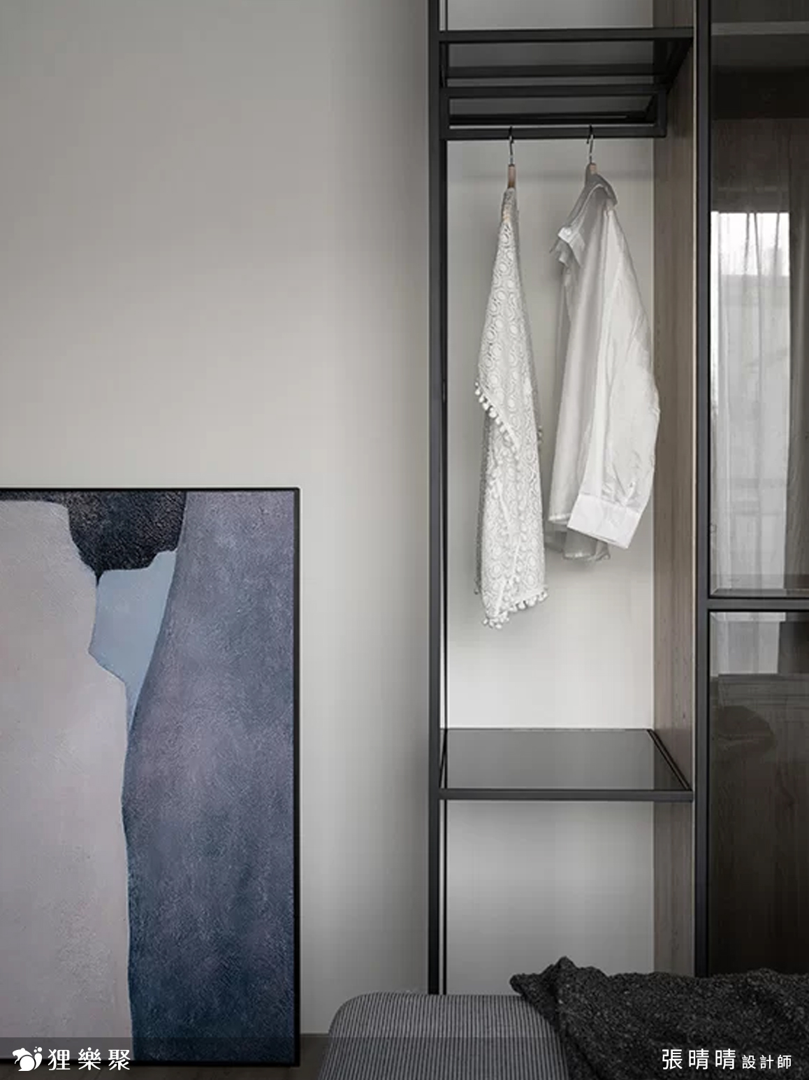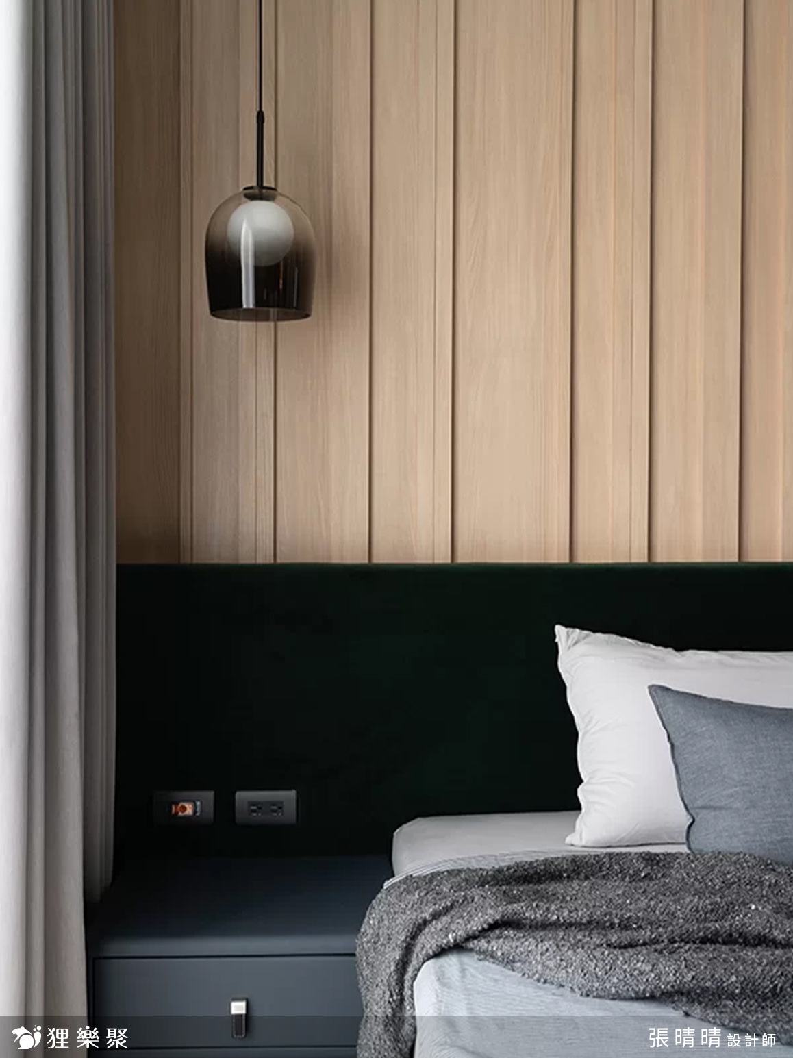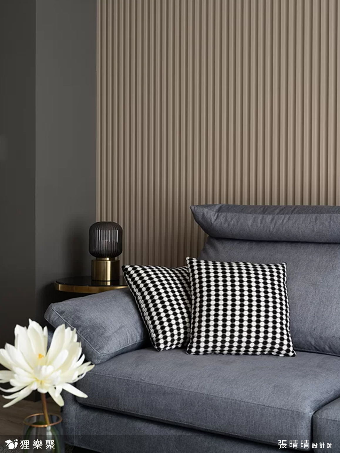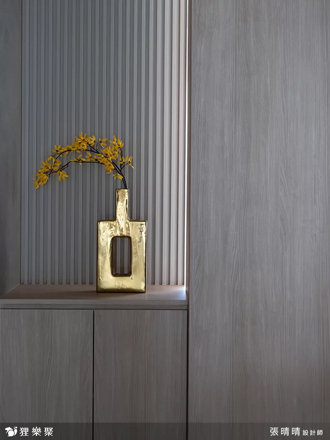 格柵設計是日式風格中常見的元素,整齊排列的格柵能帶來無限延伸的視覺感,也為空間創造出靜謐的氛圍,設計師利用格柵牆設計做為客廳的背景,主臥的床頭主牆和端景櫃的背牆也都利用相似的設計手法,呼應著公共空間的格柵設計,提升整個設計的完整性。