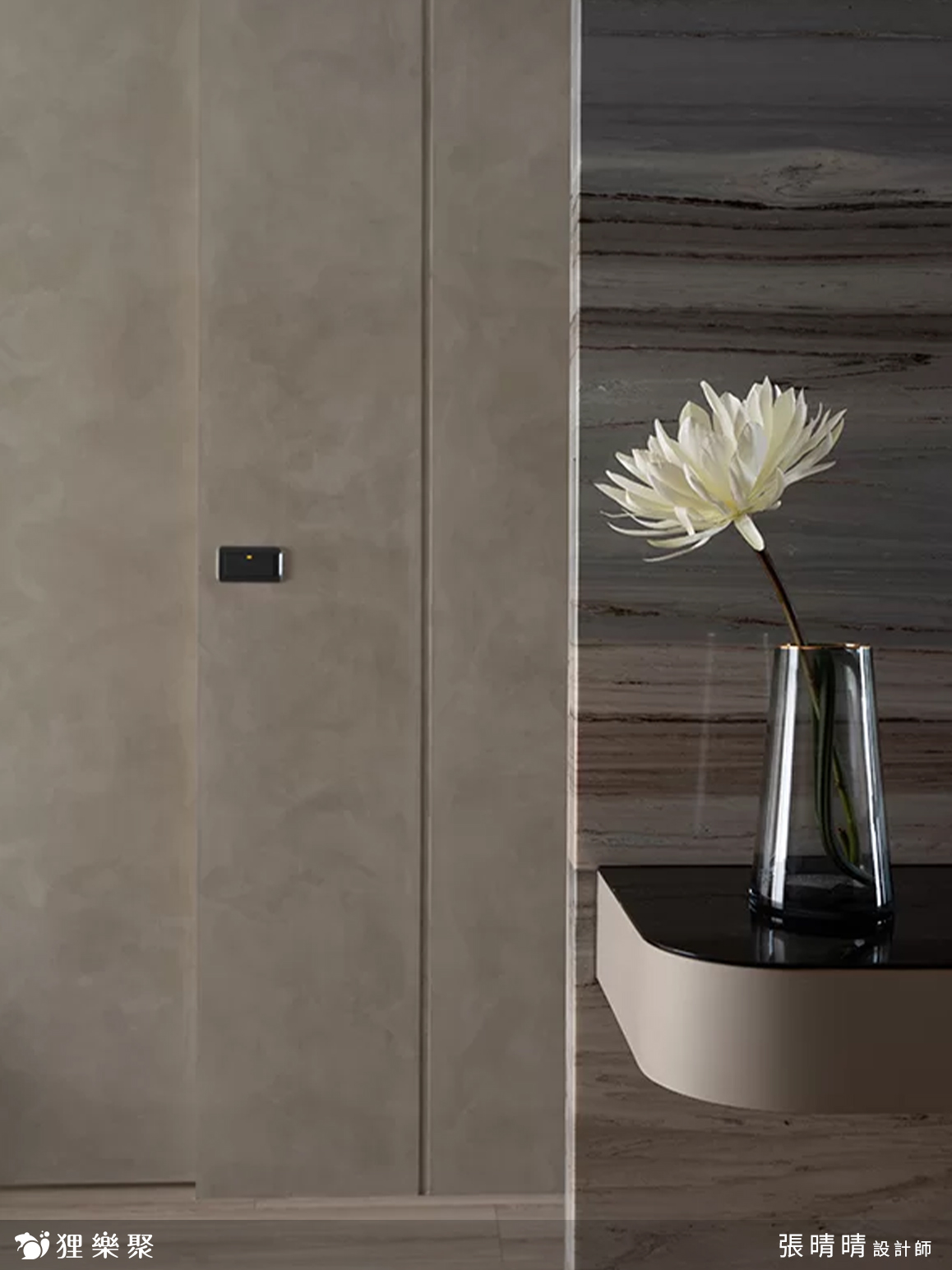 一般常見的電視牆設計大多為(仿)清水模、(仿)石材或油漆跳色等等,這個案例則是做整面的大理石電視牆面,這面電視牆設計的特別之處在於紋路帶了淡淡的藍色和淺咖啡色,為這個簡約優雅的空間帶來一些柔軟的氣息,而除了色調非純黑白較為少見之外,常見的大理石電視牆面多為斜紋,案例中的橫向紋路牆面則創造出平衡、穩定的氛圍。延伸閱讀:<< 裝潢設計費用又爆了?學會預算分配變身成裝修精算師 >>