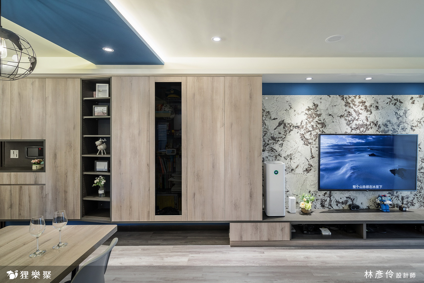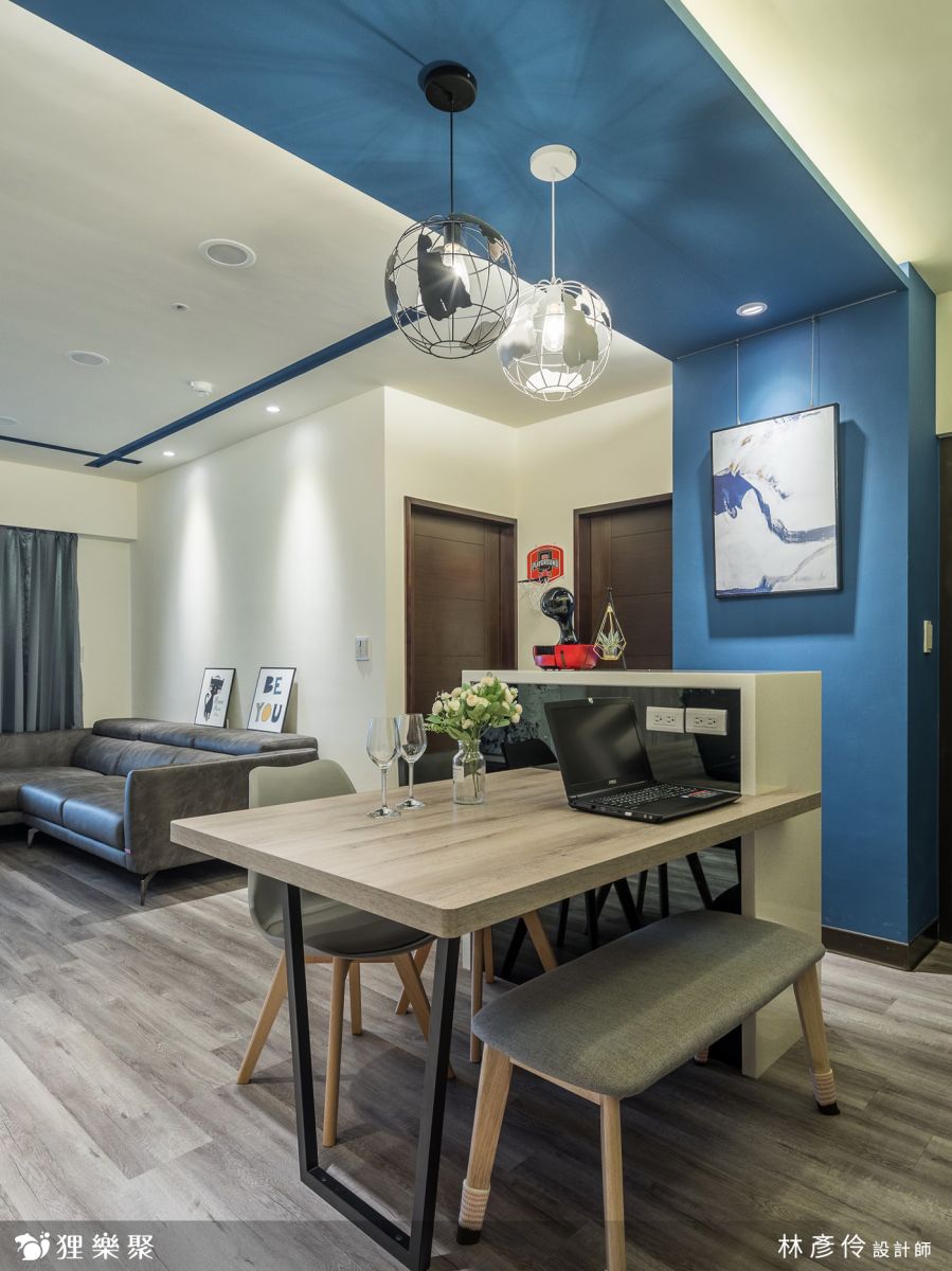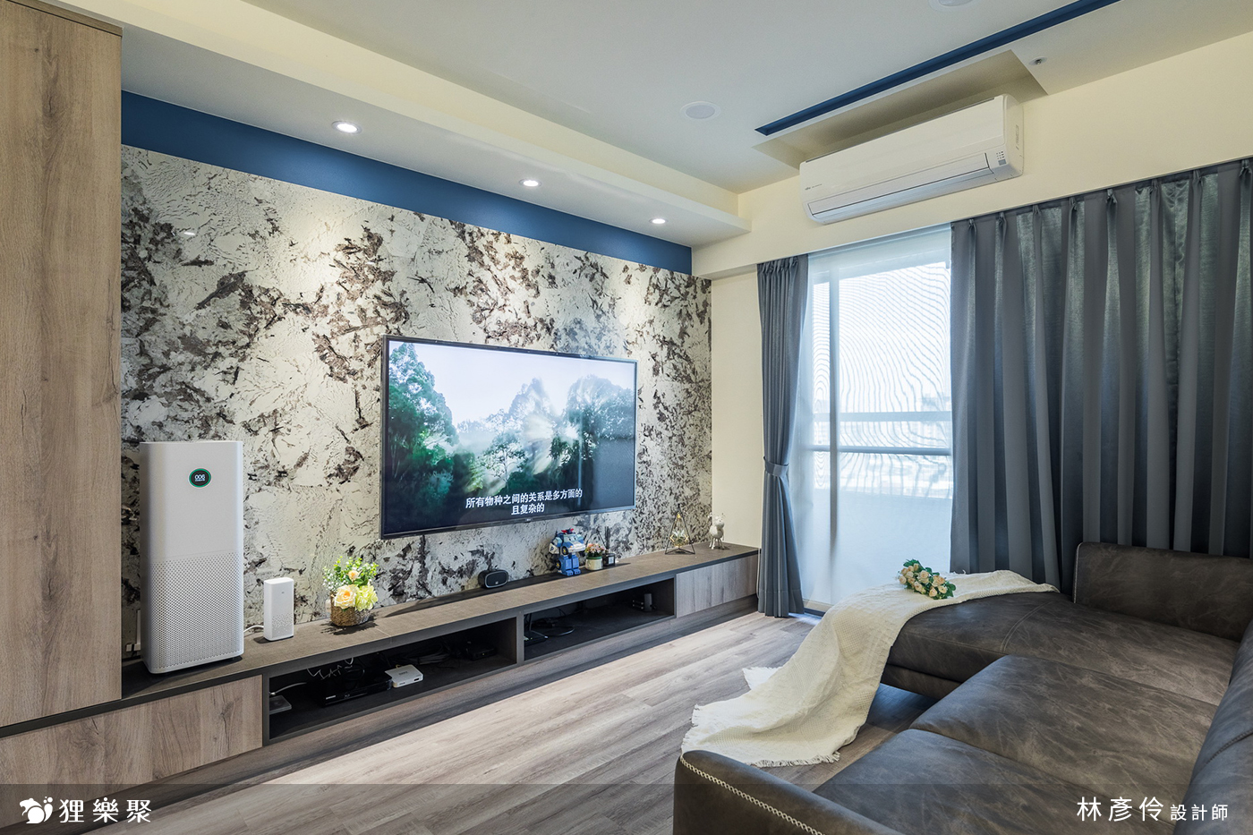 在公共空間選擇寧靜的深藍色做油漆跳色,冷調質感更凸顯現代輕時尚的氣息;而臥房的油漆跳色則選用淡粉色,相比之下是一個能夠好好放鬆、適合休憩的空間。電視主牆選擇石紋的壁紙樣式,營造出隱隱的奢華感,裝潢時若不想使用真正的大理石,市面上也有相當多壁紙樣式可提供選購。
