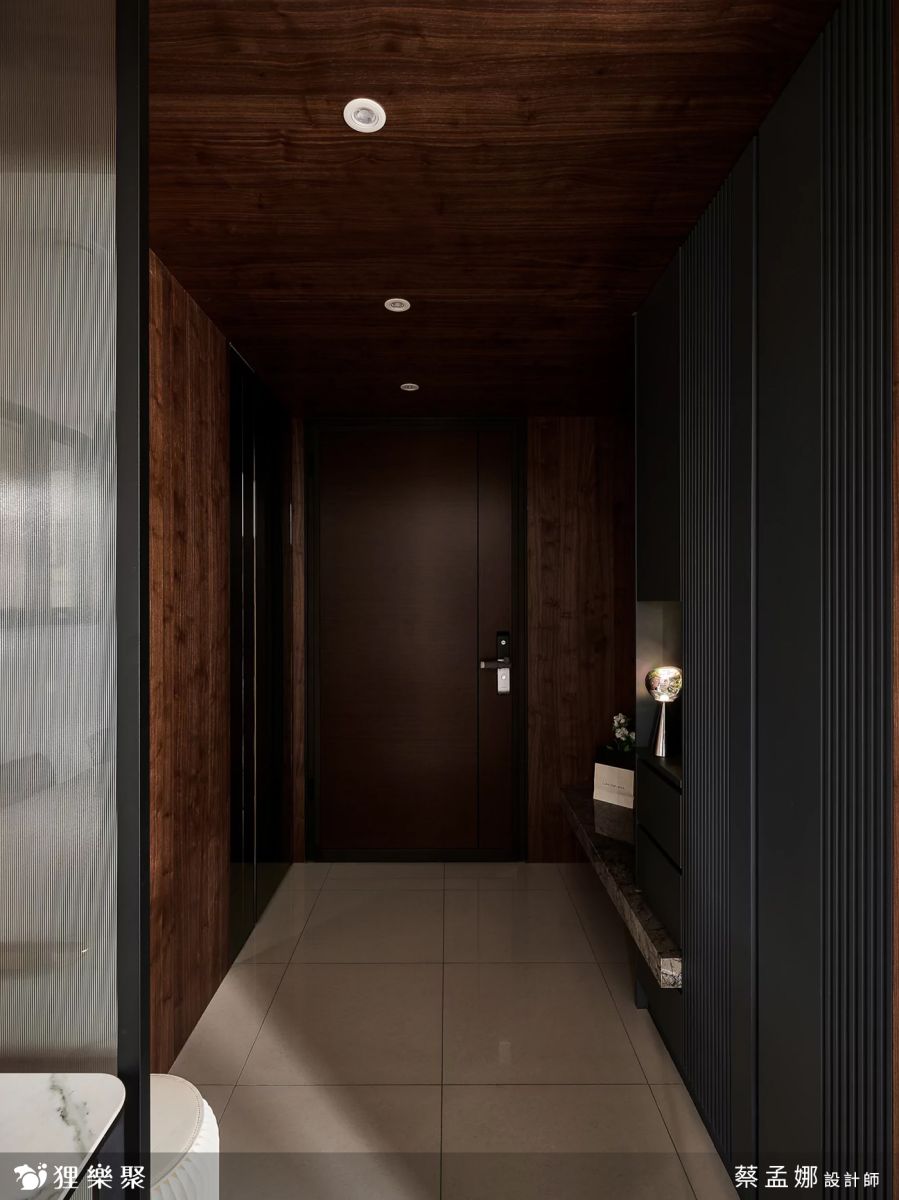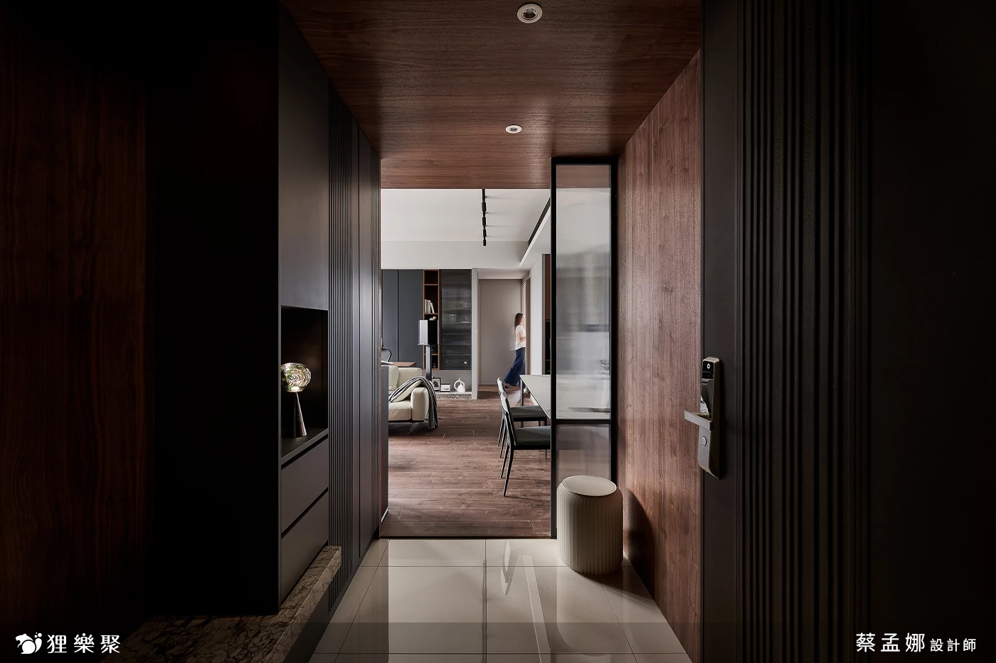 玄關處以沈穩的木質調為基底,牆面選用帶有細緻紋理的木元素,一側規劃了灰調的鞋櫃與收納櫃,營造出溫暖且高雅的迎賓氛圍。
