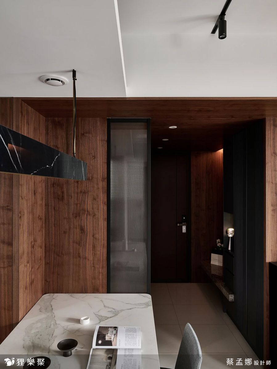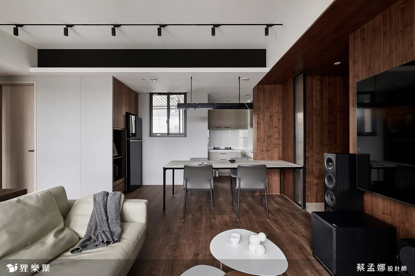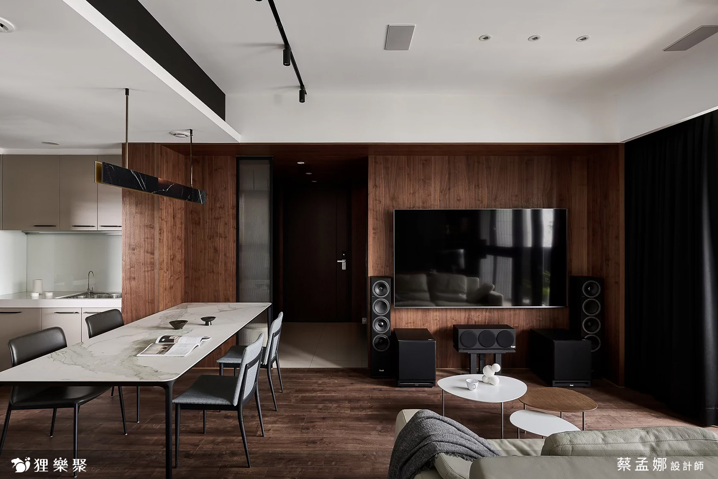 步入客餐廳,開闊的空間中延續著木質的主調,大面積的深色木地板與電視牆相呼應,使整體散發沈穩氛圍,搭配淺色沙發、簡約的茶几與餐桌,使空間呈現低調而不失品味的氣息。深木色的電視牆後方配置了隱藏線槽,能輕鬆的將屋主的視聽設備線材收納其中,讓視覺更加整潔。餐廳則以一張長型石板餐桌為核心,搭配深色餐椅,為空間增添層次,襯上質感滿分的金屬吊燈,提升用餐氛圍,圍塑出沉穩又舒適的簡約風裝潢小宅。